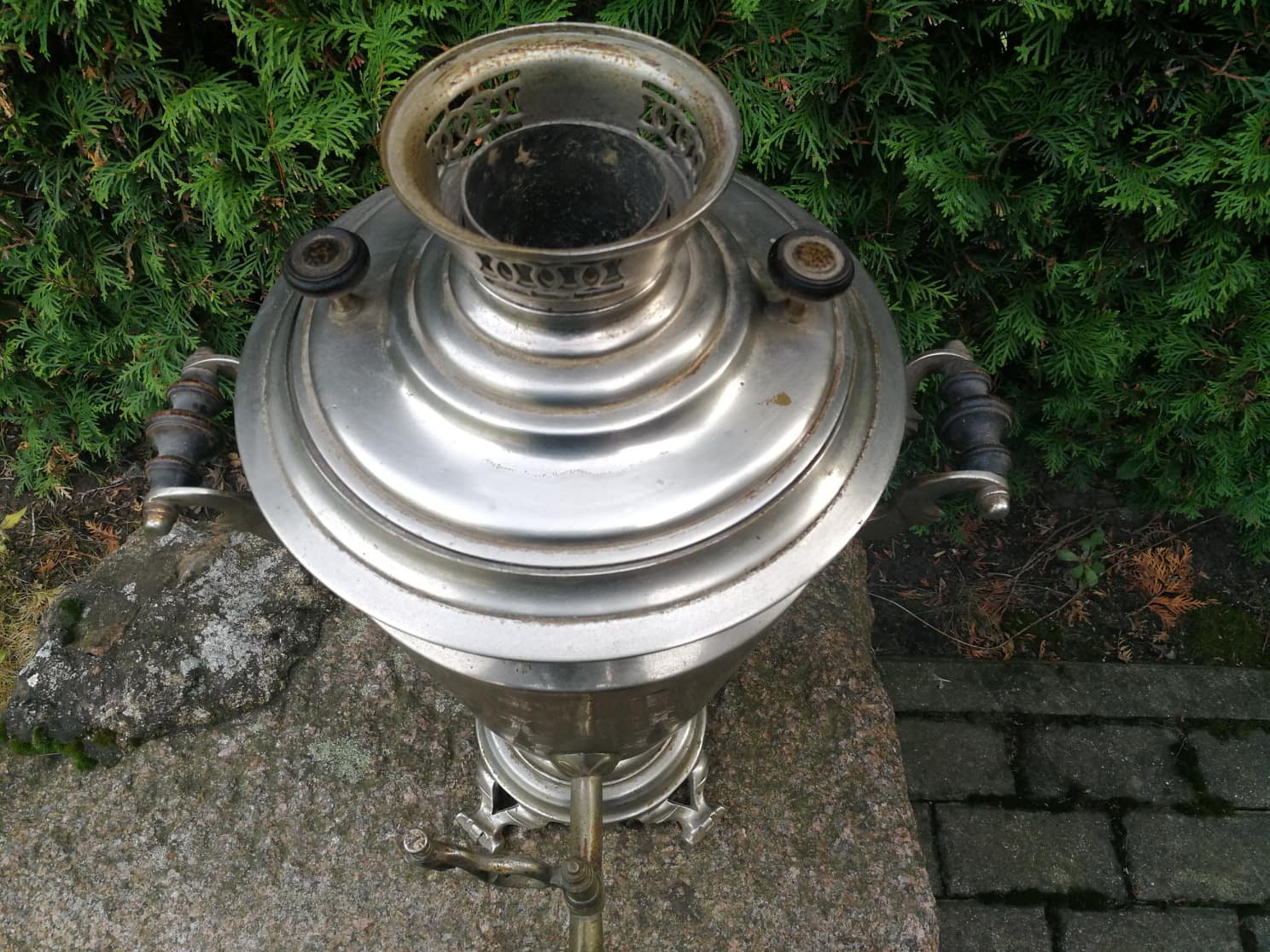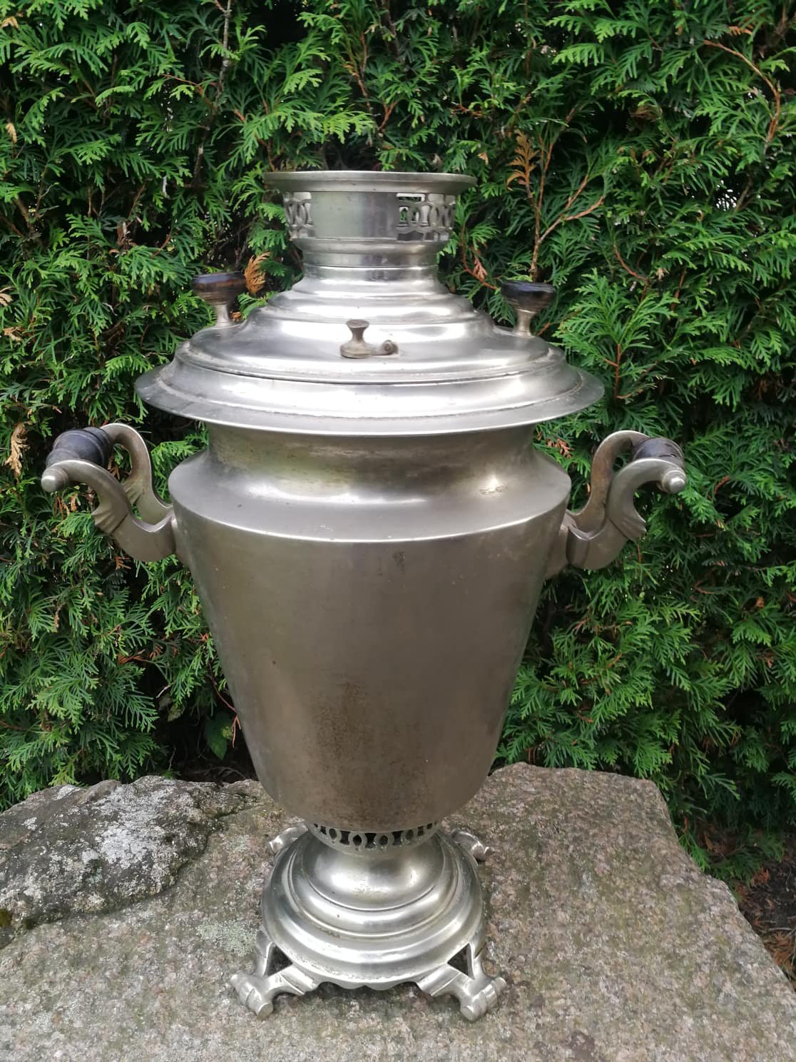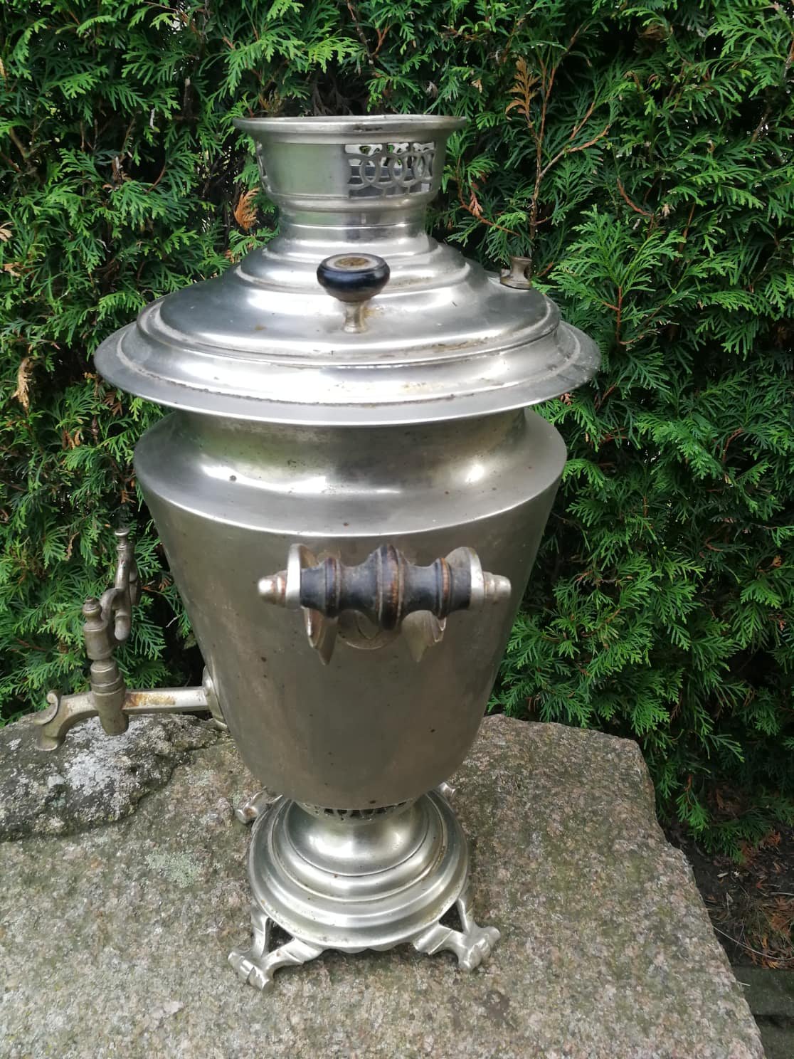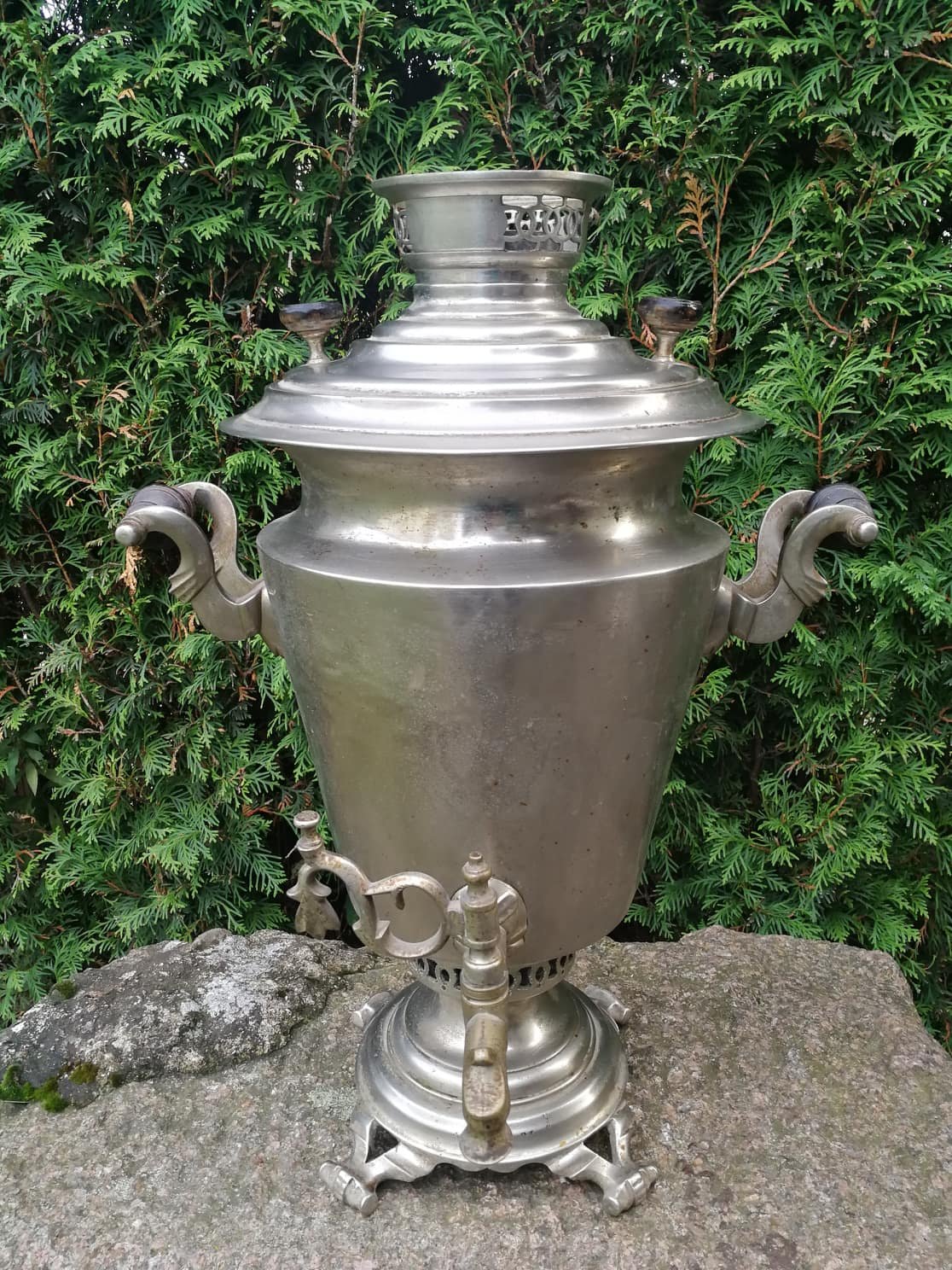 Samovaras didelis, Rusijos imperijos caro laikų. Visos detalės originalios, nieko netrūksta. Aukštis 57 cm., plotis 43 cm. Svoris 8,2 kg. Kaina 485