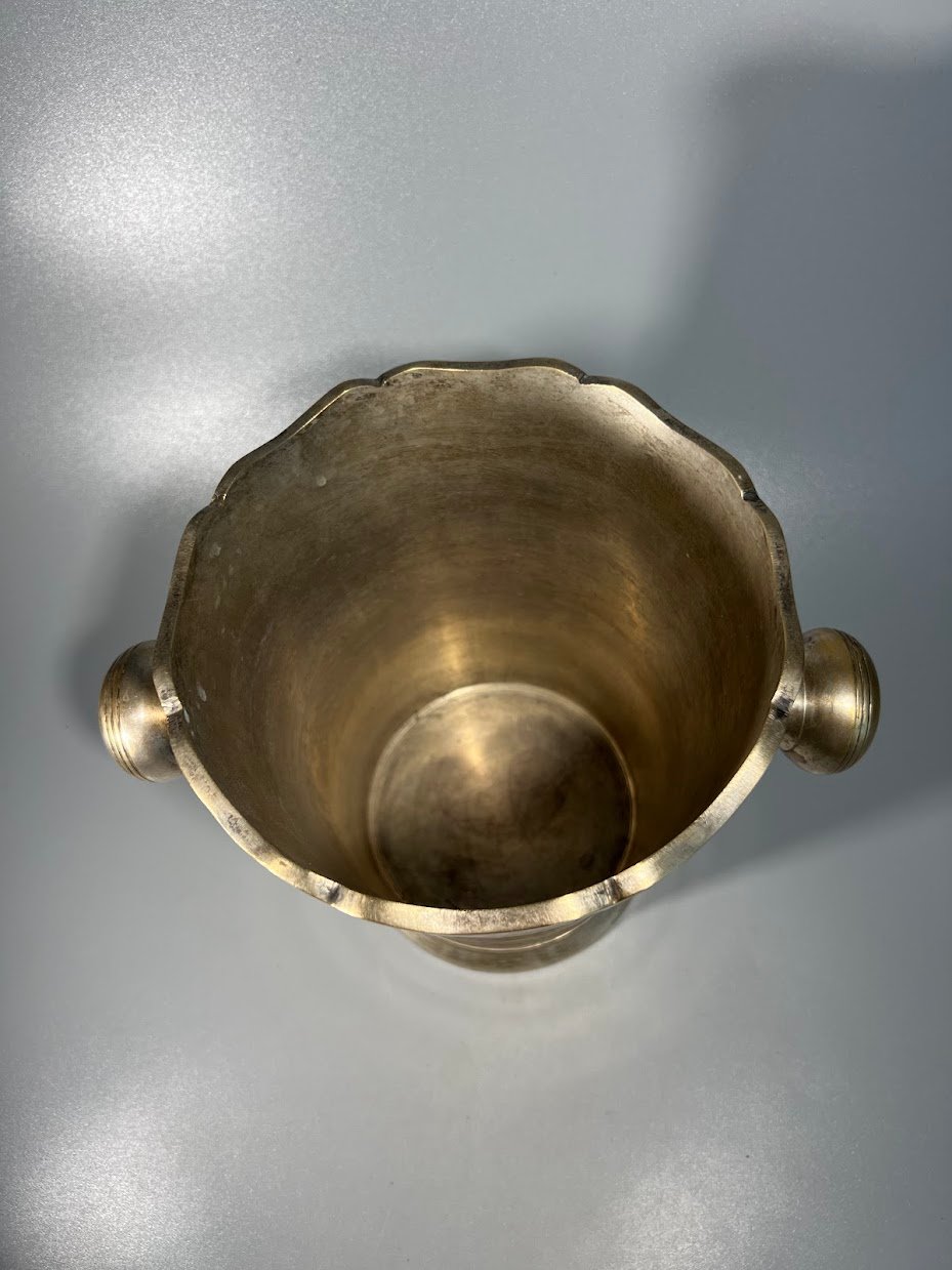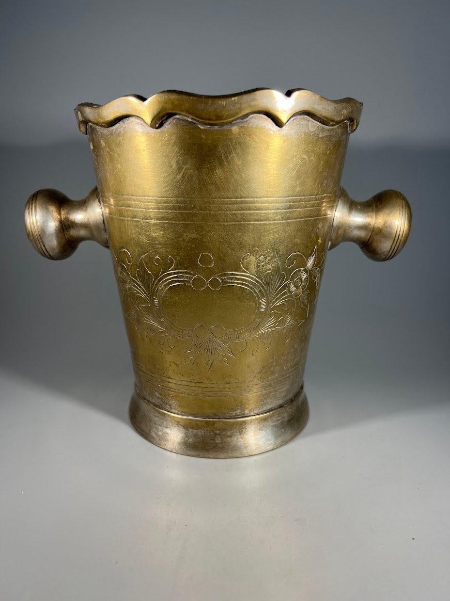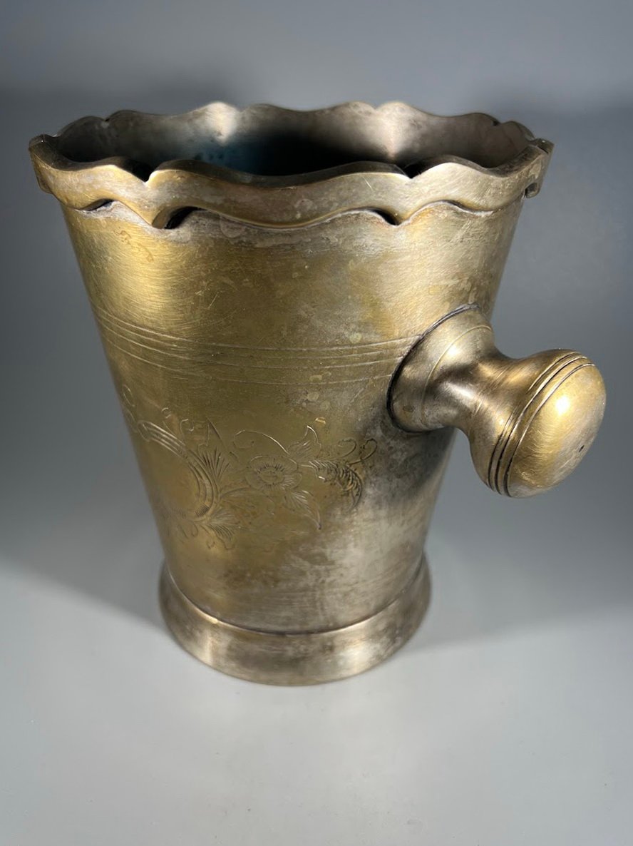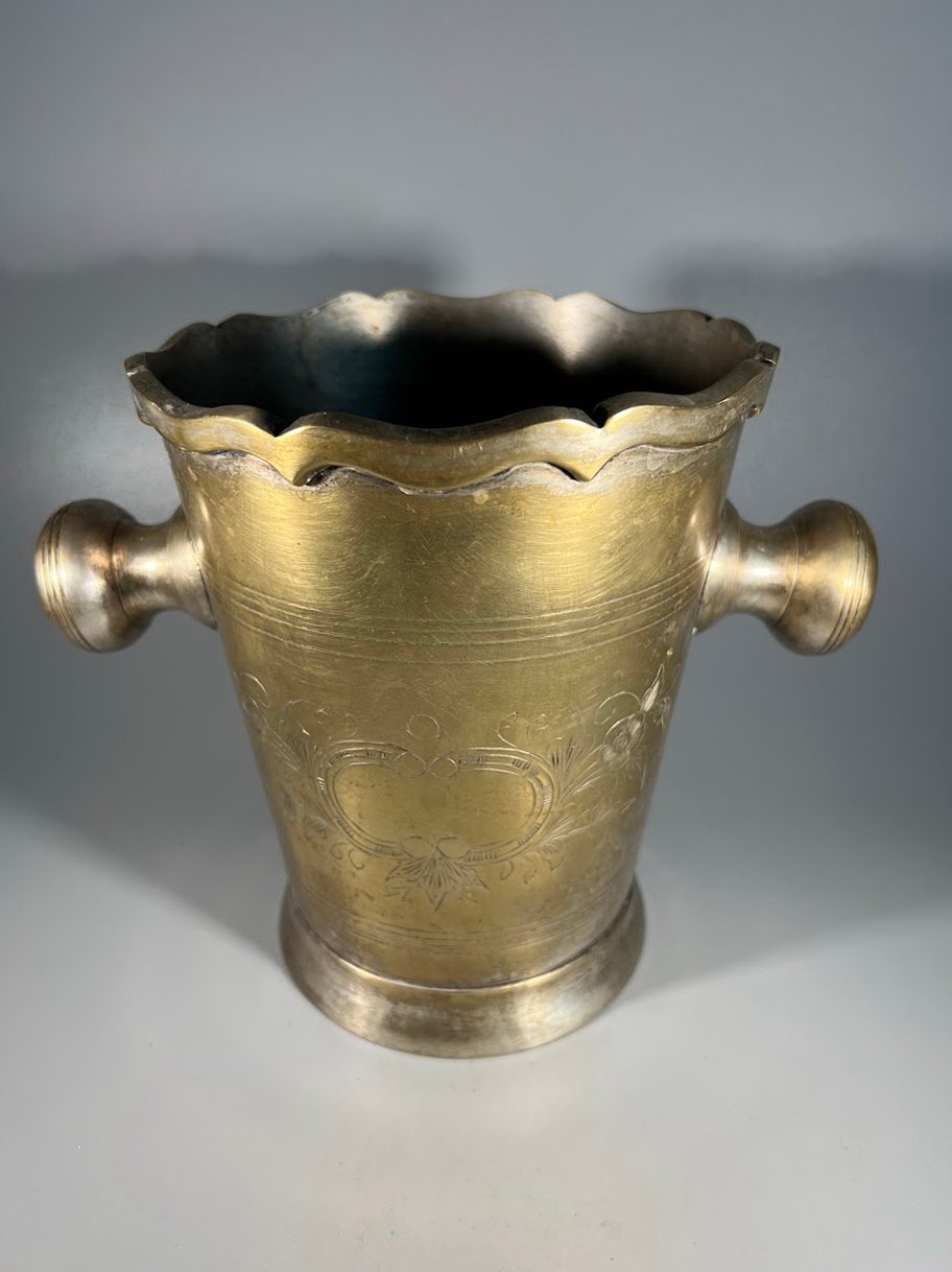 Šampaninė, indas šampano buteliui su ledukais, žalvarinė, sidabruota, vintažinė. Kaina 53