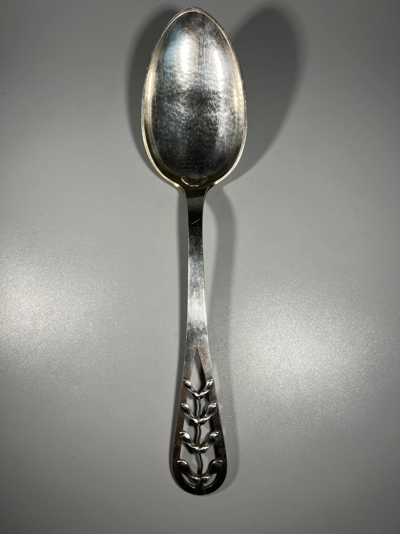 Šaukštas didžiulis, sidabrinis Heimbürger, antikvarinis. Danija. Svoris 109 g. Praba 925 (3 bokštai). Kaina 263