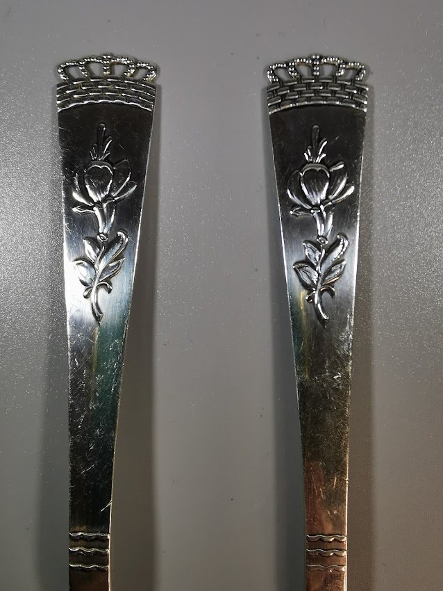 Šaukštas ir šakutė sidabriniai, antikvariniai. Danija. Svoris po 45 g., viso 90 g. Praba 925 (3 bokštai). 1938 m. Ilgis 19 cm. Būklė labai gera. Kaina 168 už abu.
