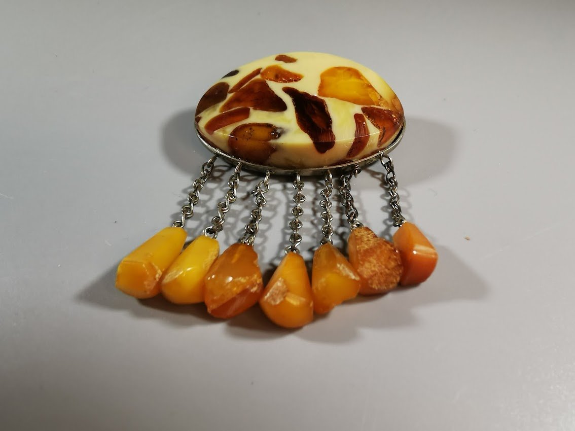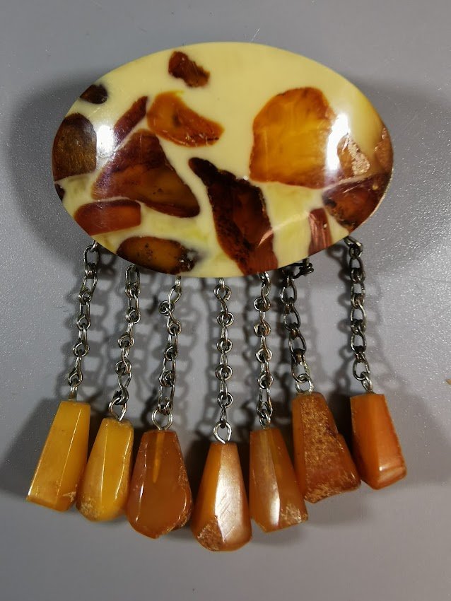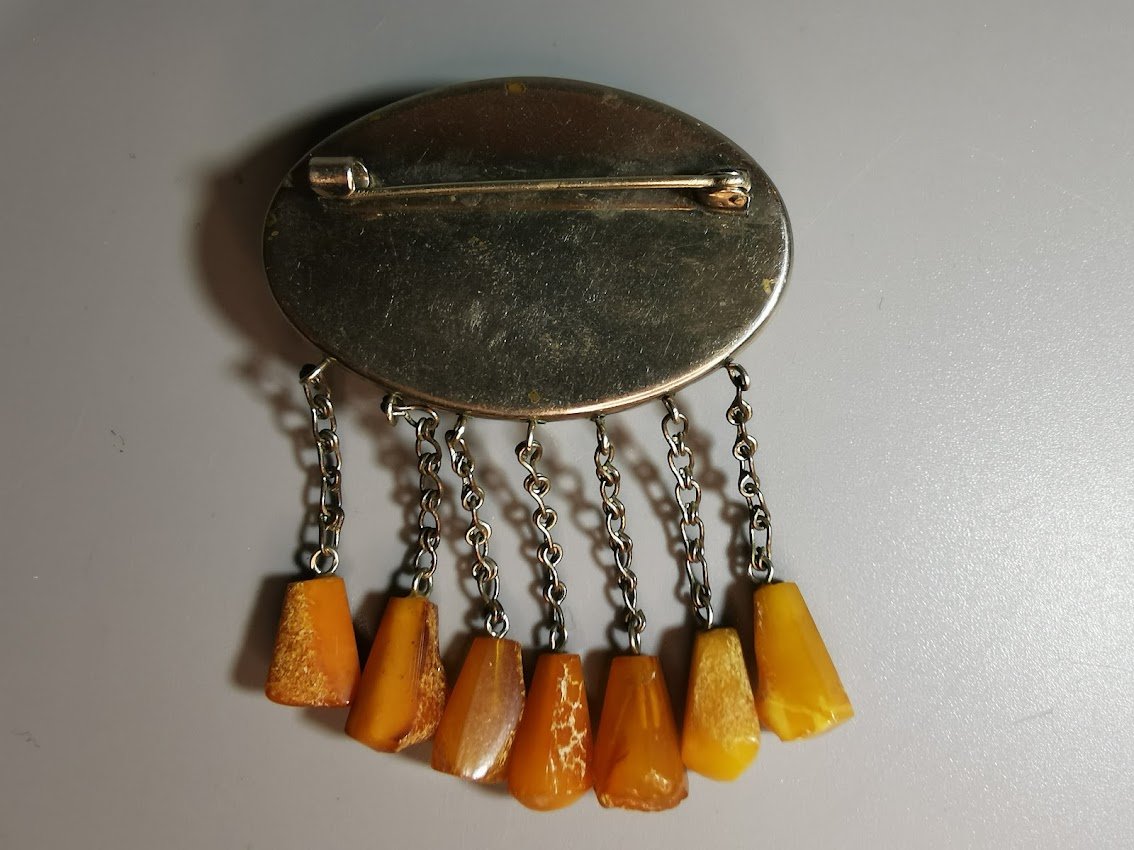 Segė gintarinė, tarybinių laikų. Pagrindo dydis: 3 x 5 cm. Kaina 26