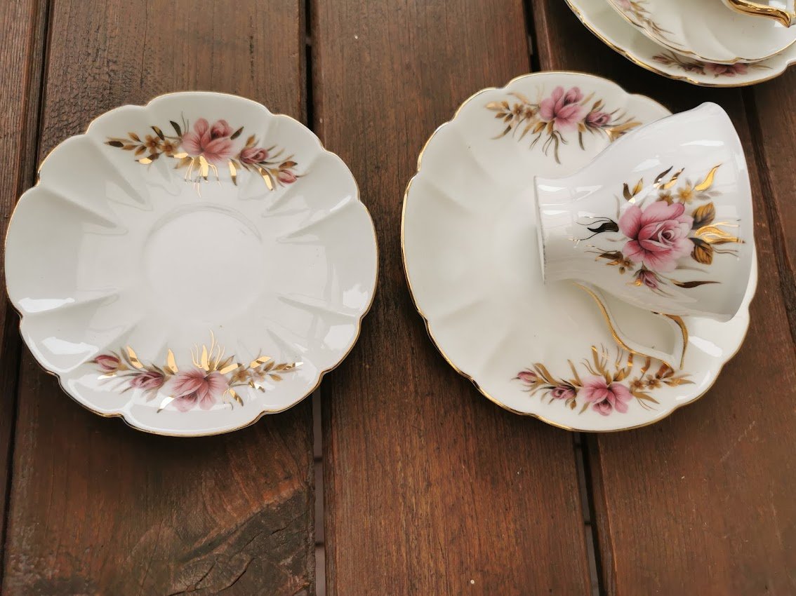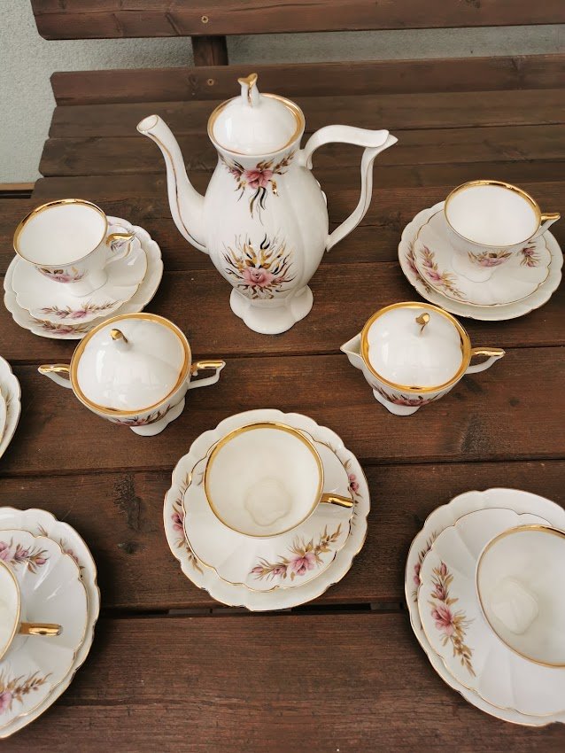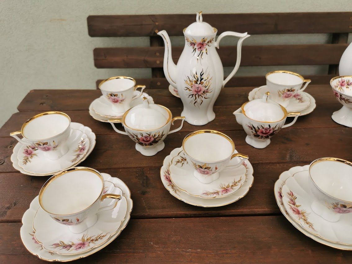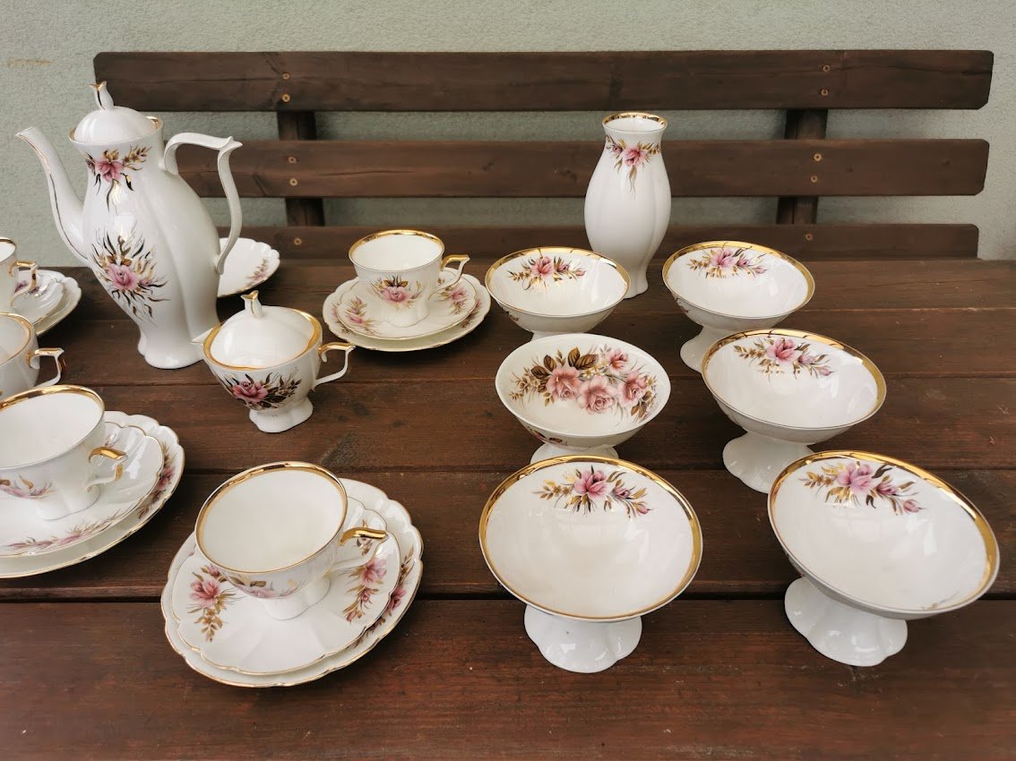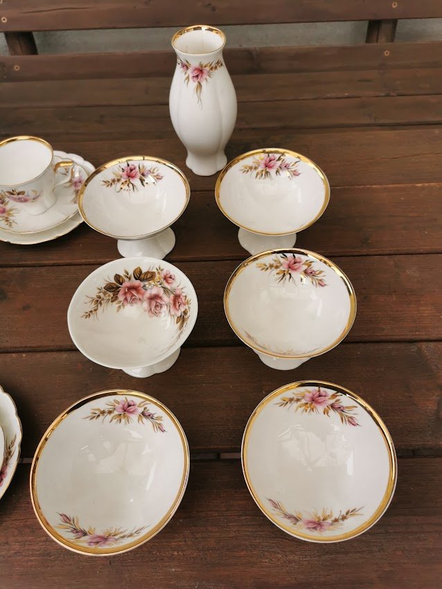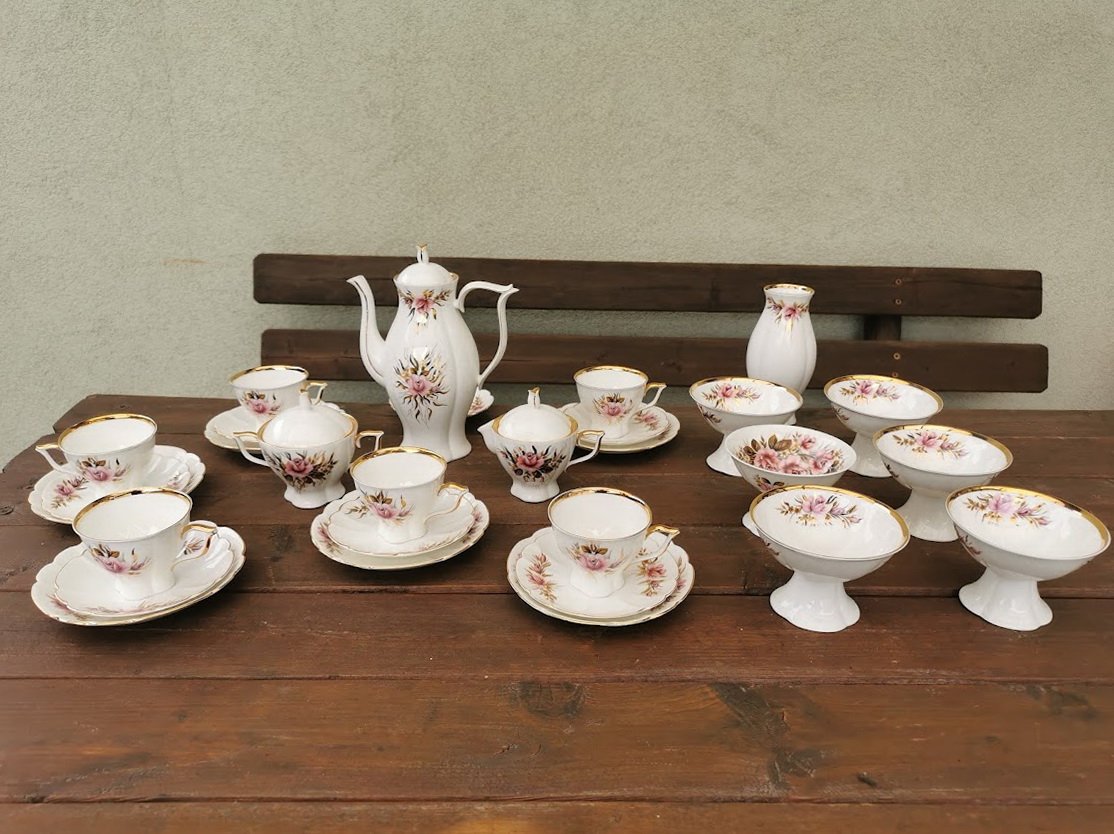 Servizas kaulinio porceliano lietuviškas JIESIA, tarybinių laikų. Vazelė įskilusi. Viena ledainė skirtinga. Vieno puodelio rankenėlė klijuota. Visa kita geros būklės. Kaina 118 už viską.