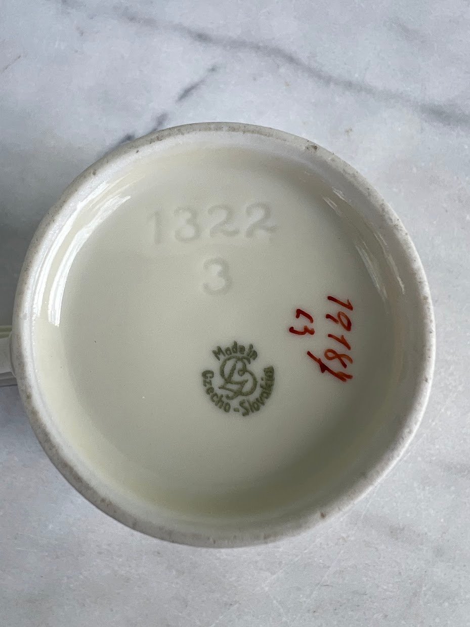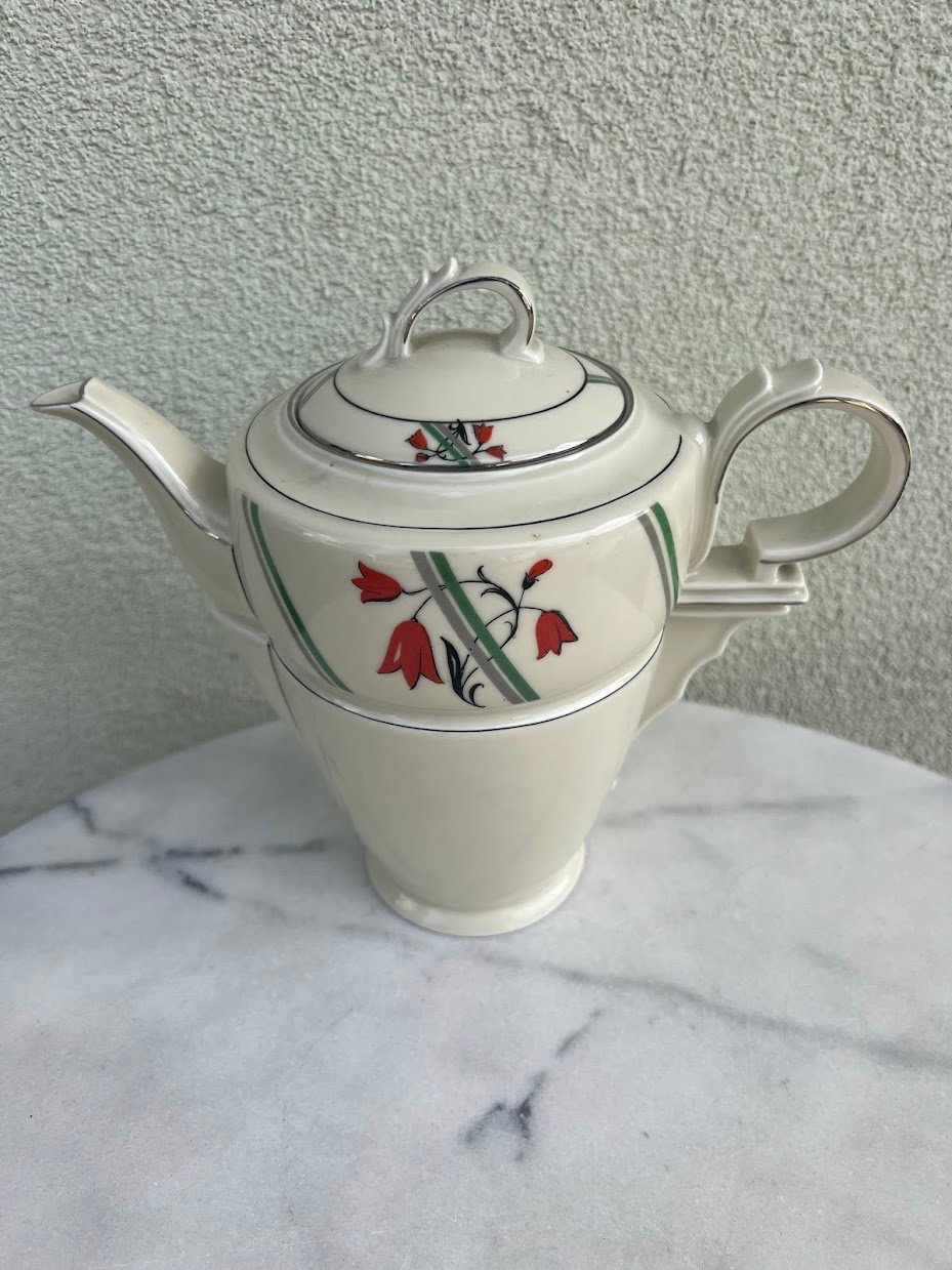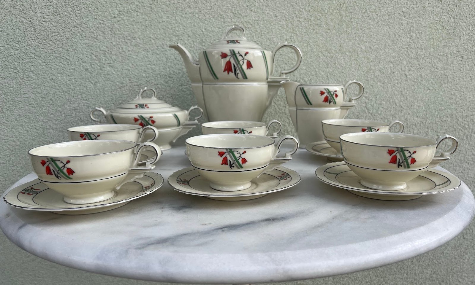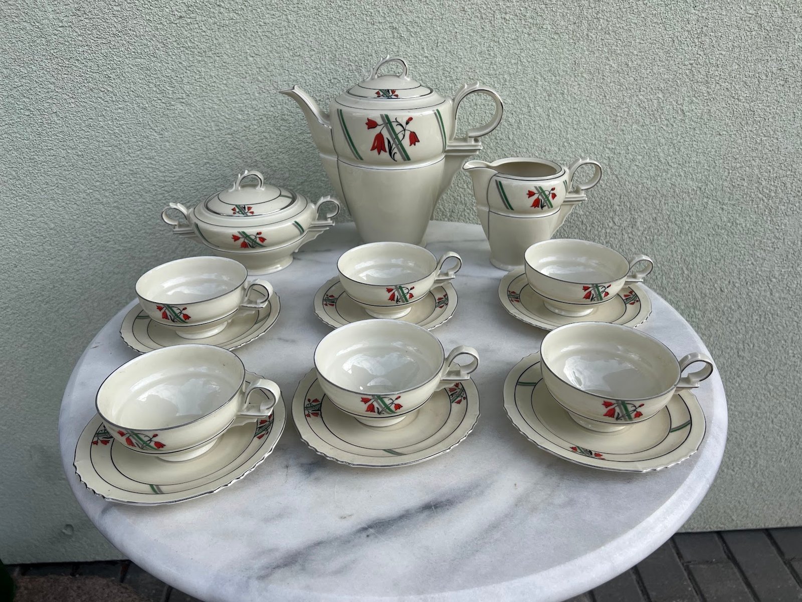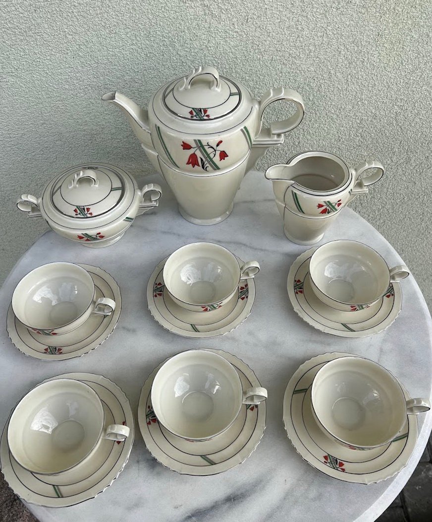 Servizas porcelianinis, antikvarinis, Art Deco stiliaus, tarpukario laikų Gebrüder Benedikt AG, Dvory (Mayerhöfen), nuo 1932 m. Epiag koncerno dalis. 1918-1939 m. Puodelio talpa 230 ml. Arbatinuko, kavinuko aukštis 24 cm. Kaina 488