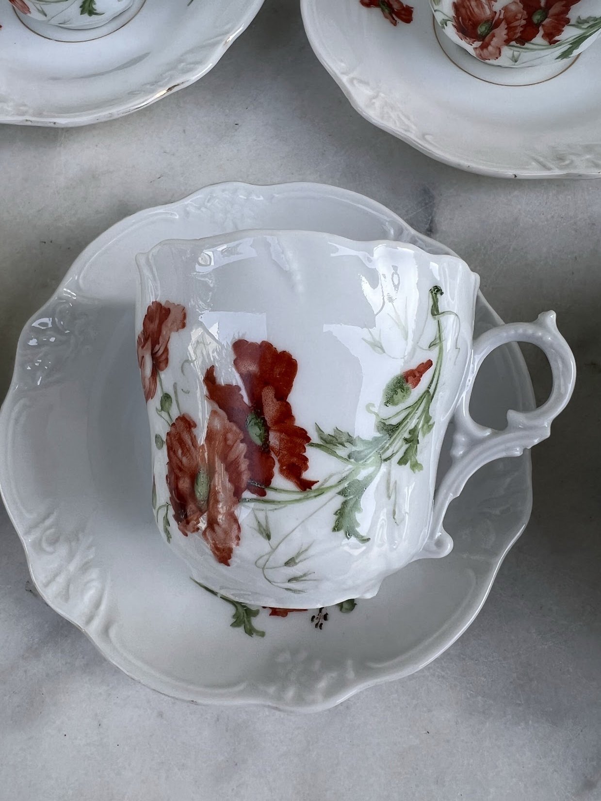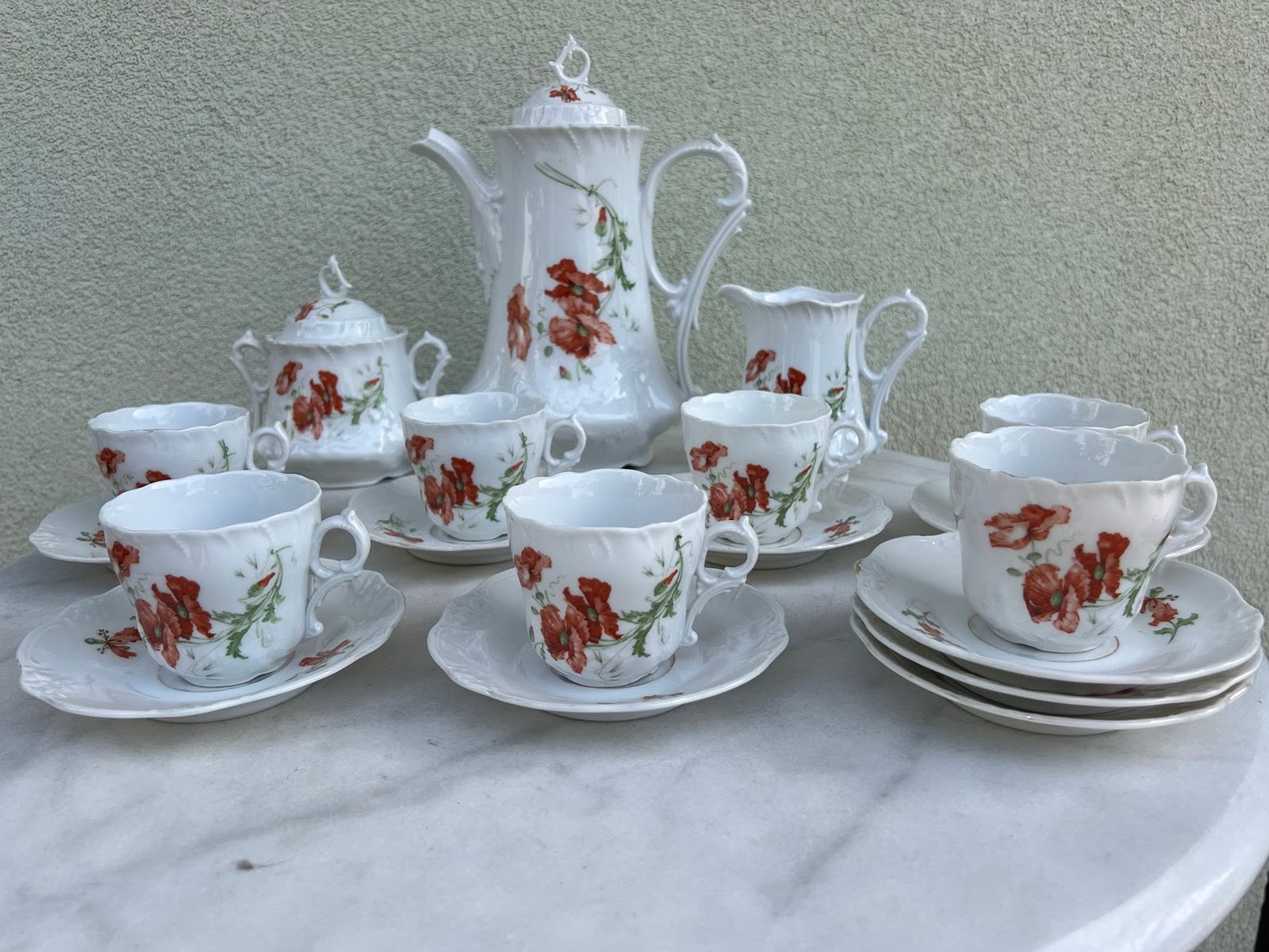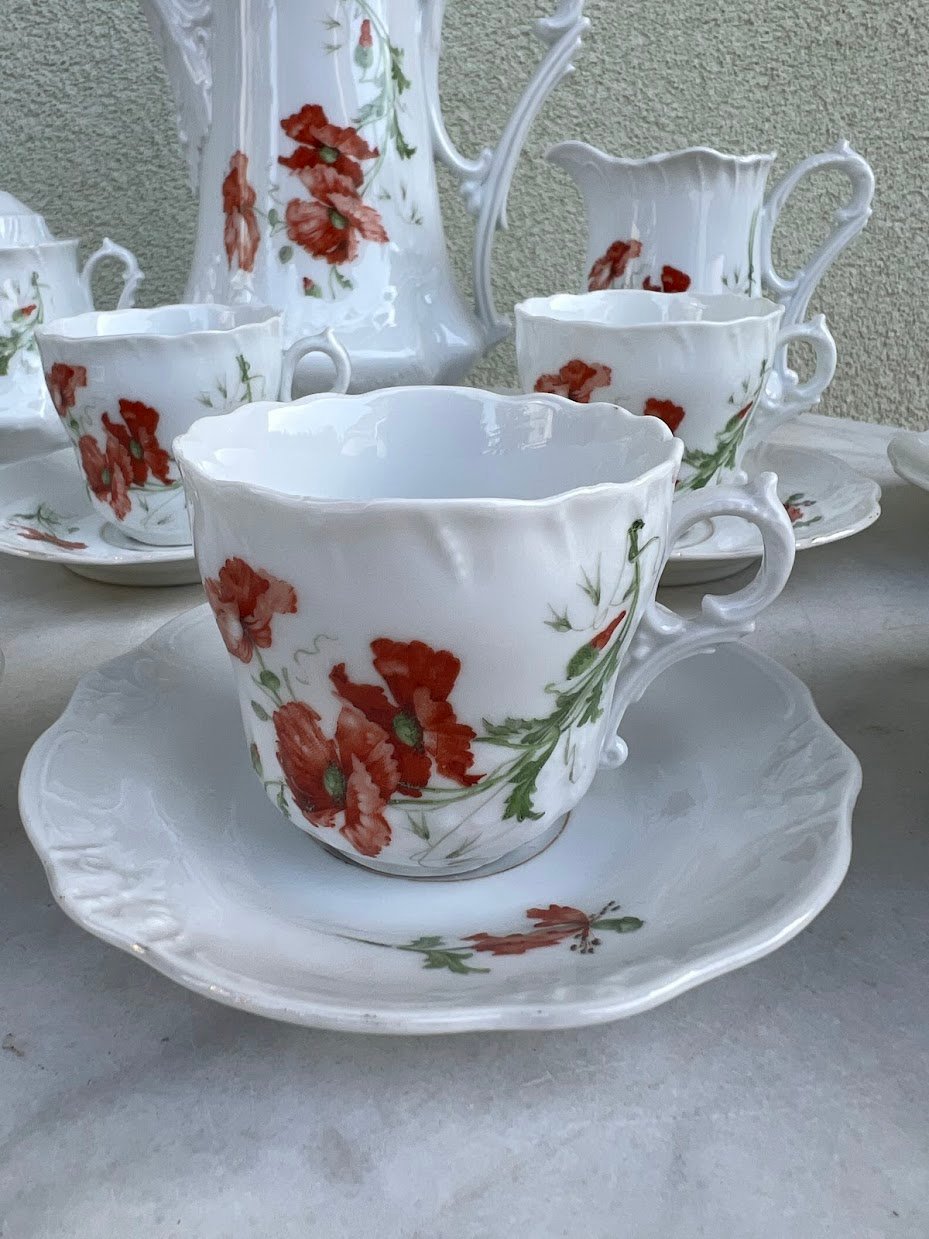 Servizas porcelianinis, puoštas aguonomis, antikvarinis, gamintojas Carl Tielsch & Co. 1845 – 1934 m. Puodelio talpa 170 ml. Du puodeliai su mažais defektais. Kaina 187