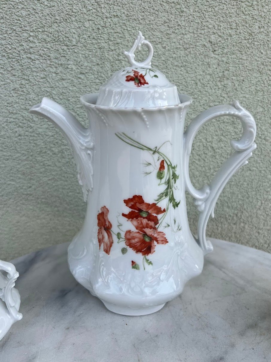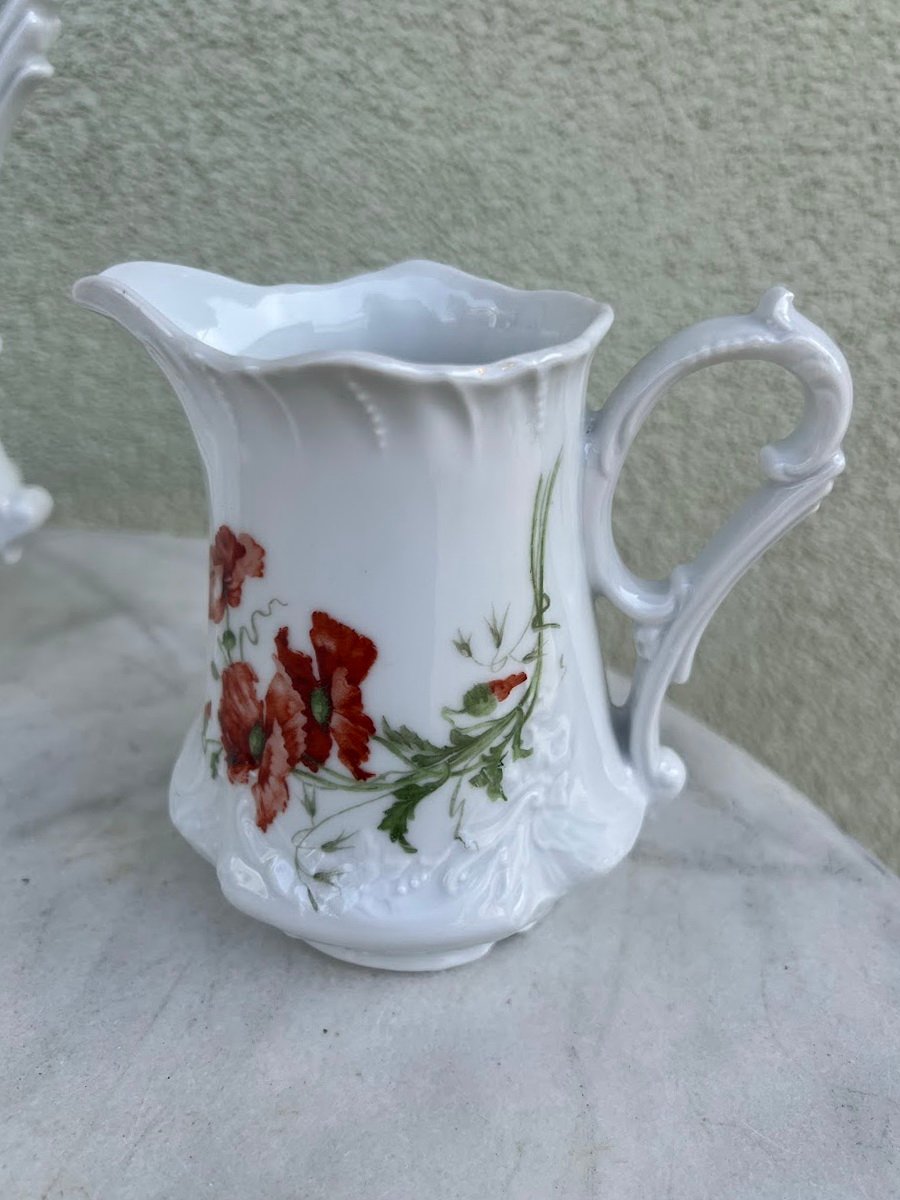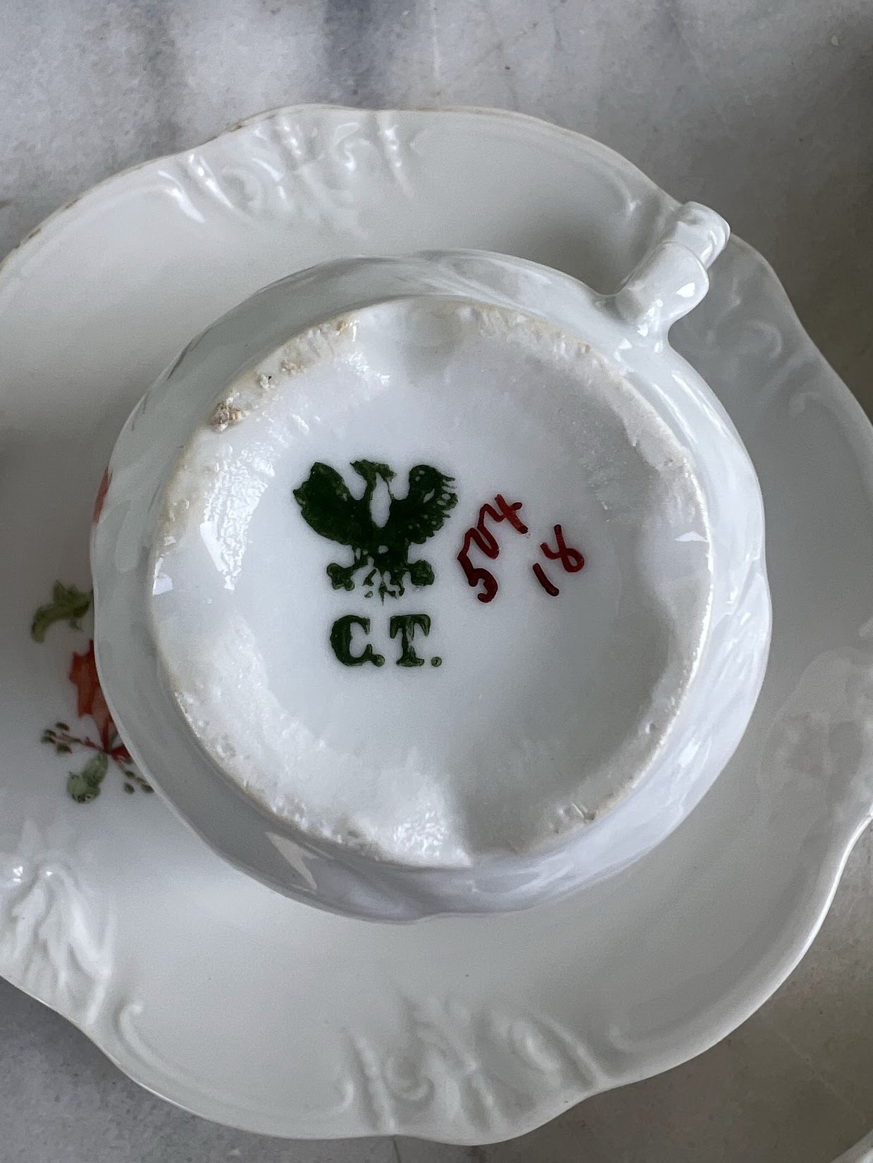 Servizas porcelianinis, puoštas aguonomis, antikvarinis, gamintojas Carl Tielsch & Co. 1845 – 1934 m. Puodelio talpa 170 ml. Du puodeliai su mažais defektais. Kaina 187
