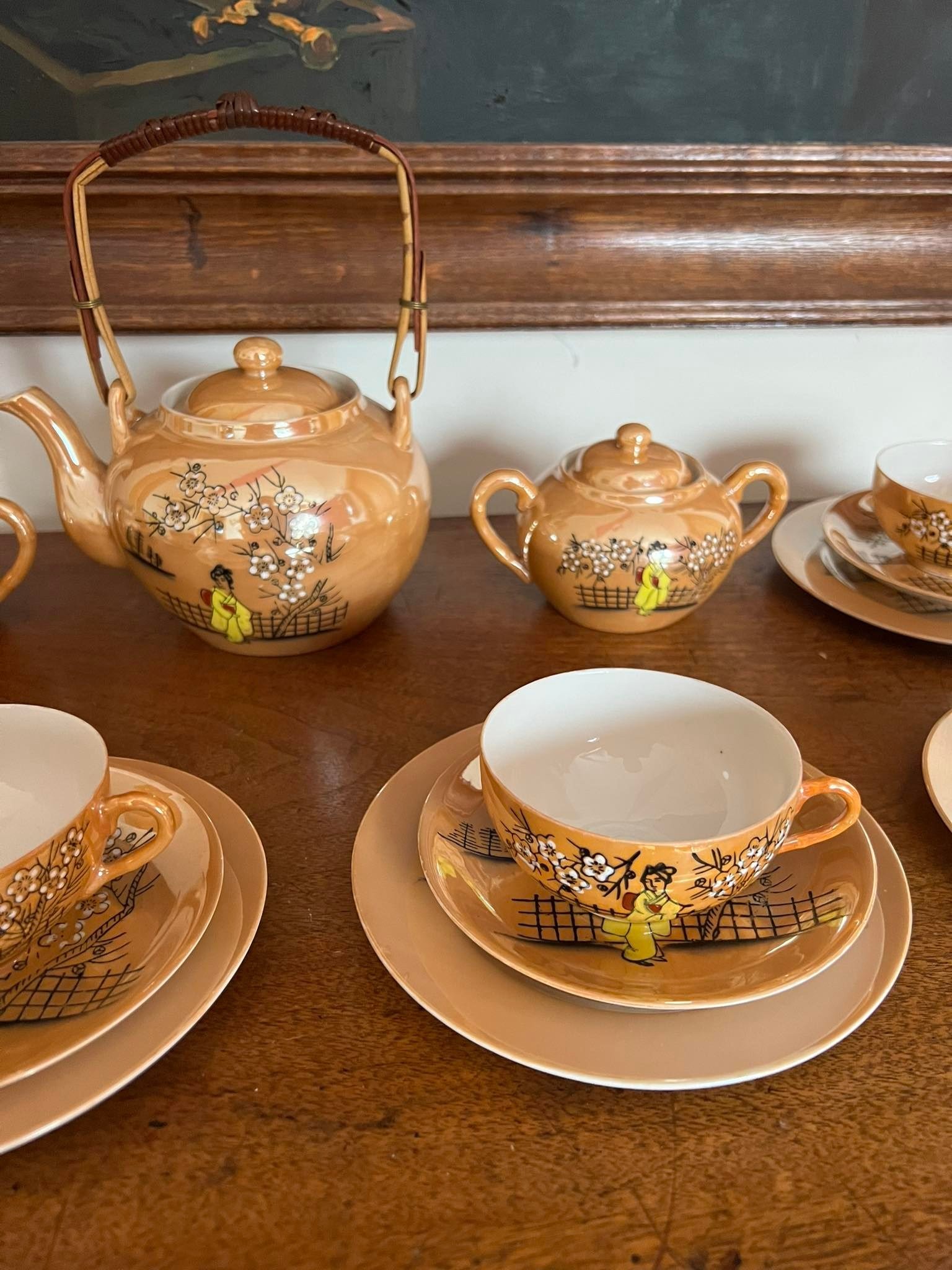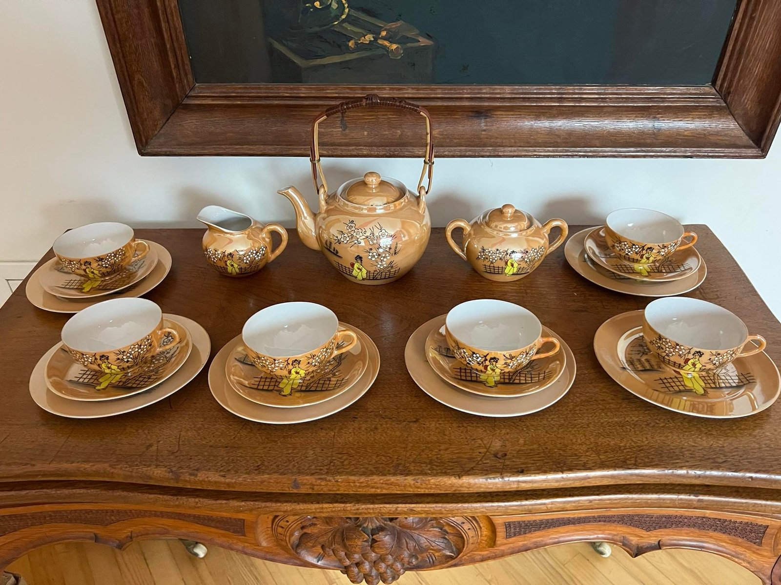 Servizas su litofanija, plono porceliano, Japoniškas 5 asmenims ( 6 asmeniui trūksta vienos mažos lėkštutės). Puodelio talpa 150 ml. Kaina 87