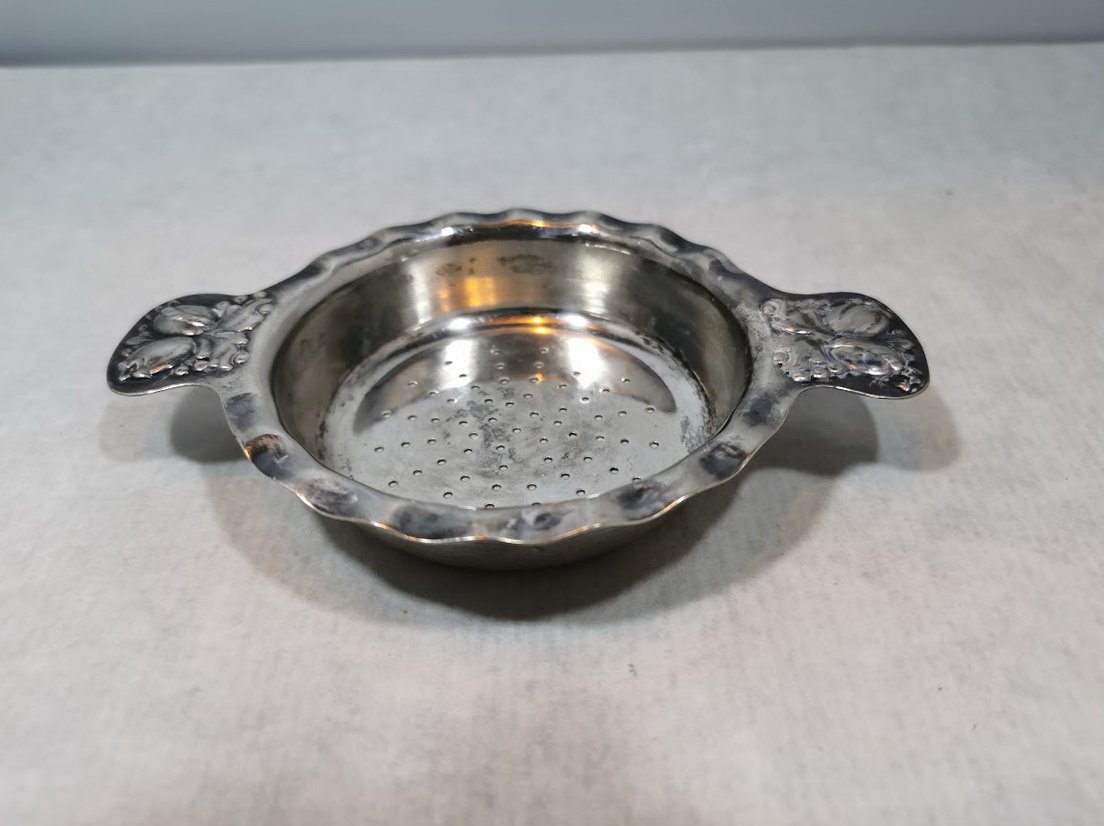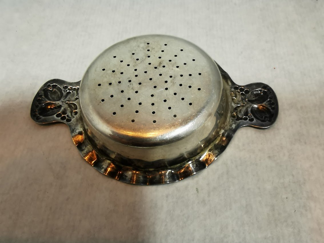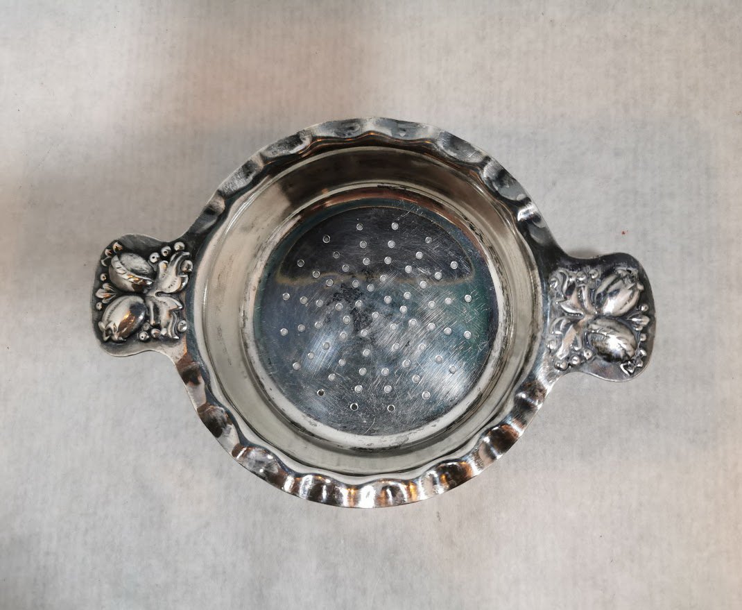 Sietelis arbatai antikvarinis. Skersmuo 9, ilgis su rankenomis 12,5 cm. Kaina 11