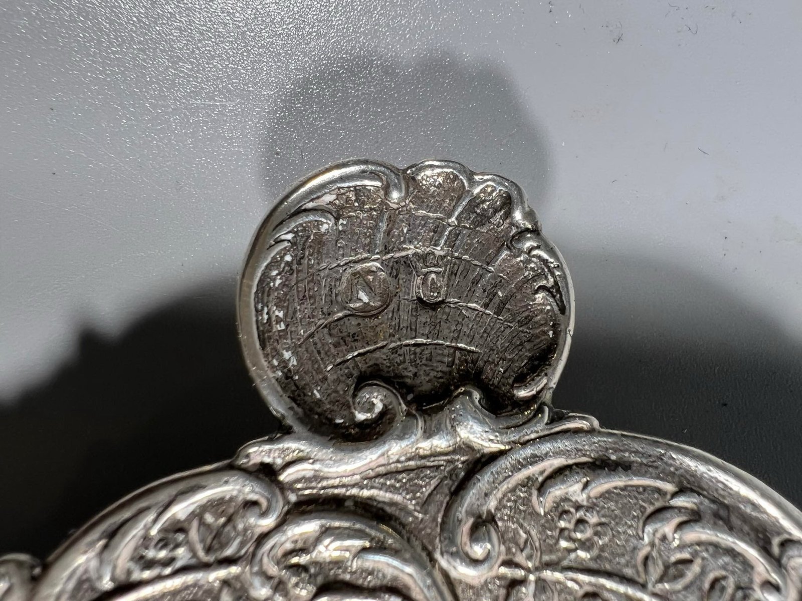 Sietelis arbatai sidabrinis, antikvarinis. Hanau, Vokietija. Svoris 74 g. Ilgis 14, plotis 10, aukštis 2,5 cm. Kaina 158