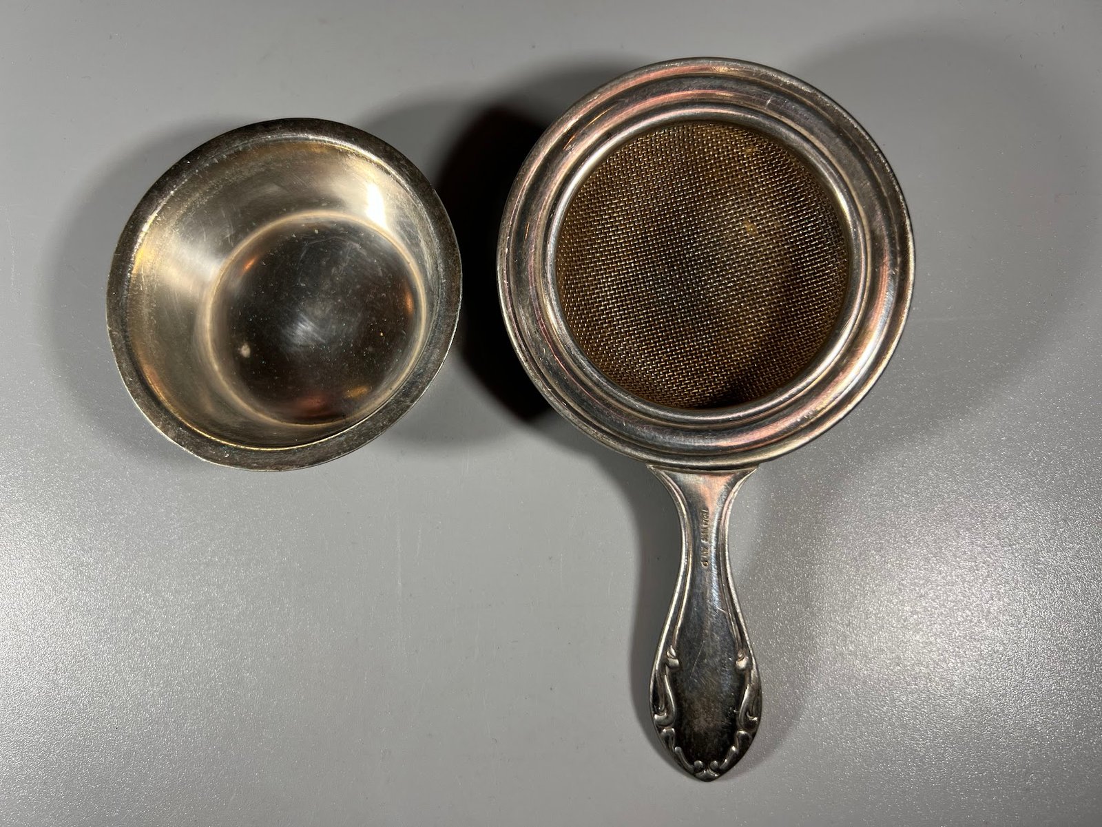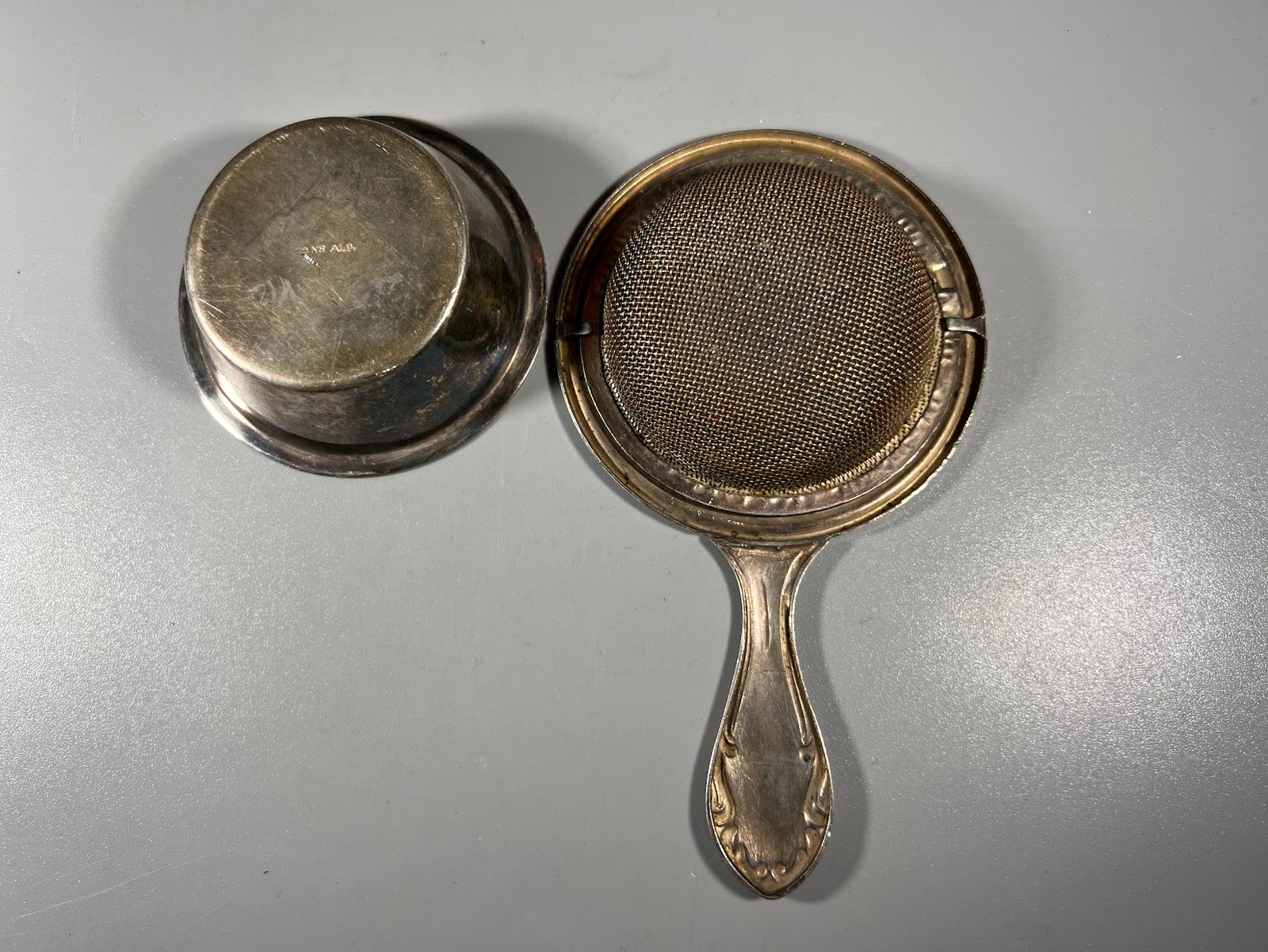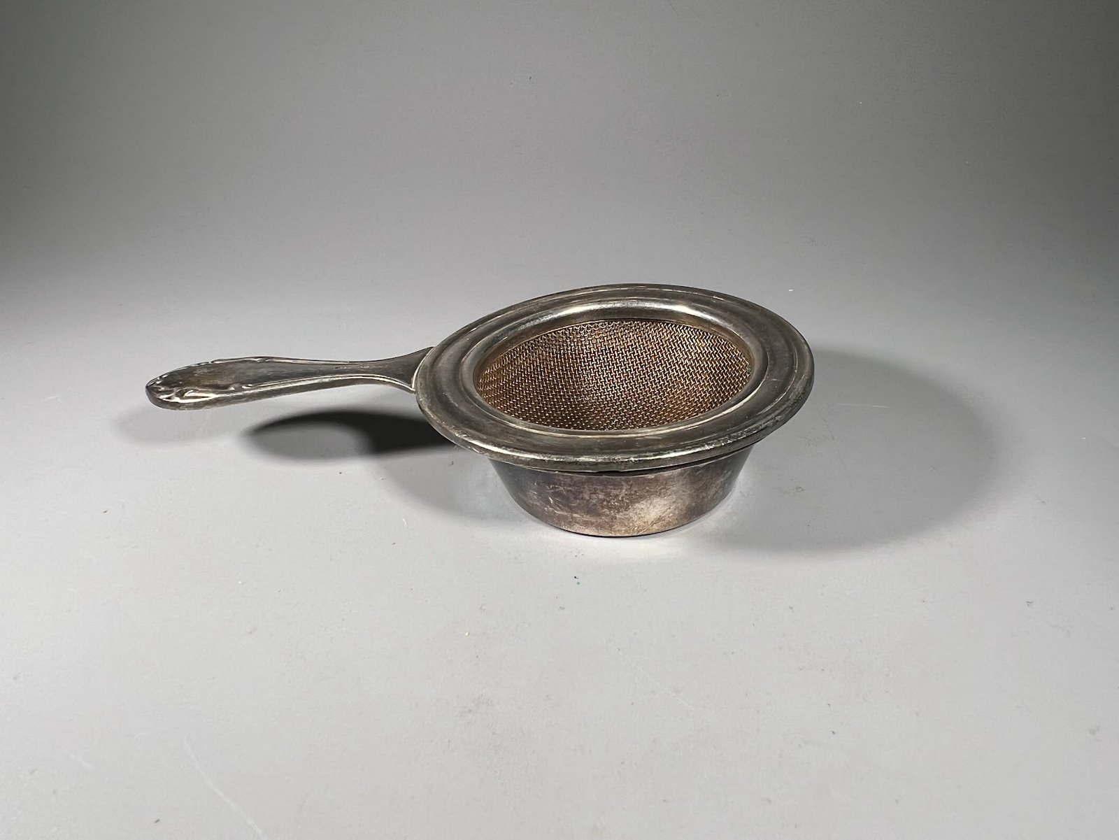 Sietelis arbatai su nuvarvėjimo dubenėliu sidabruotas, antikvarinis. Sietelio skersmuo 7 cm. Ilgis viso 13 cm. Kaina 13