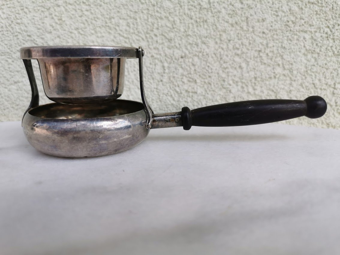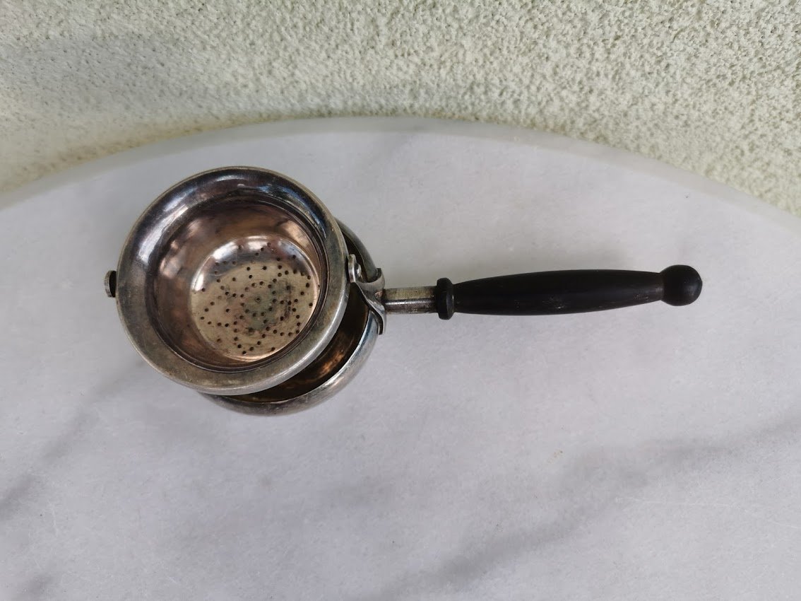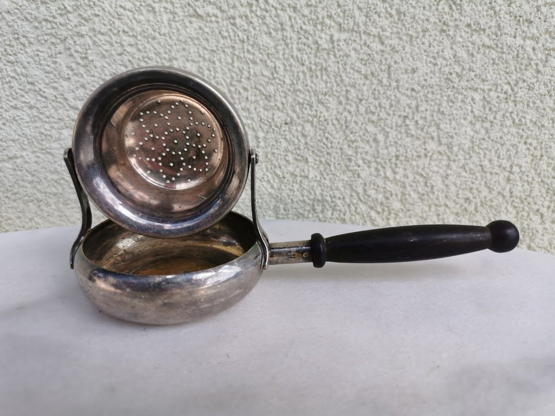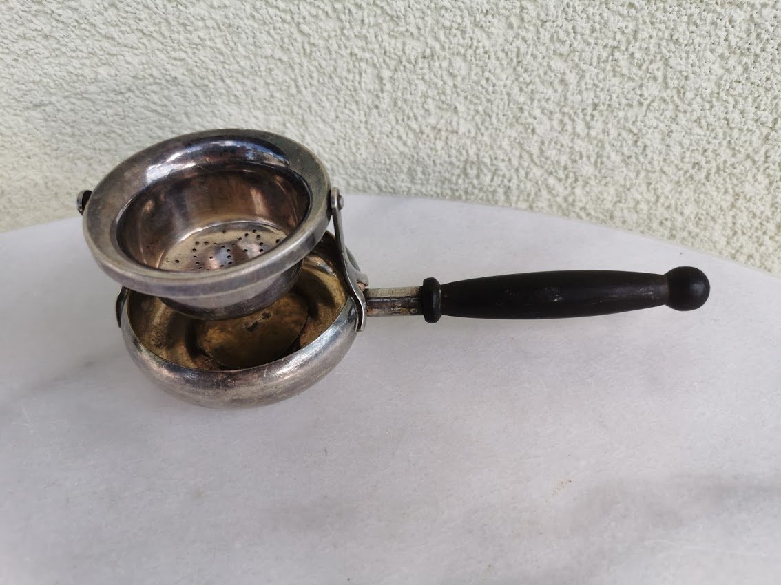 Sietelis, koštuvas arbatai medine rankena, antikvarinis, sidabruotas. Kaina 23
