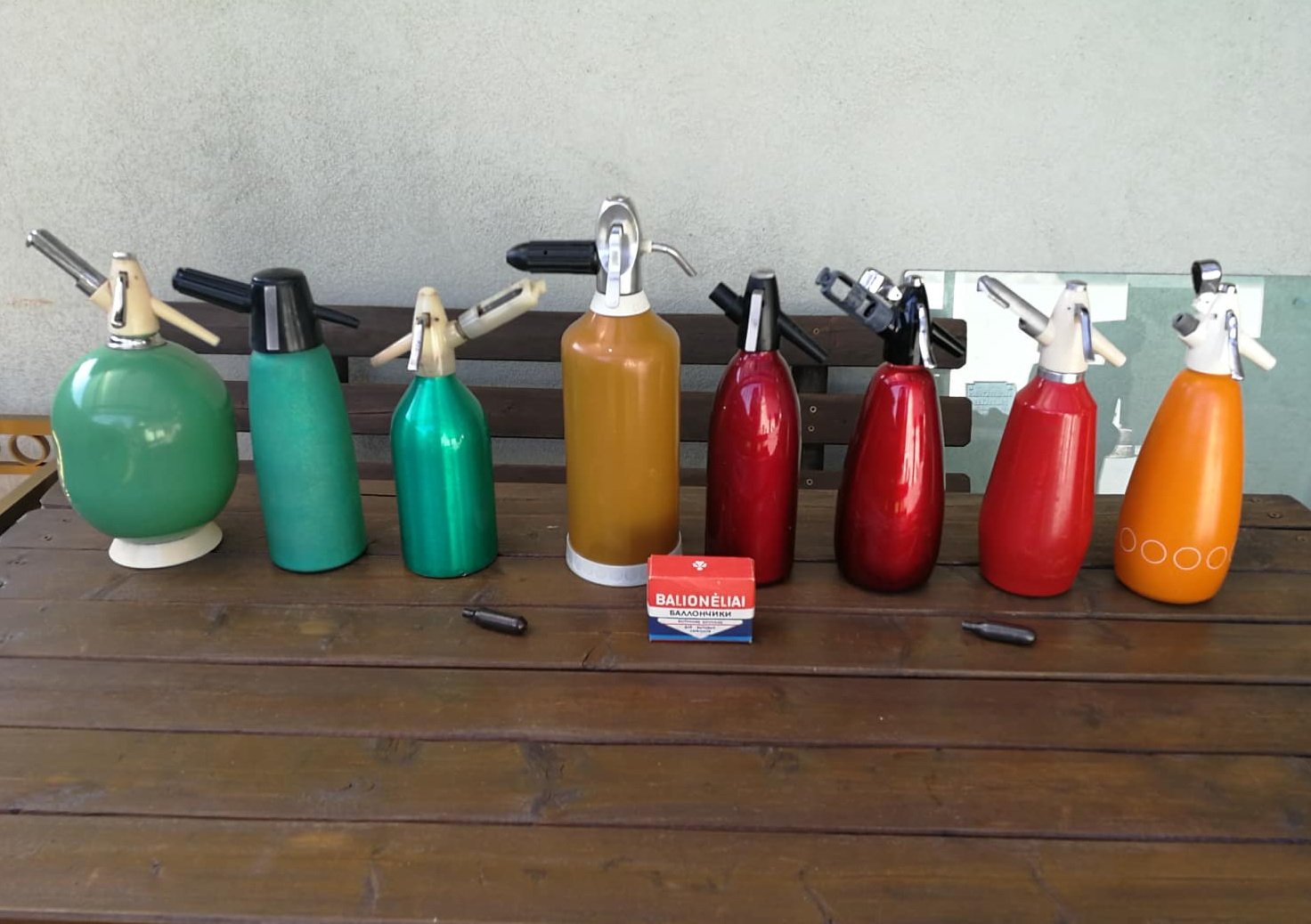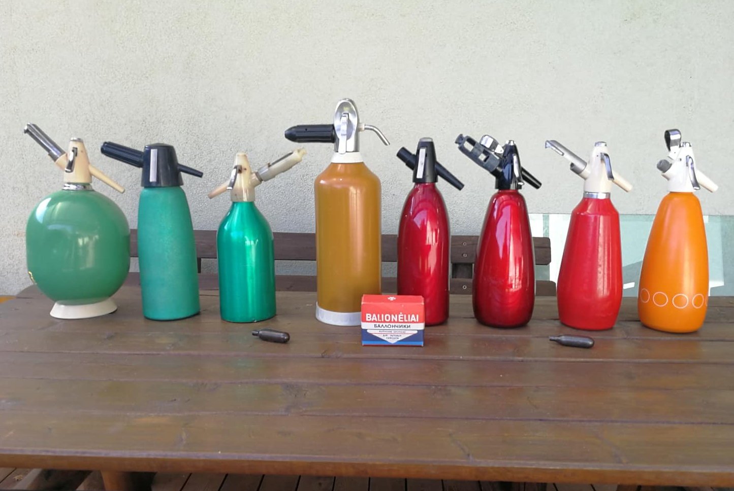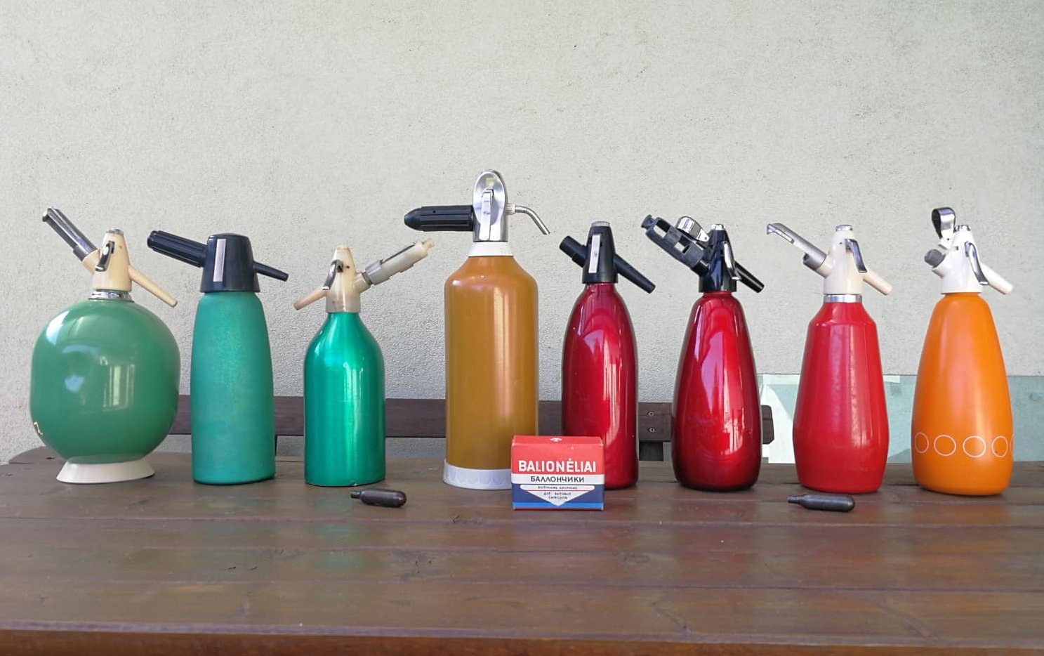 Vintažinių buitinių sifonų kolekcija. 8 vnt. Kraštinis didžiausias 34, aukščiausias vidurinis 40 cm. aukščio. Papuoš Jūsų virtuvės interjerą. Kaina nuo 21 iki 28