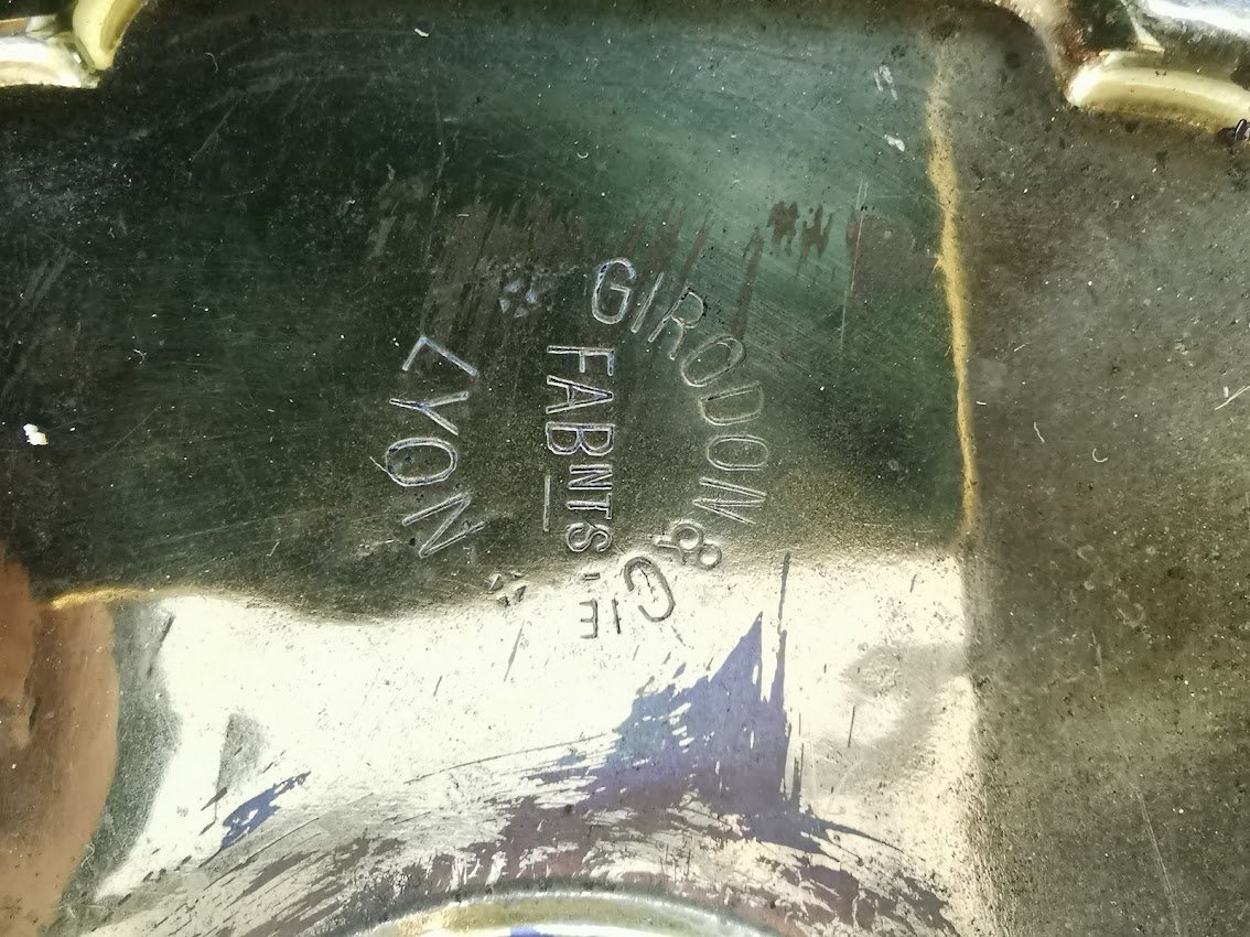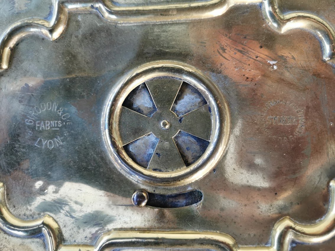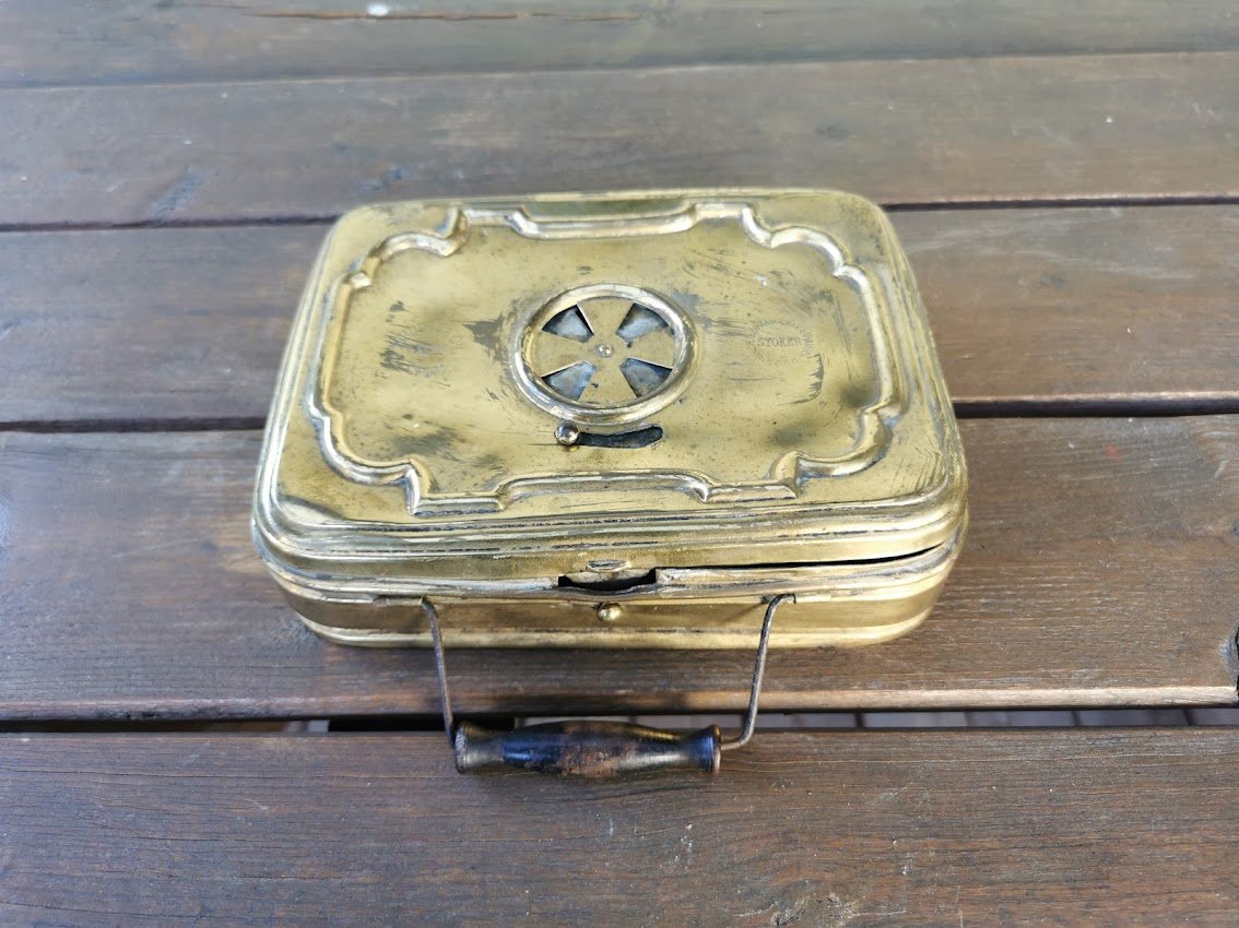 Šildynė, kojų šildytuvas, antikvarinis, medine rankena, prancūziškas. XIX a. pb. Antikvarinis nešiojamas kojų šildytuvas, skirtas naudoti namuose, keliaujant, ar net mokyklose ir religinių renginių metu. Dydis: 5 x 14 x 18 cm. Kaina 53