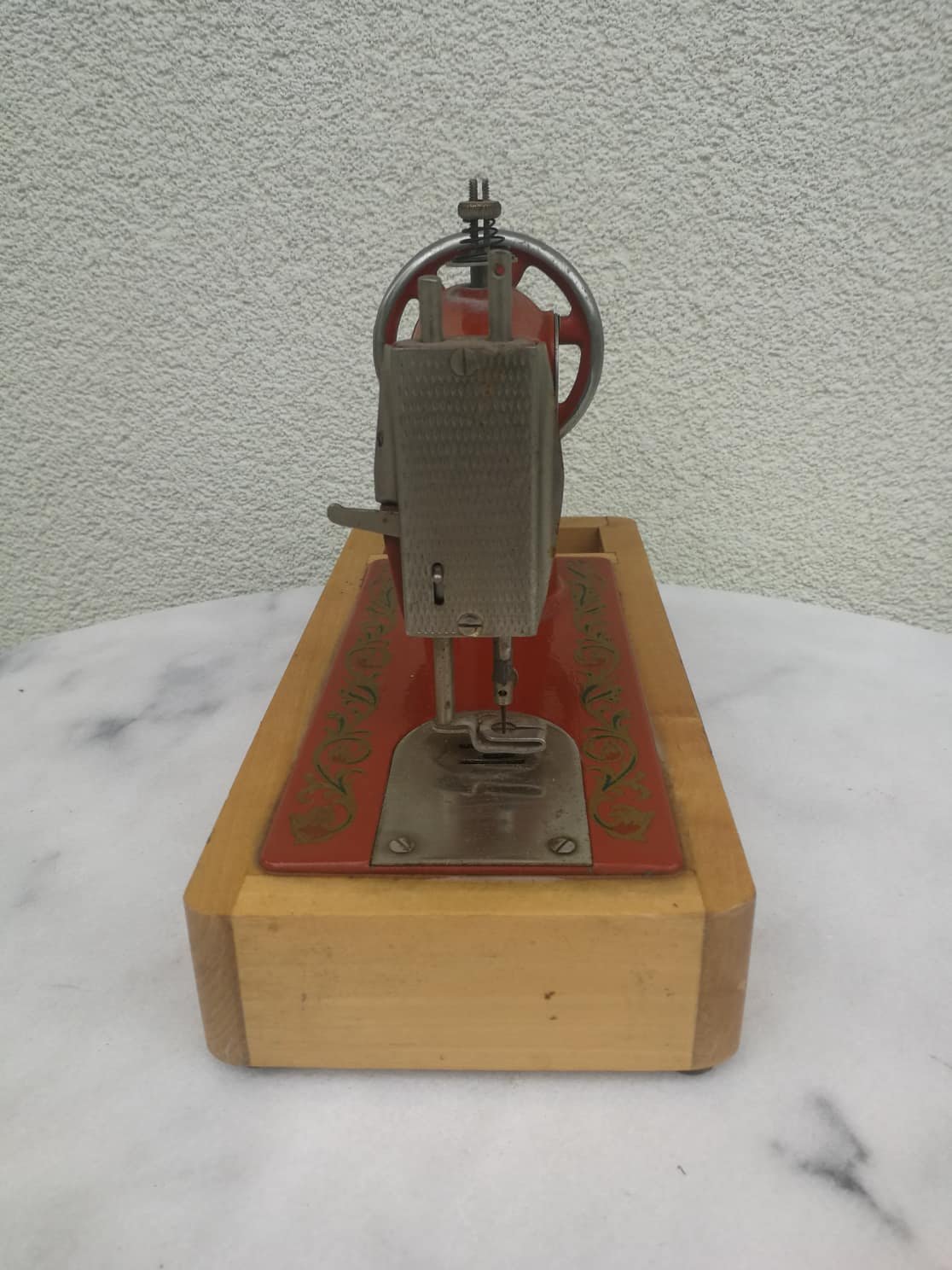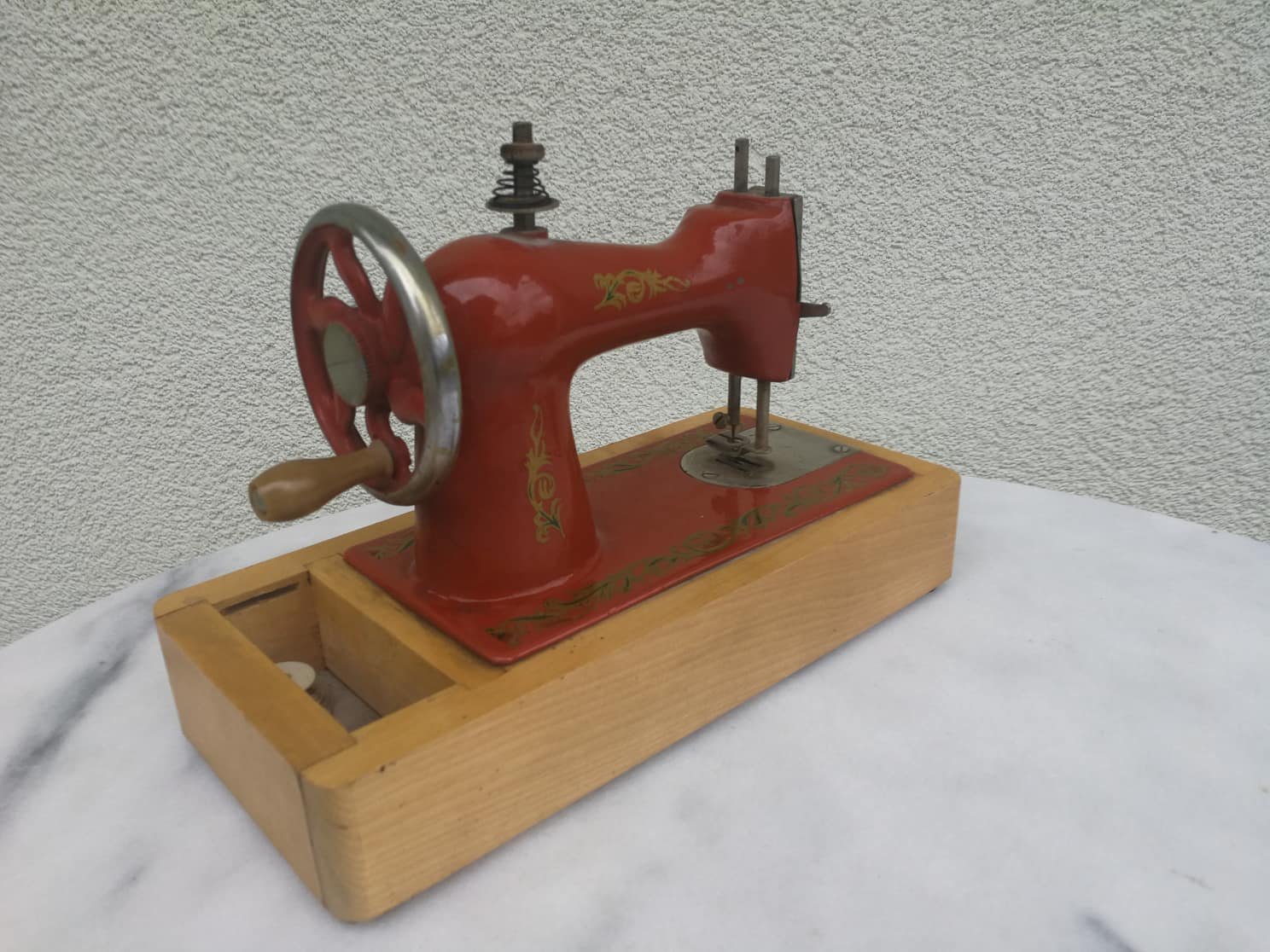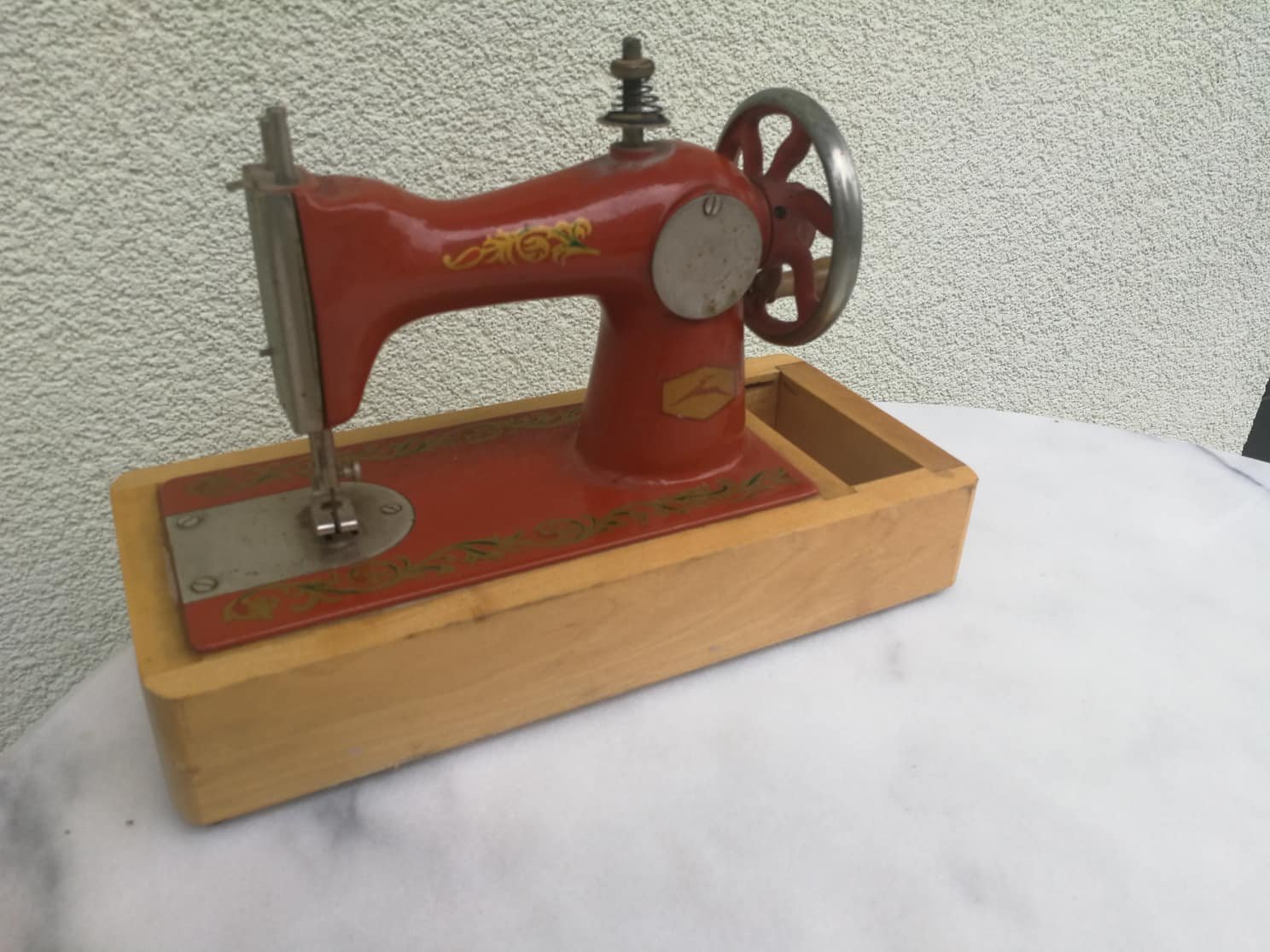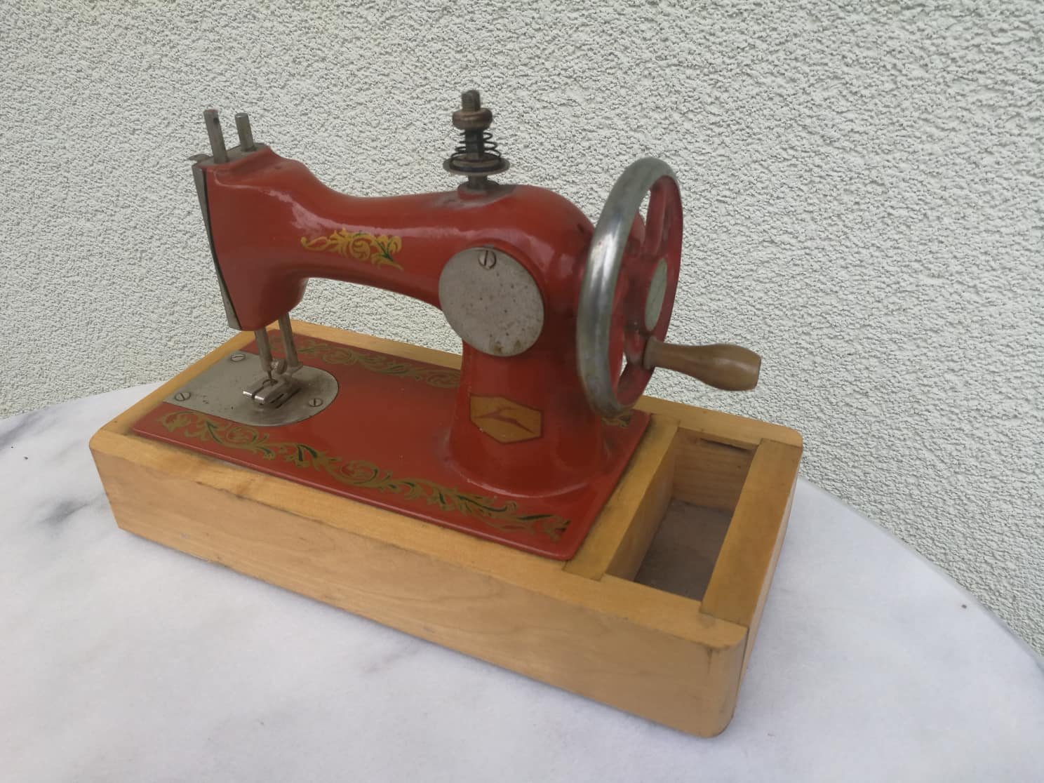 Siuvimo mašinėlė vaikiška, metalinė, tarybinė. Veikianti. Ilgis 26, plotis 12, aukštis 20 cm. Kaina 28