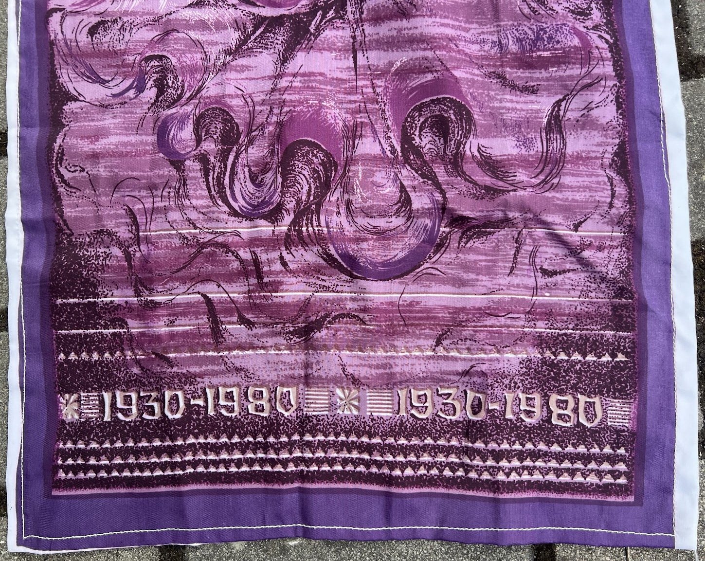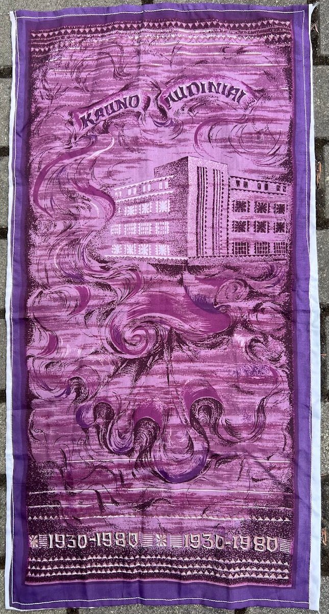 Skara šilkinė, sovietinė, skirta paminėti Kauno šilko audinių fabriko „Kauno audiniai“ 50-ies metų jubiliejų (1930–1980 m.). Dydis: 37 x 72 cm. Kaina 23