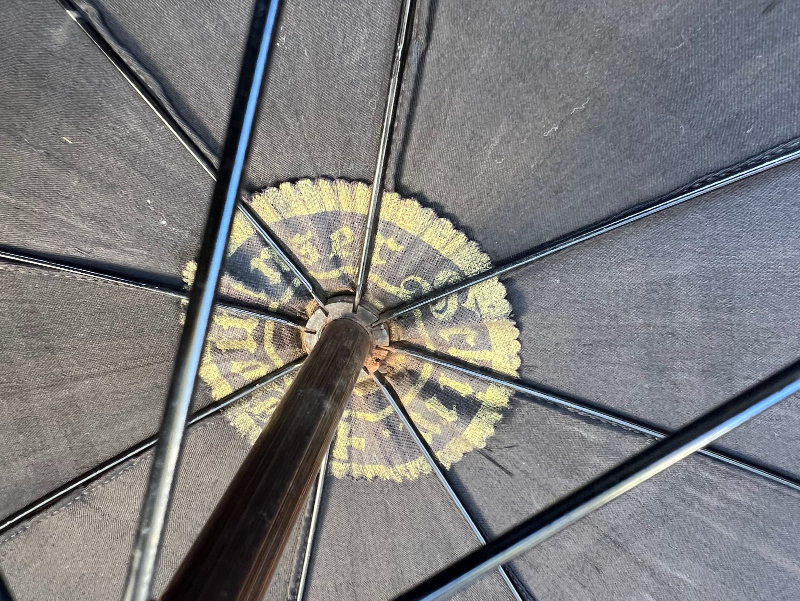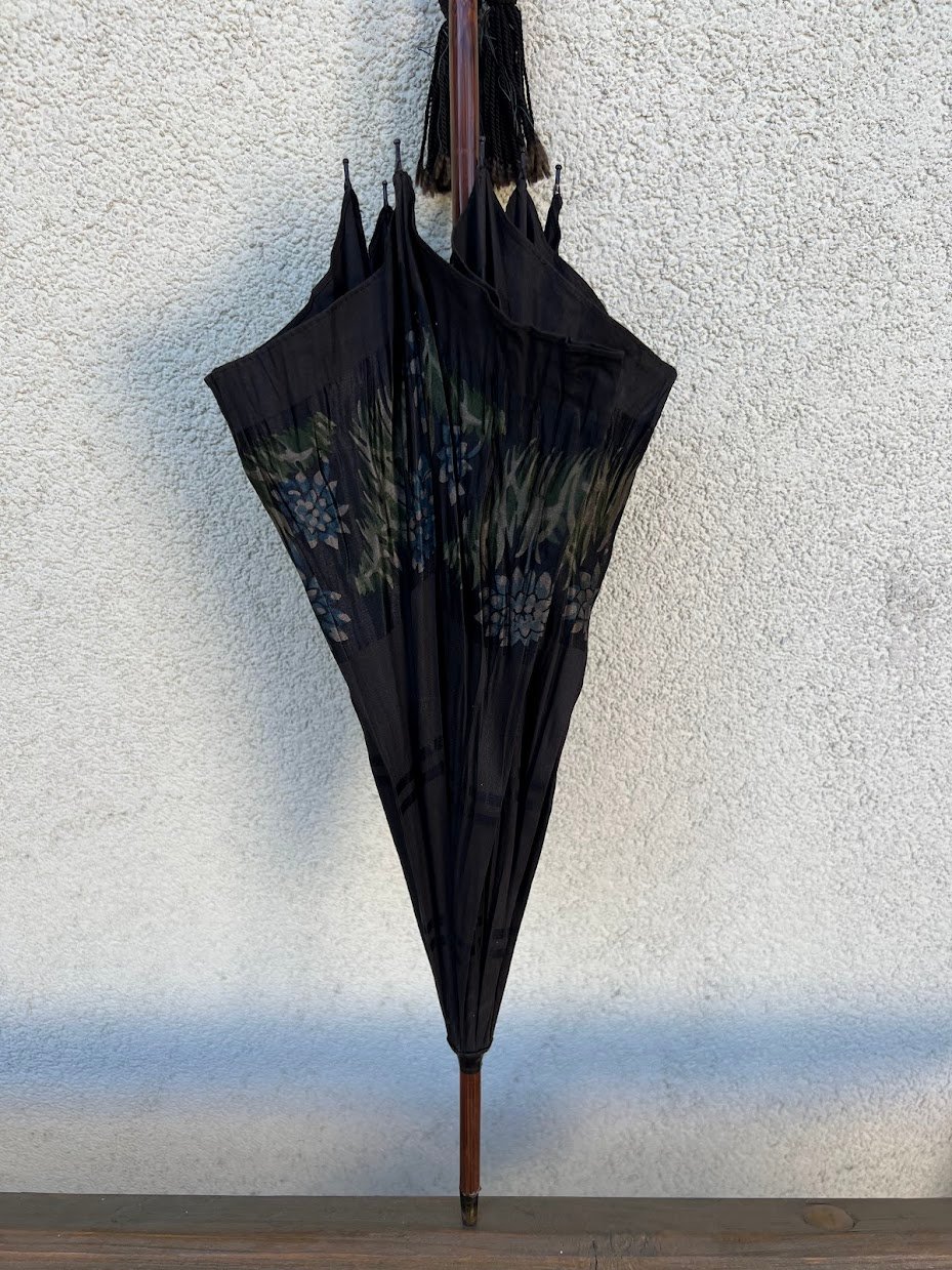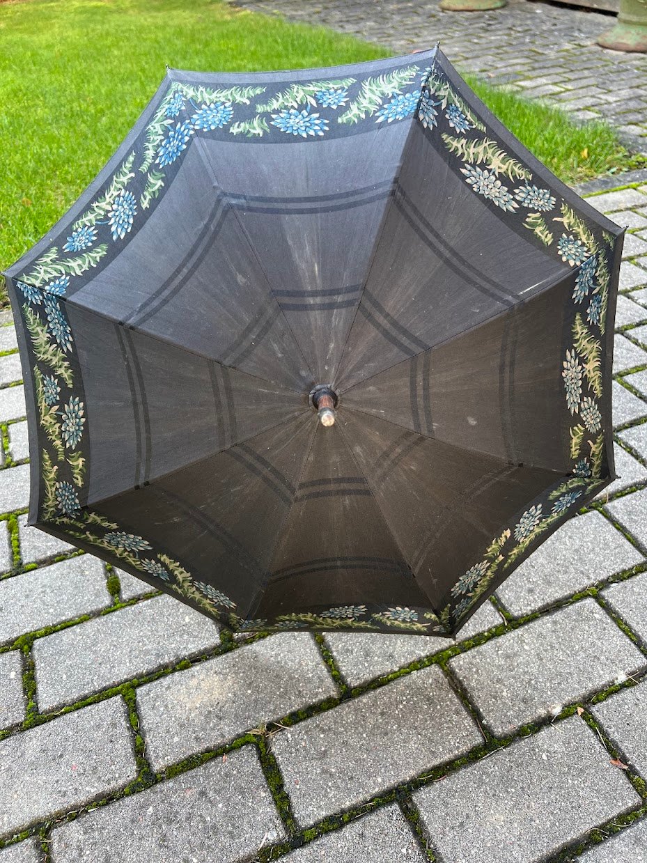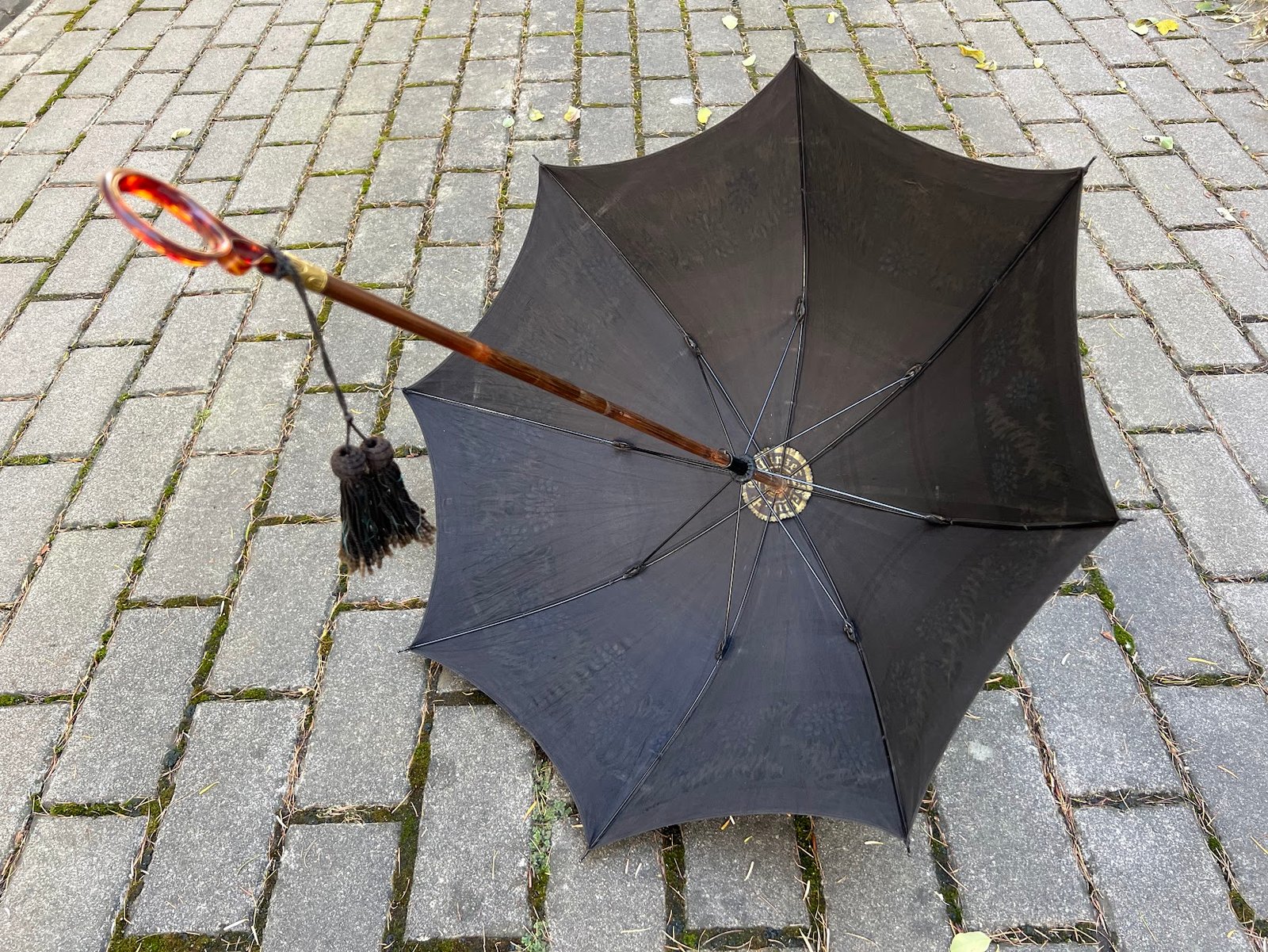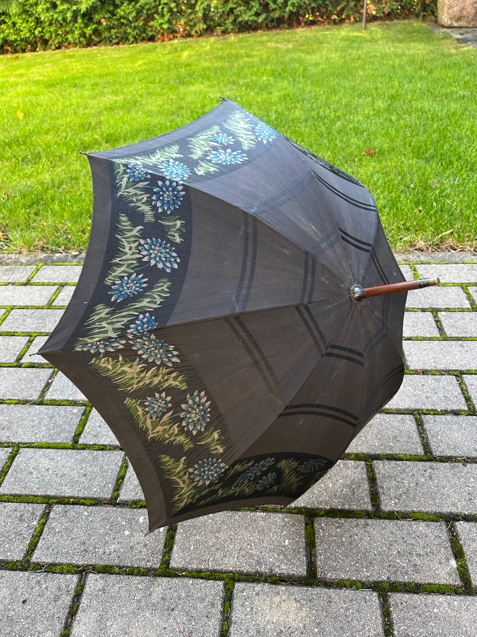 Skėtis nuo saulės (parasol) su tamsiu, gėlėtu audiniu ir raižyta bakelitine rankena, antikvarinis, vokiškas. Kaina 168