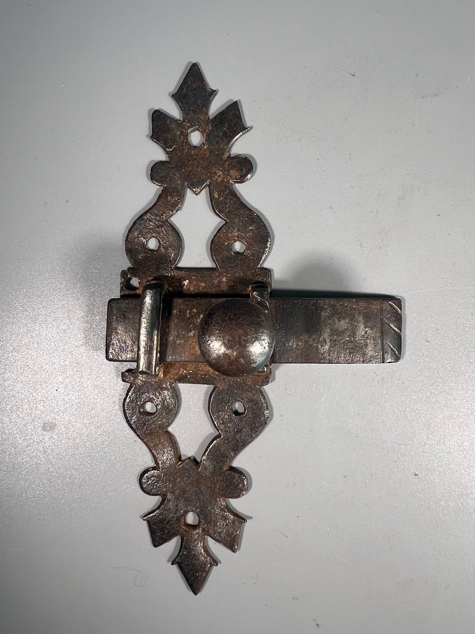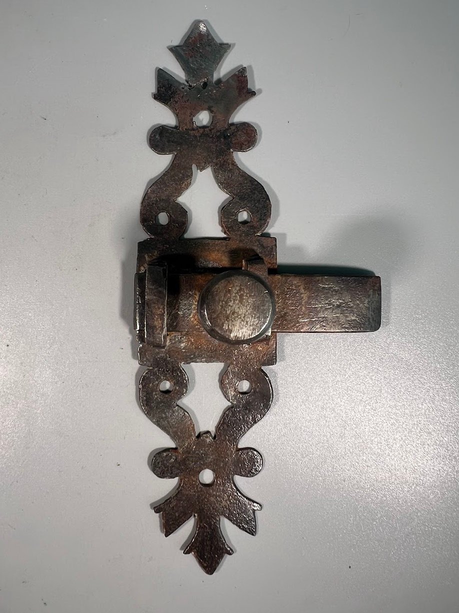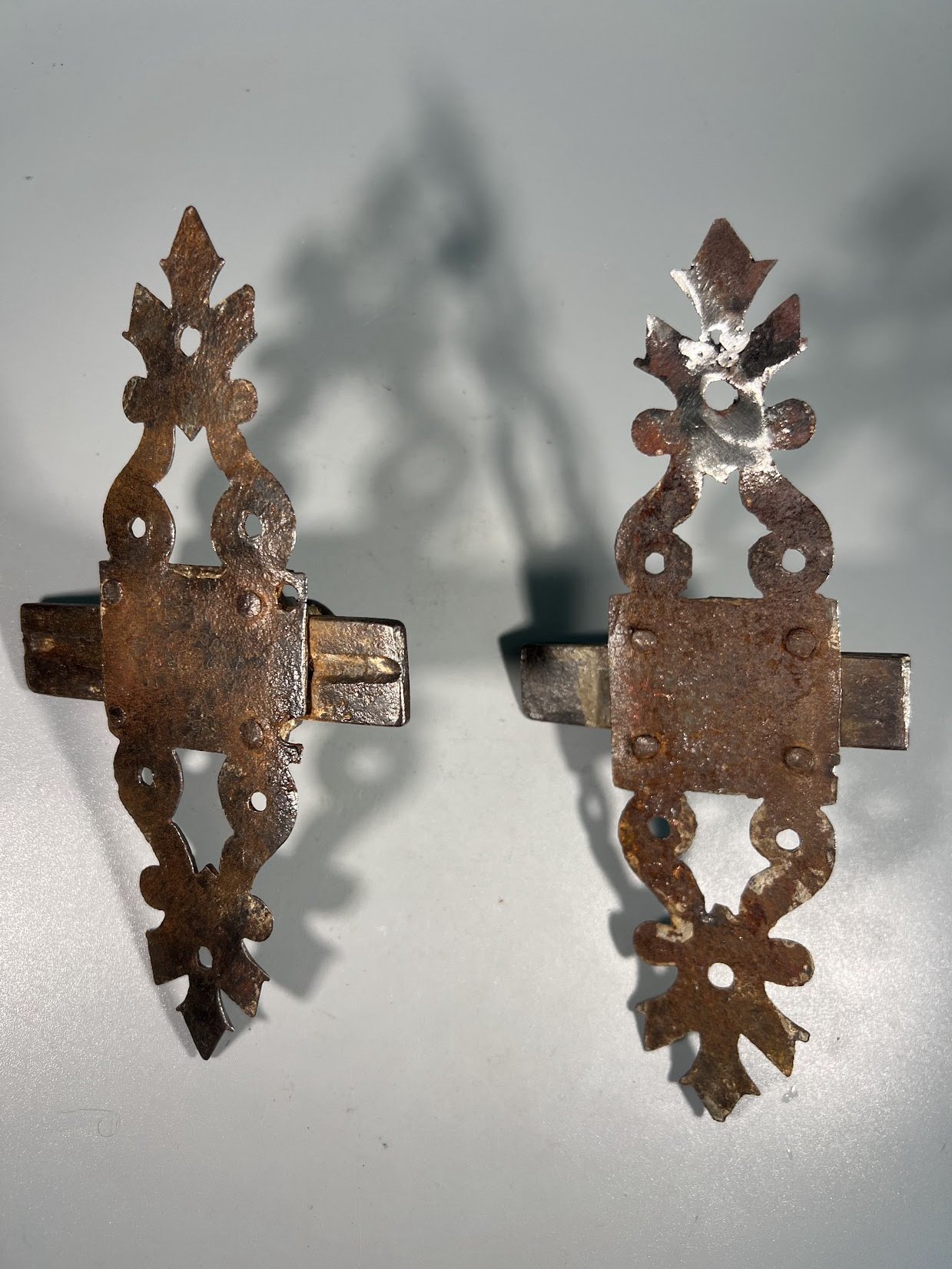 Skląstis durų metalinis, antikvarinis, prancūziškas. 2 vnt. Didesnio pagrindo aukštis 19, plotis 5 cm. Mažesnio pagrindo aukštis 16, plotis 4,5 cm. Kaina po 23