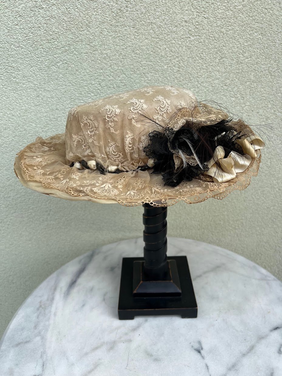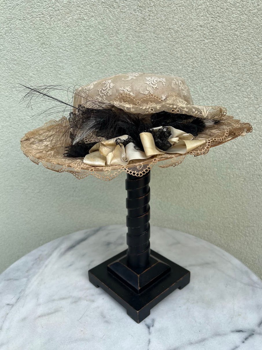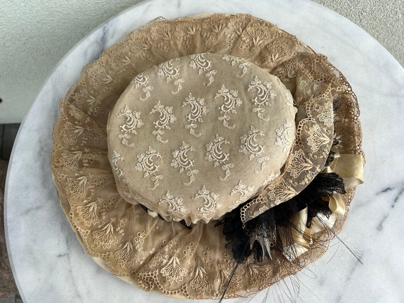Senovinė, antikvarinė moteriška skrybėlė, pagaminta iš šviesiai smėlio spalvos nėrinių. Skrybėlės viršus yra dekoruotas gėlėtais nėrinių raštais, o kraštas platėjantis ir taip pat puoštas nėriniais, suteikiančiais jai vintažinės elegancijos. Vienoje pusėje skrybėlė dekoruota tamsiai juodomis plunksnomis ir šviesiomis, galbūt šilkinėmis, gėlės formos detalėmis. Šis stilius yra būdingas vėlyvojo XIX ar ankstyvojo XX amžiaus laikotarpiui.