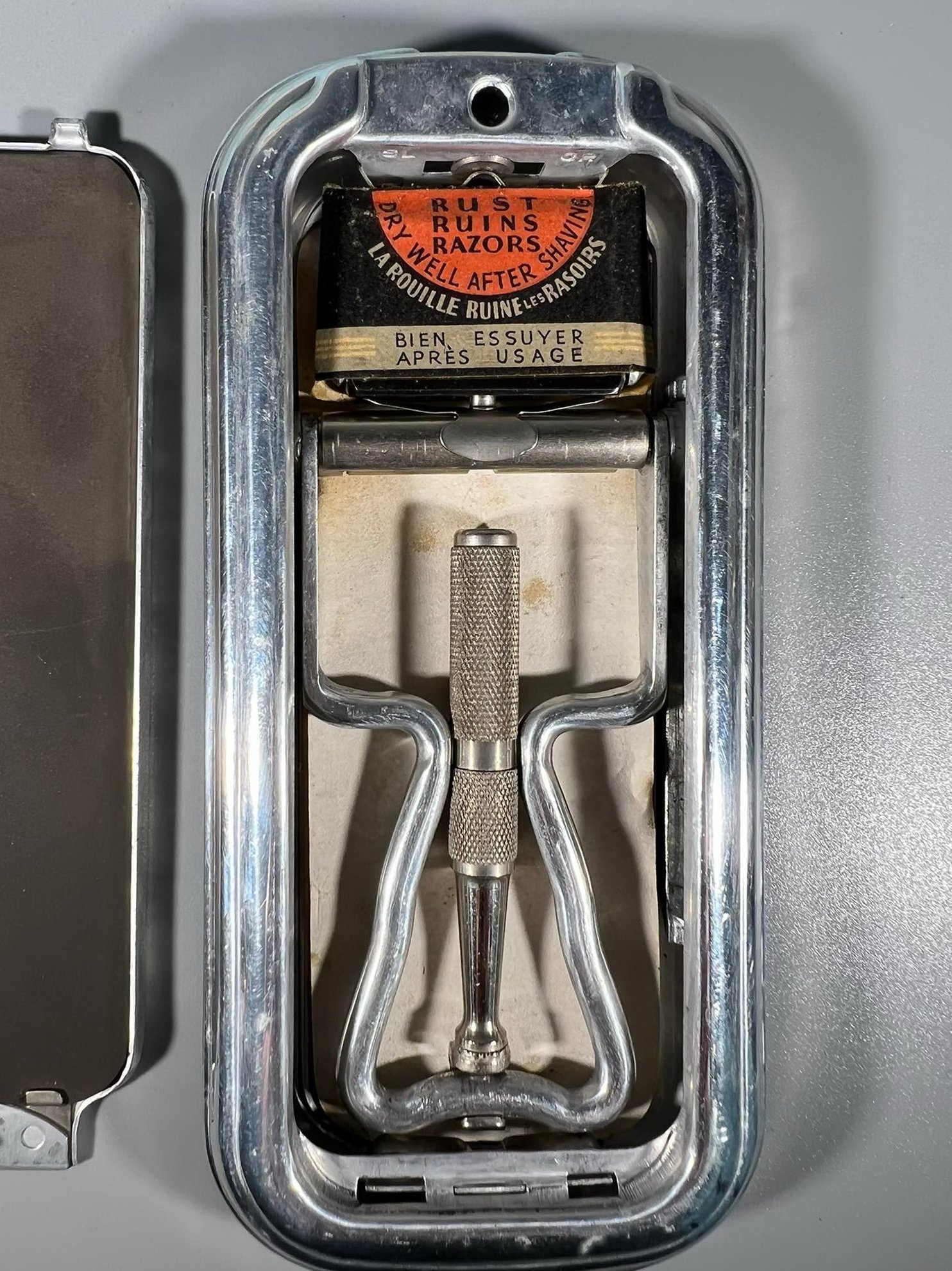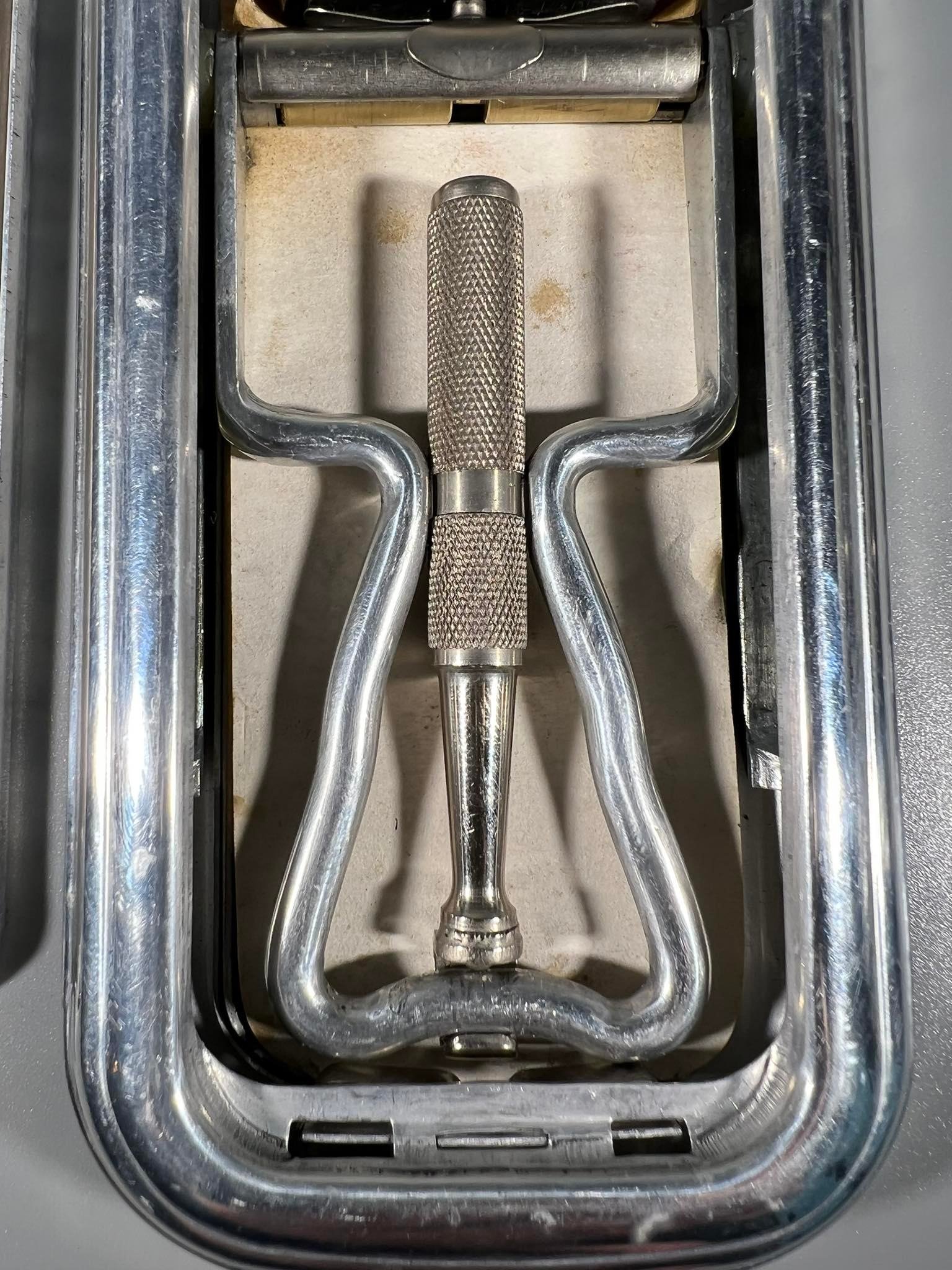 Skutimosi peiliukų galastuvas originalioje pakuotėje su dokumentais, vintažinis, angliškas. Kaina 87