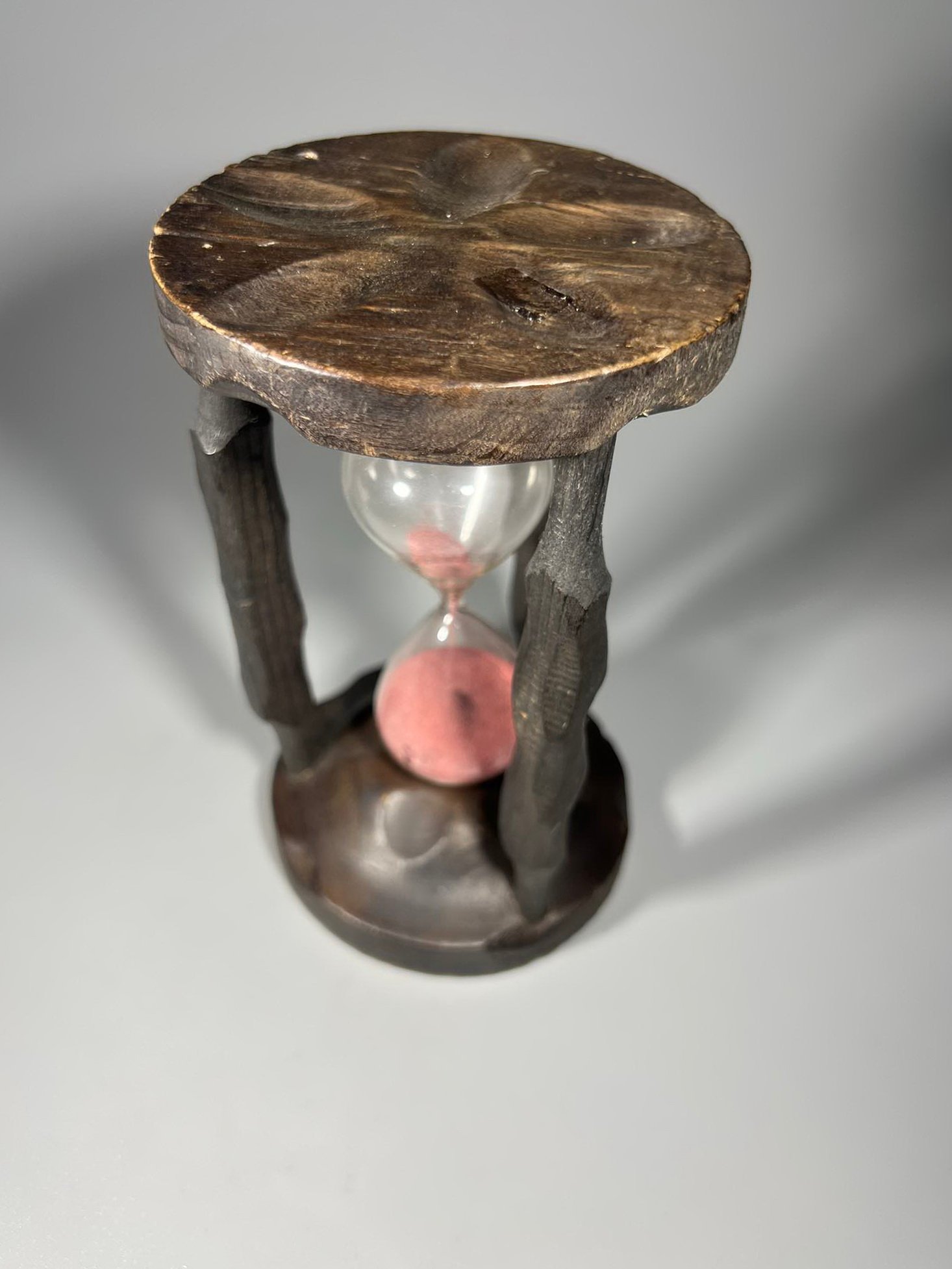 Smėlio laikrodis medinis. Aukštis 15, skersmuo 9 cm. Kaina 38