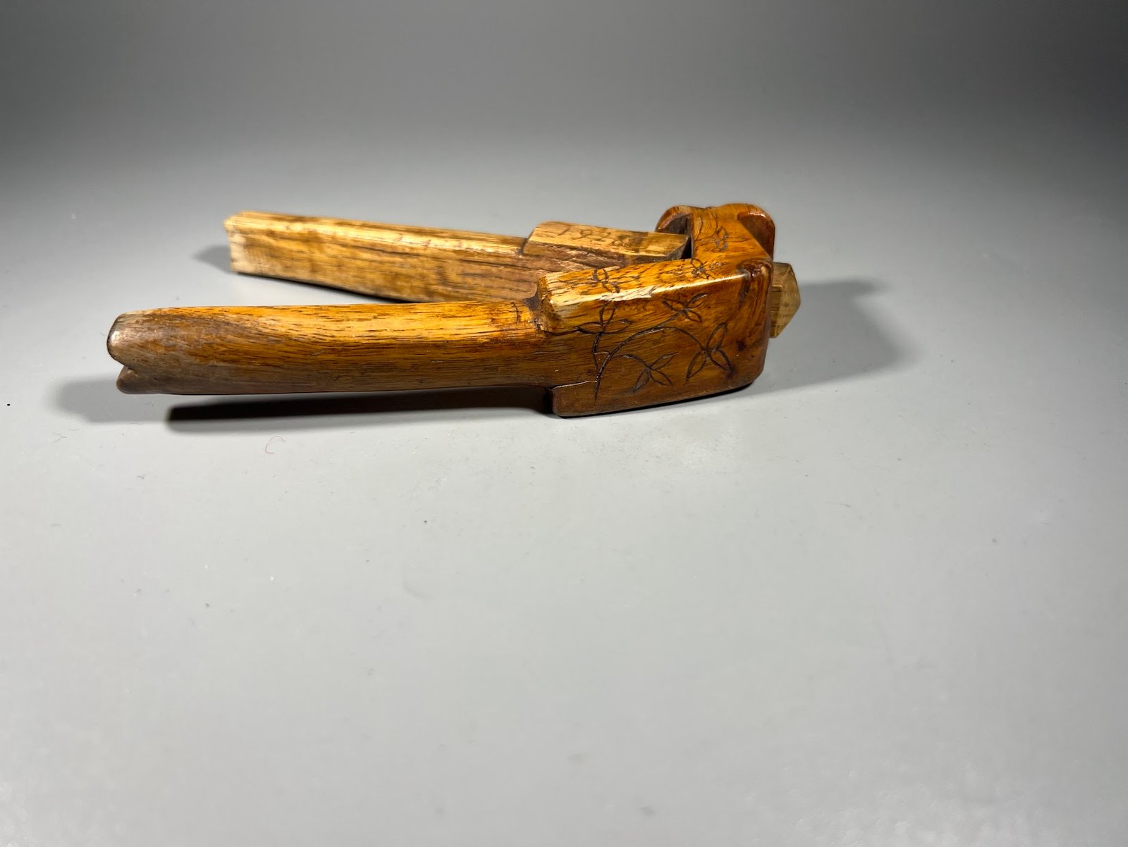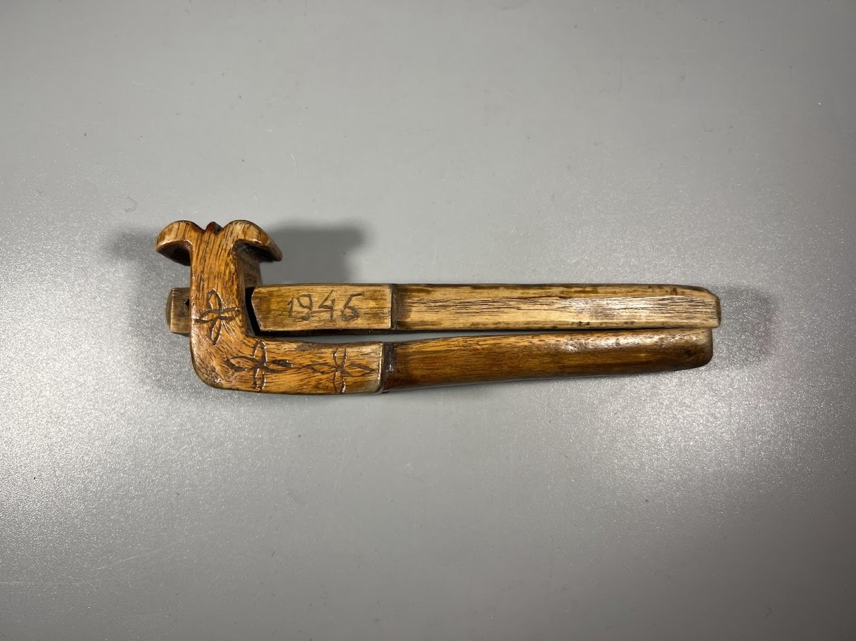 Spaustukai riešutams gliaudyti, riešutų gliaudyklė drožinėta, lietuviška, 1928-1946 m. Ilgis 12 cm. Kaina 63