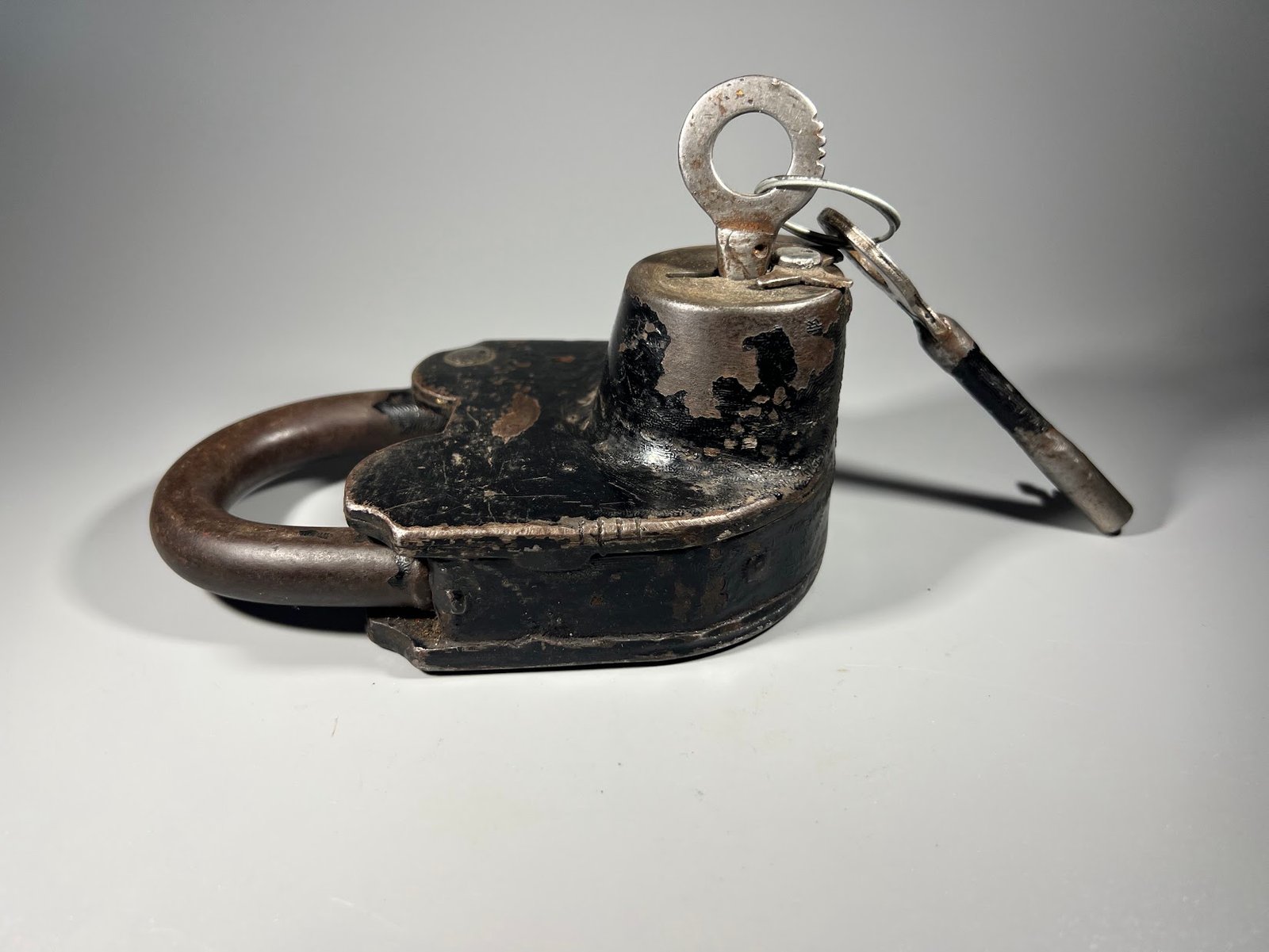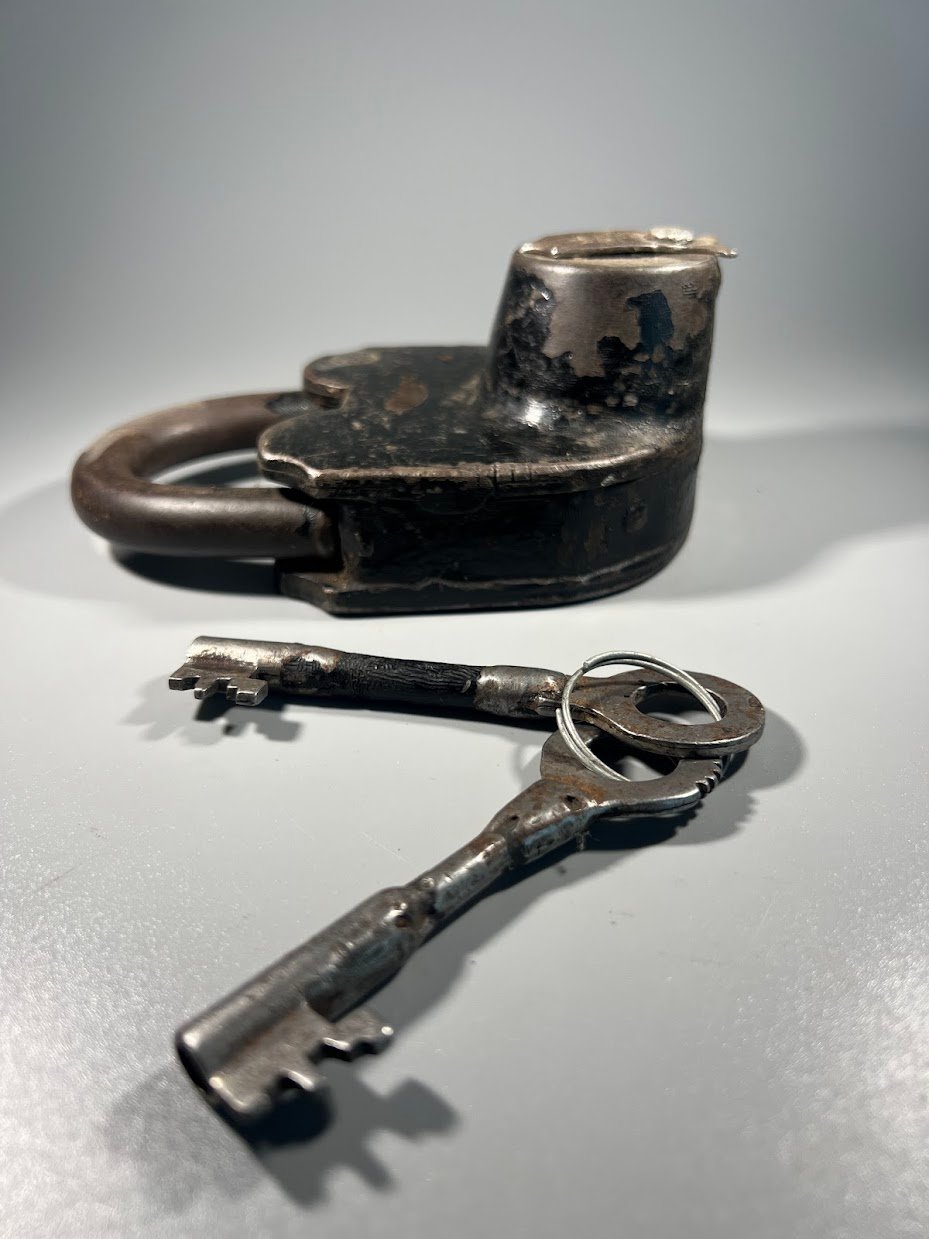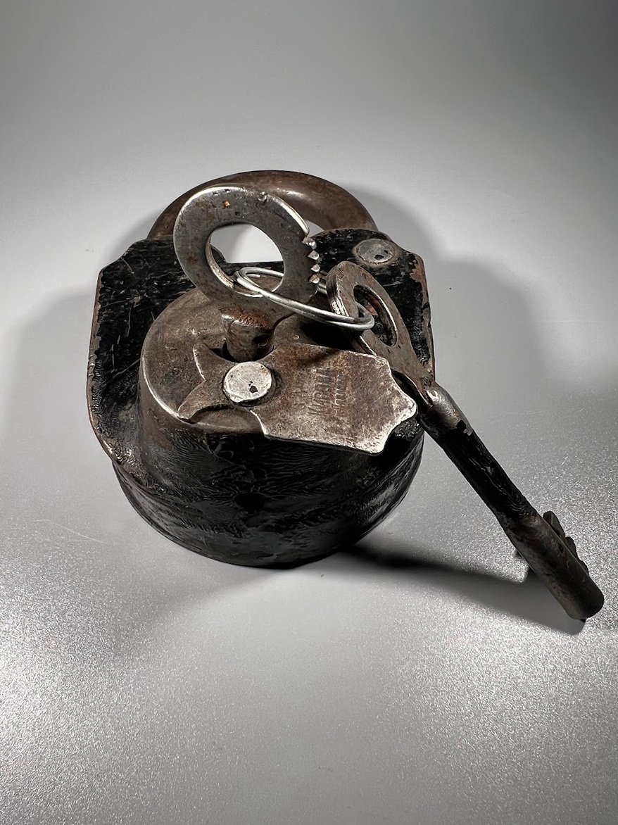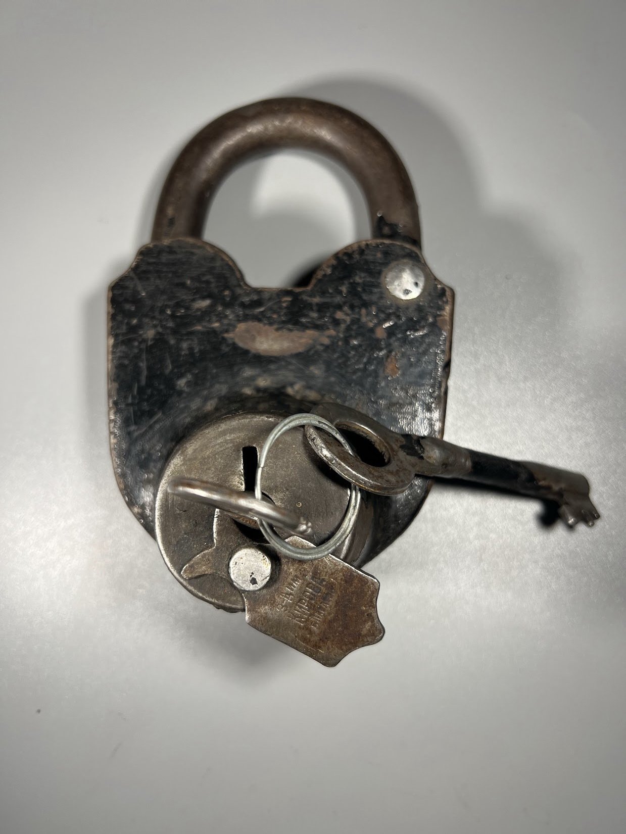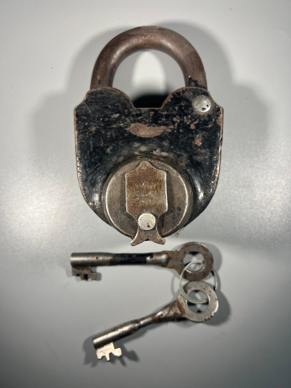 Spyna neįprasta, su 2 raktais, masyvi, stambi, 1,6 kg., sovietinė, tarybinių laikų, Kirovo gamykla Pavlove. З-д им. КИРОВА г. ПАВЛОВО. 1956 m. Aukštis 15, plotis 10, stiris 7 cm. Kaina 83