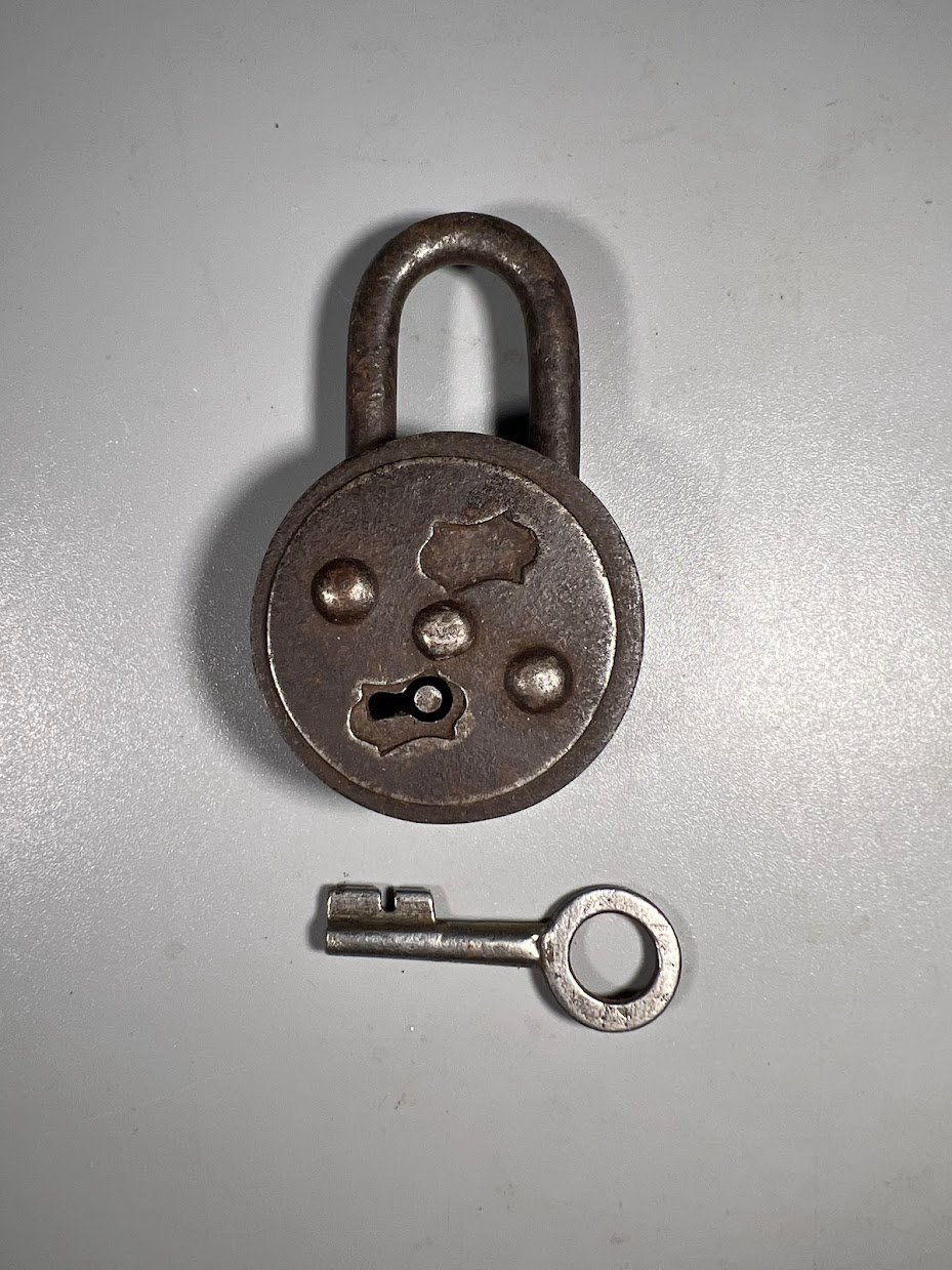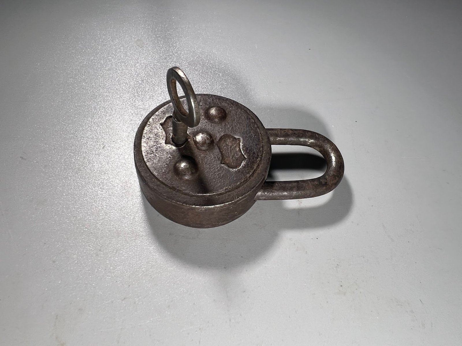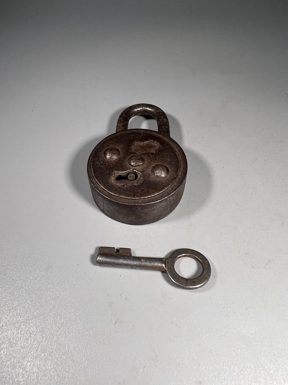 Spynelė antikvarinė, metalinė. Viso aukštis 6,5 cm. Storis 1,8 cm. Kaina 28
