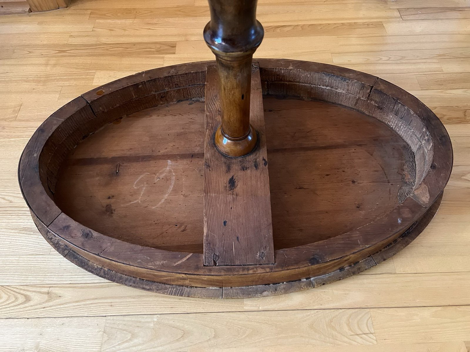 Stalas antikvarinis, medžio masyvo dengtas lukštu. Aukštis 73, ilgis 75, plotis 47 cm. Kaina 87