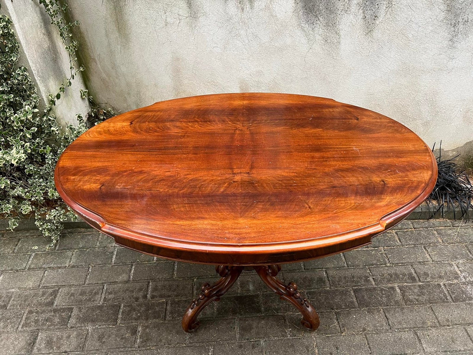 Stalas antikvarinis ovalus, valgomojo dailiai drožinėta koja. Aukštis 77, ilgis 103, plotis 81 cm. Kaina 368
