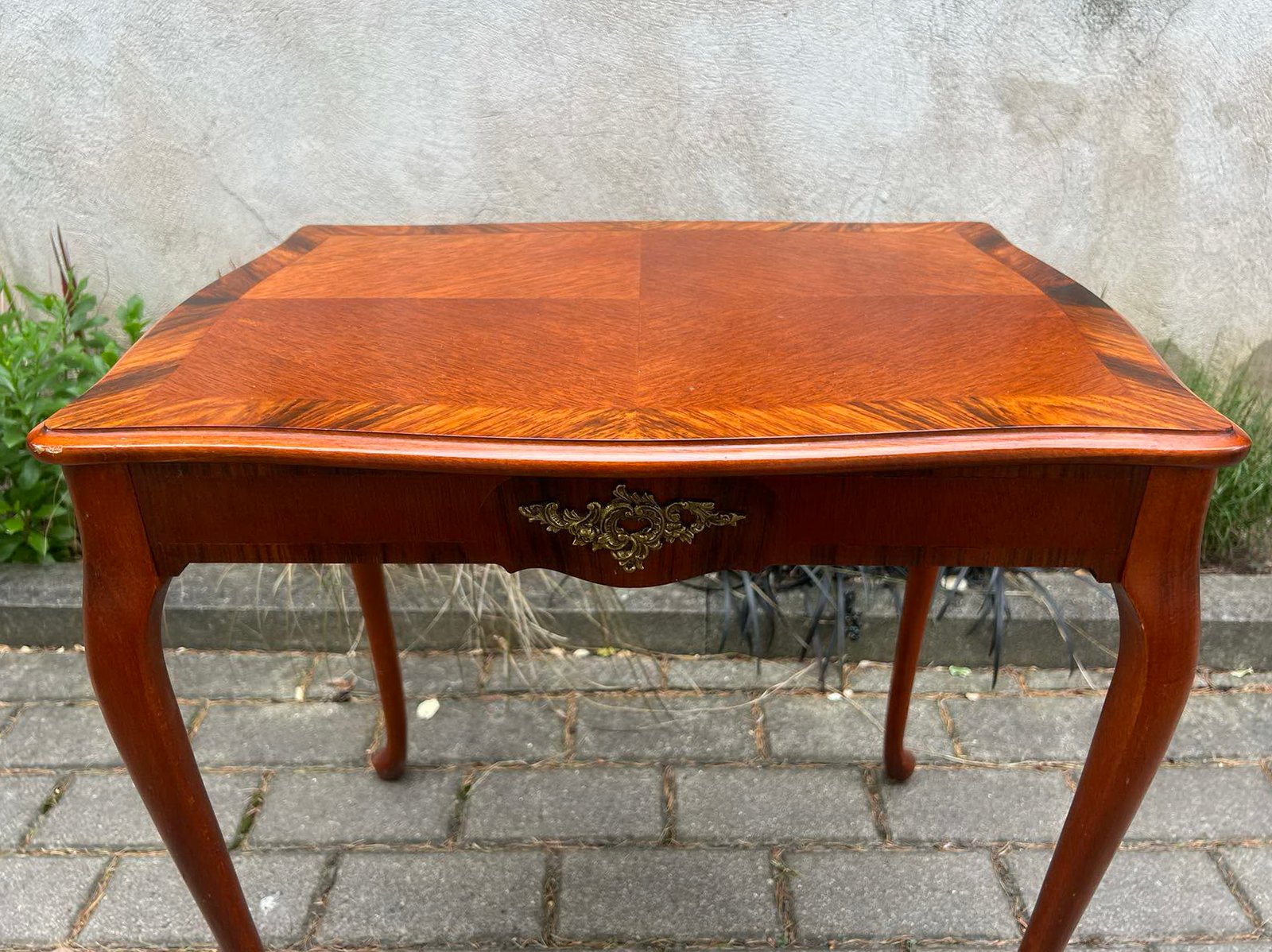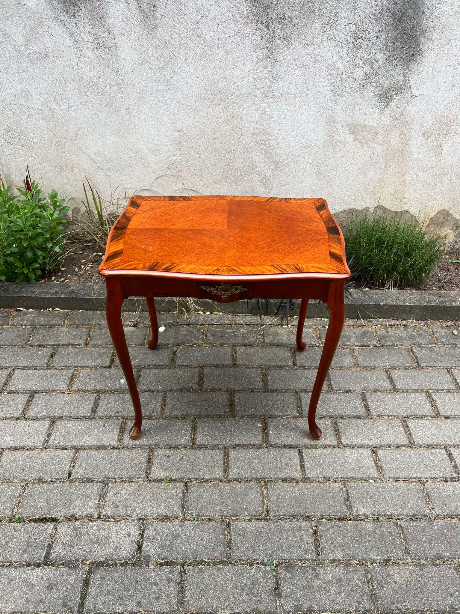 Stalas, kavos staliukas, stovelis keturkampis, puoštas bronza, tvirtas, medinis. Kaina 83