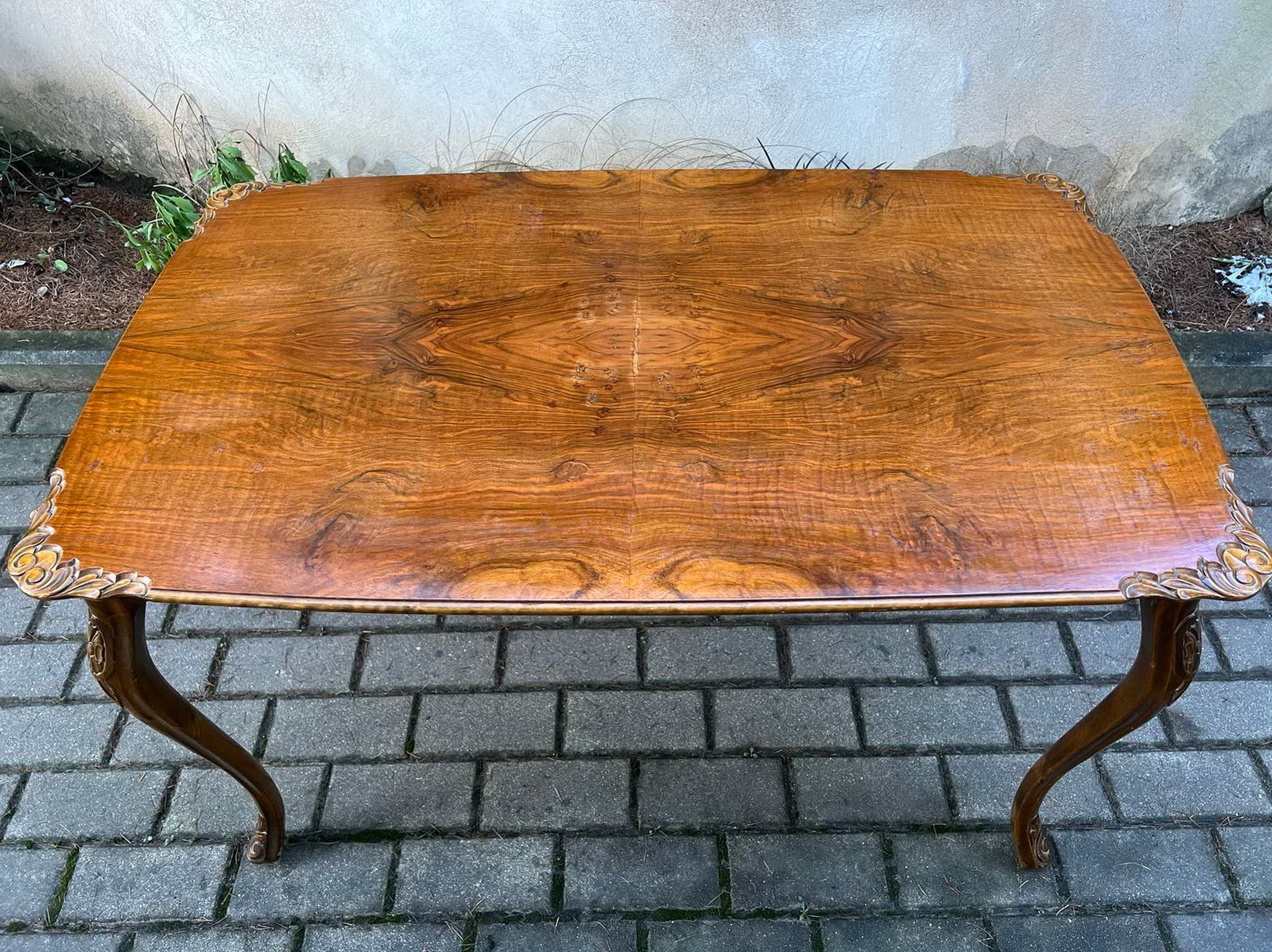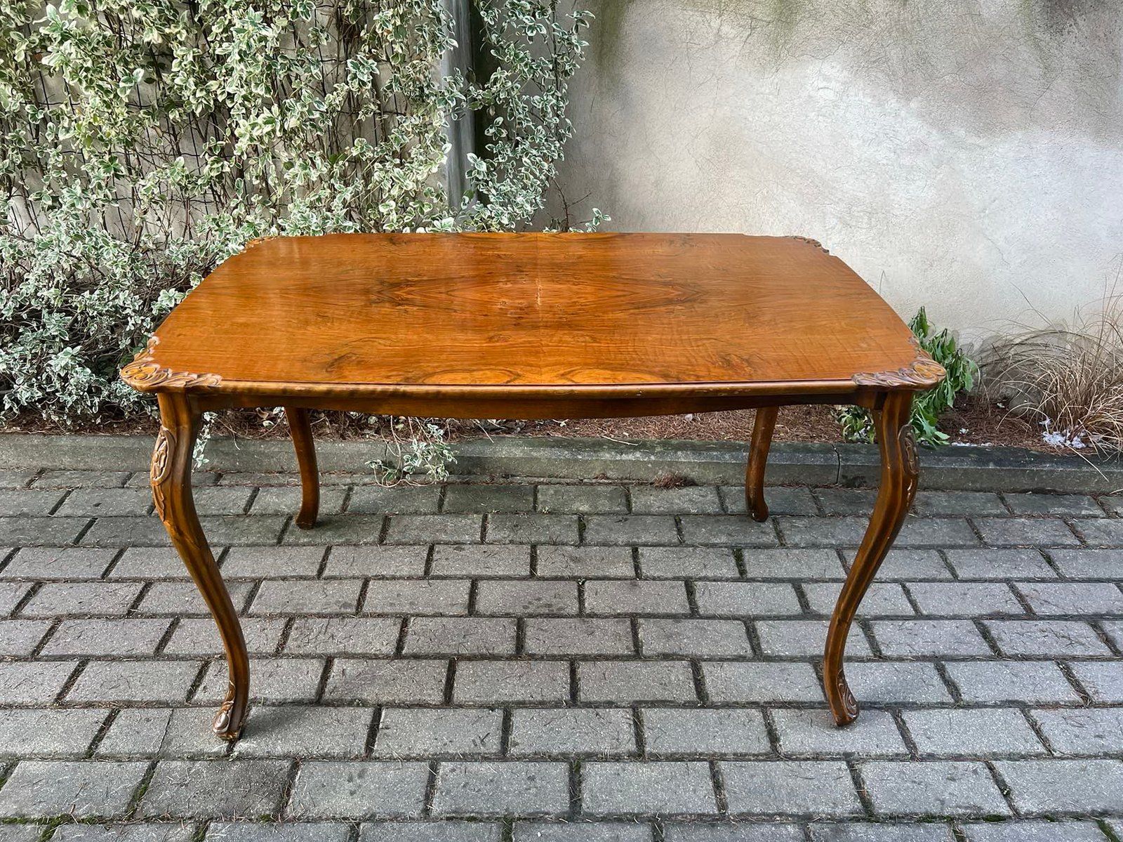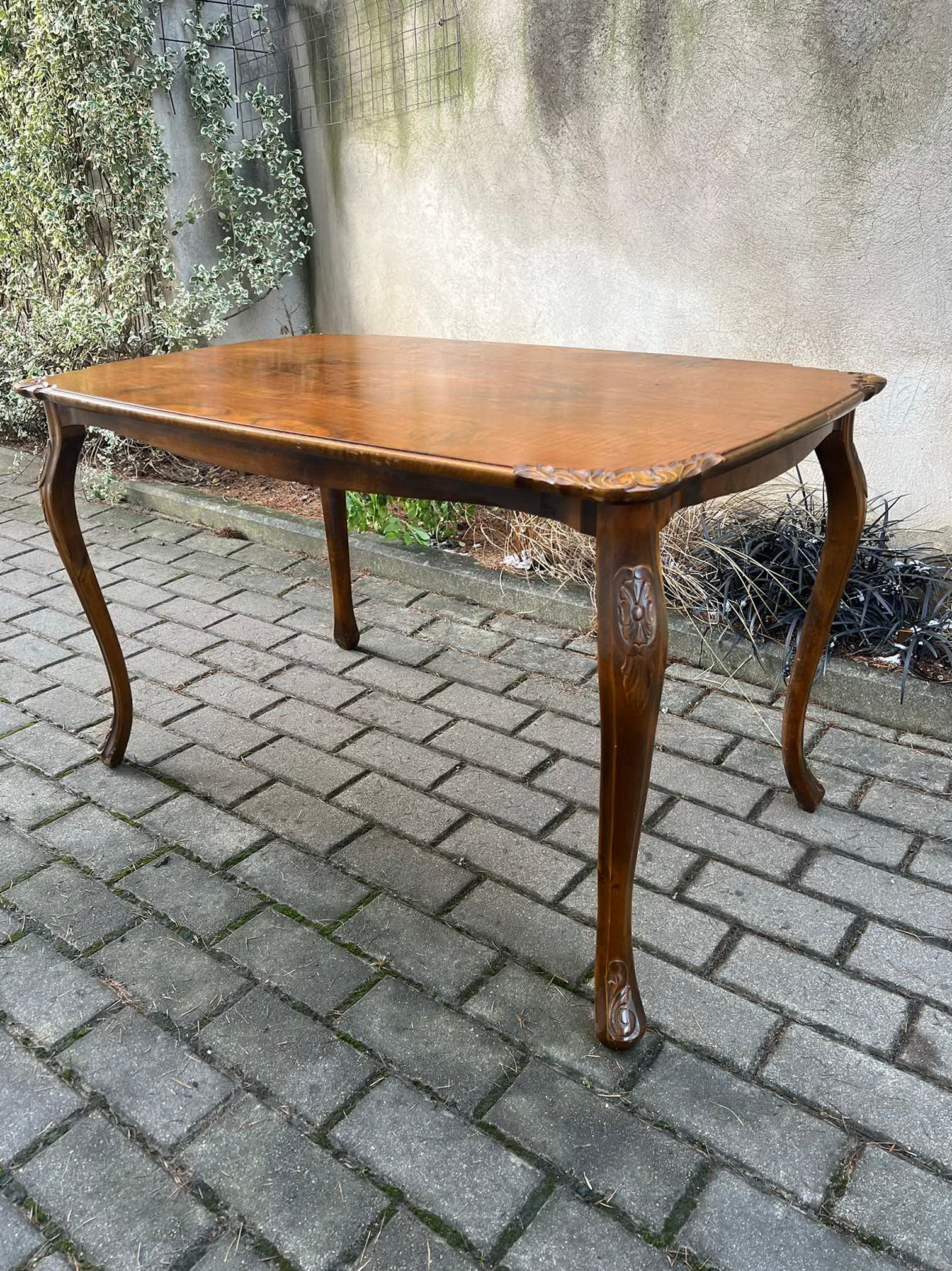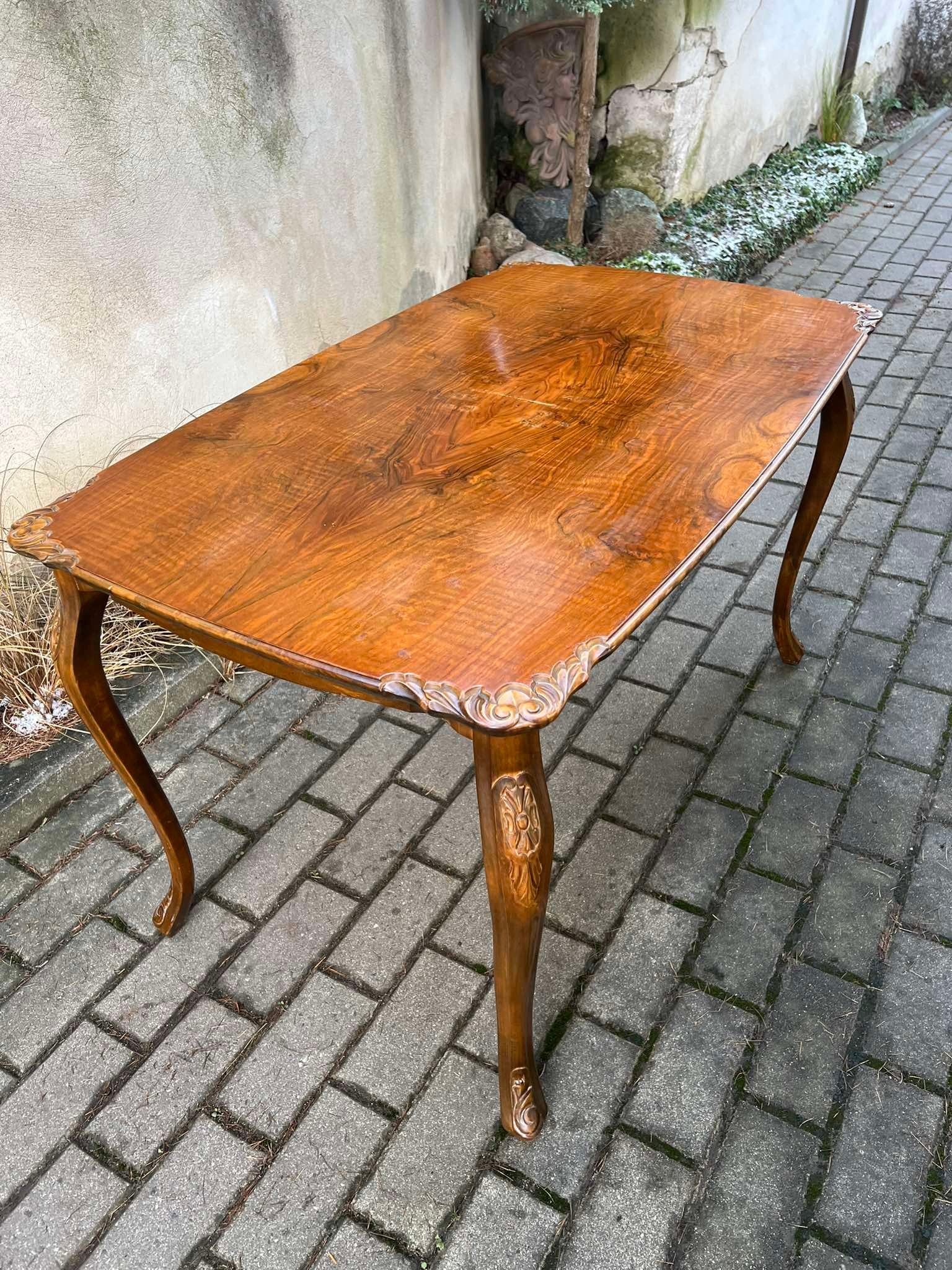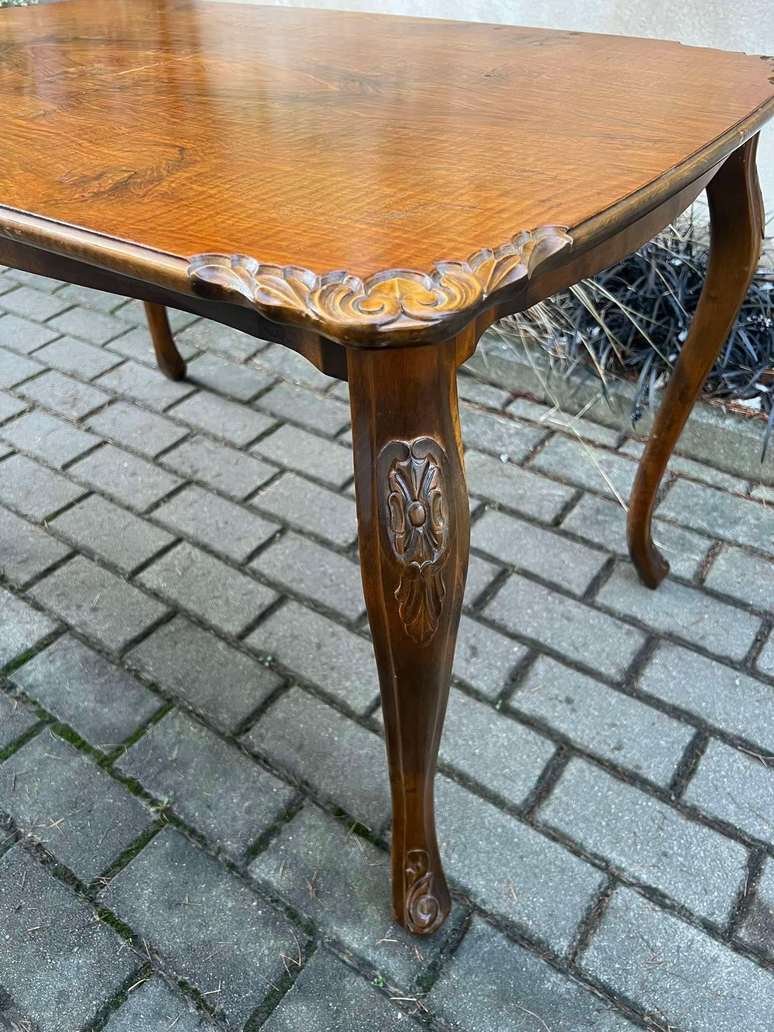 Stalas keturkampis kavos drožinėtais kraštais, antikvarinis, tvirtas. Aukštis 61, plotis 60, ilgis 100 cm. Kaina 138