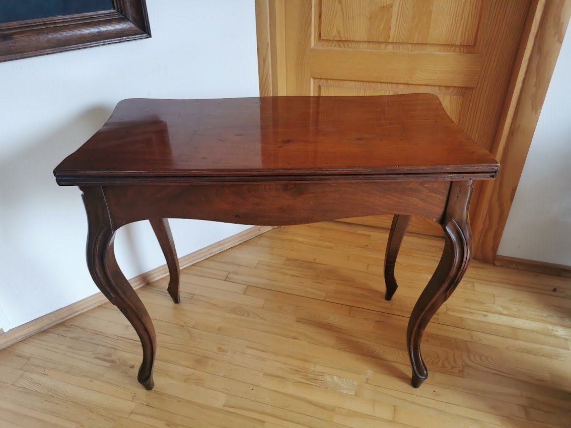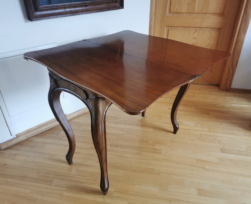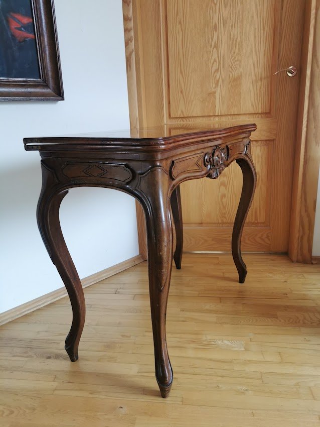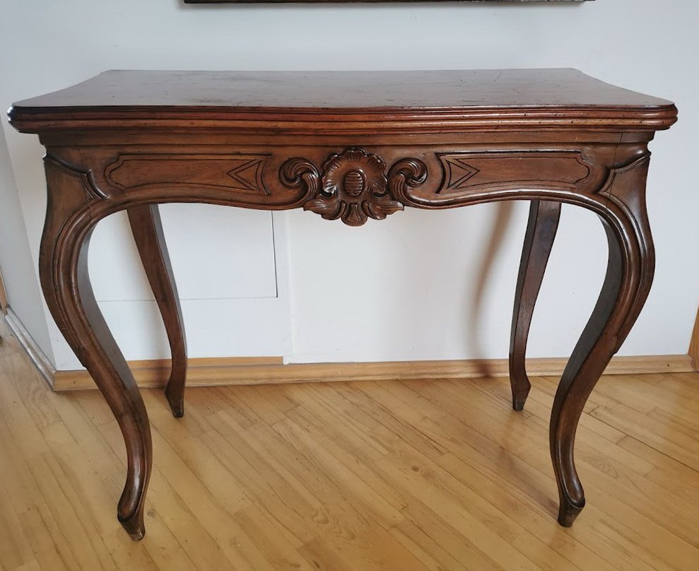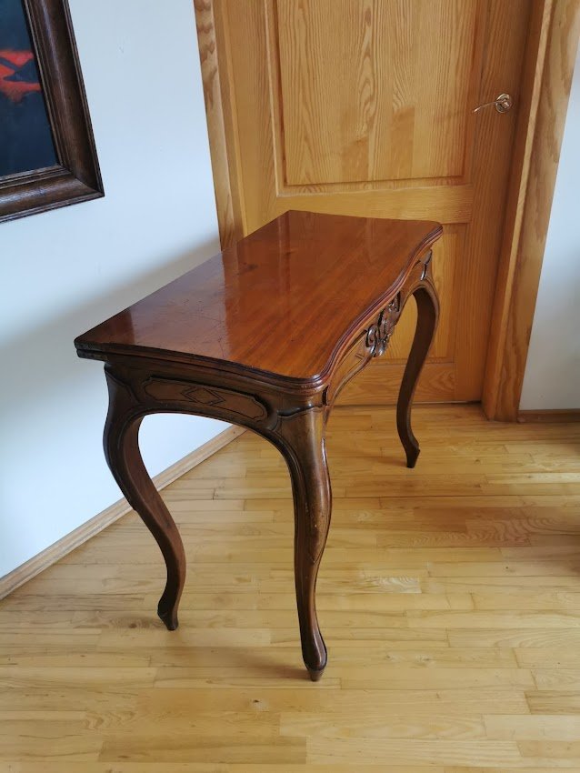 Stalas konsolė, žaidimų, lošimų staliukas išskleidžiamas, antikvarinis. Lomber (pr.. l’hombre, iš isp. k.). Tvirtas. Kaina 387