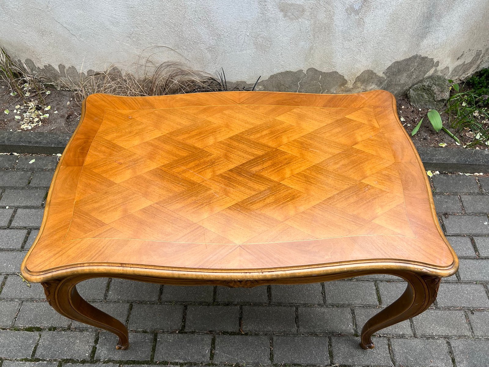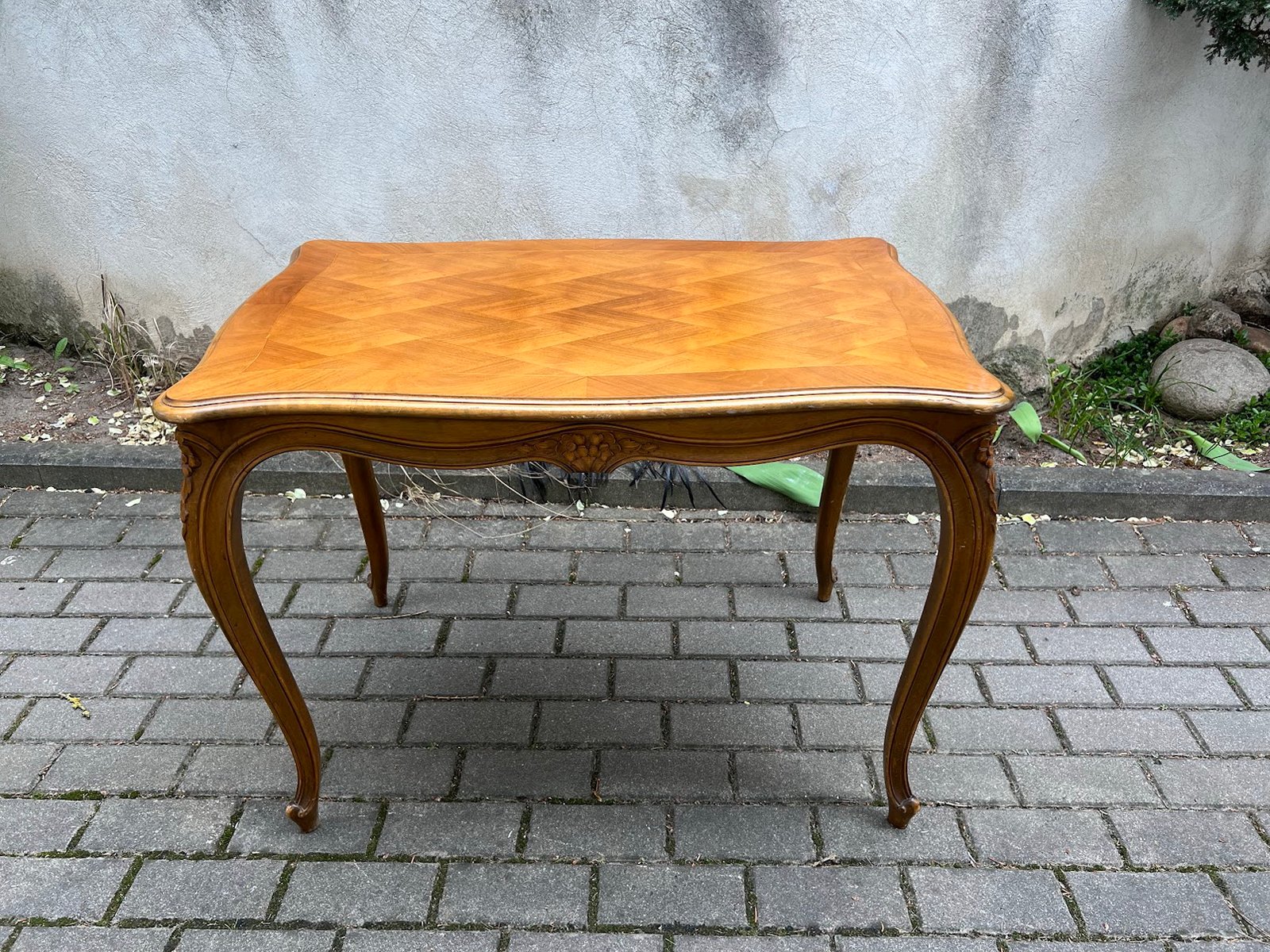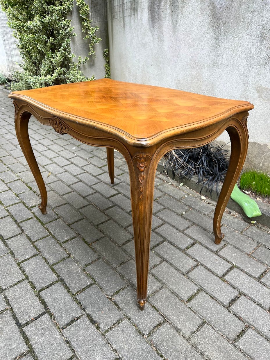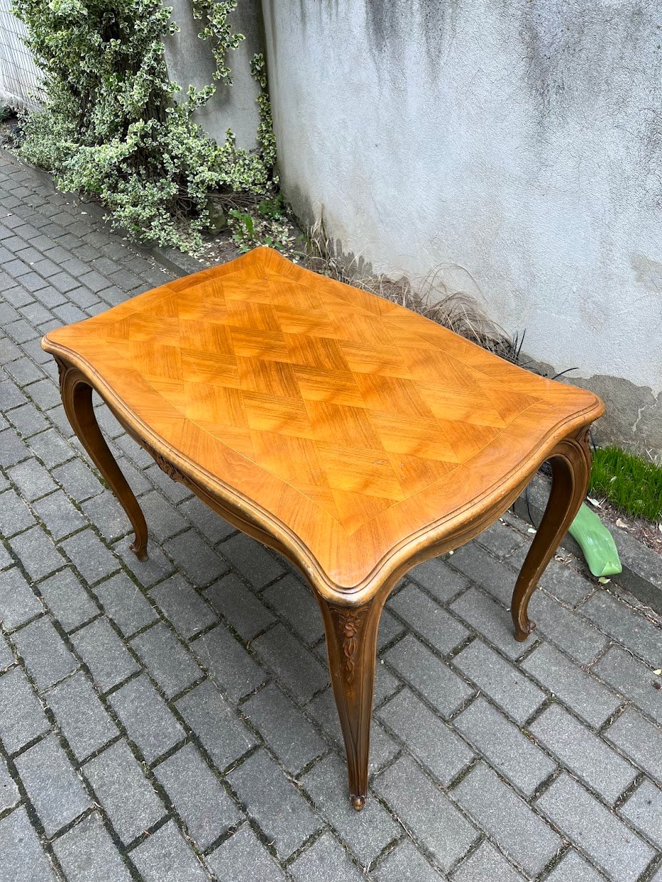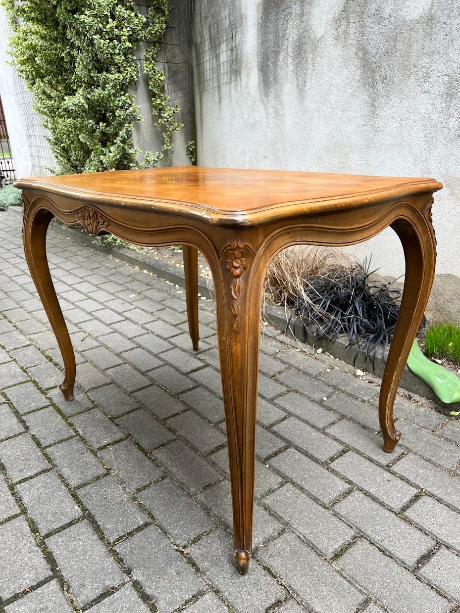 Stalas valgomojo, kavos staliukas prancūziškas, French Provincial style table, puoštas intarsijomis. Tvirtas. Kaina 93