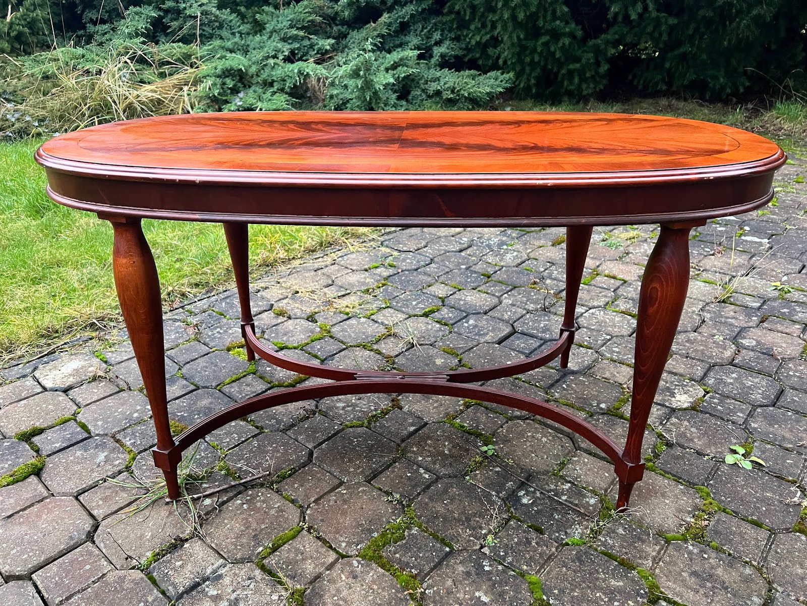 Staliukas, stalas ovalus, raudonmedžio faneruotės, angliško stiliaus. Aukštis 56, ilgis 110, plotis 59 cm. Kaina 96