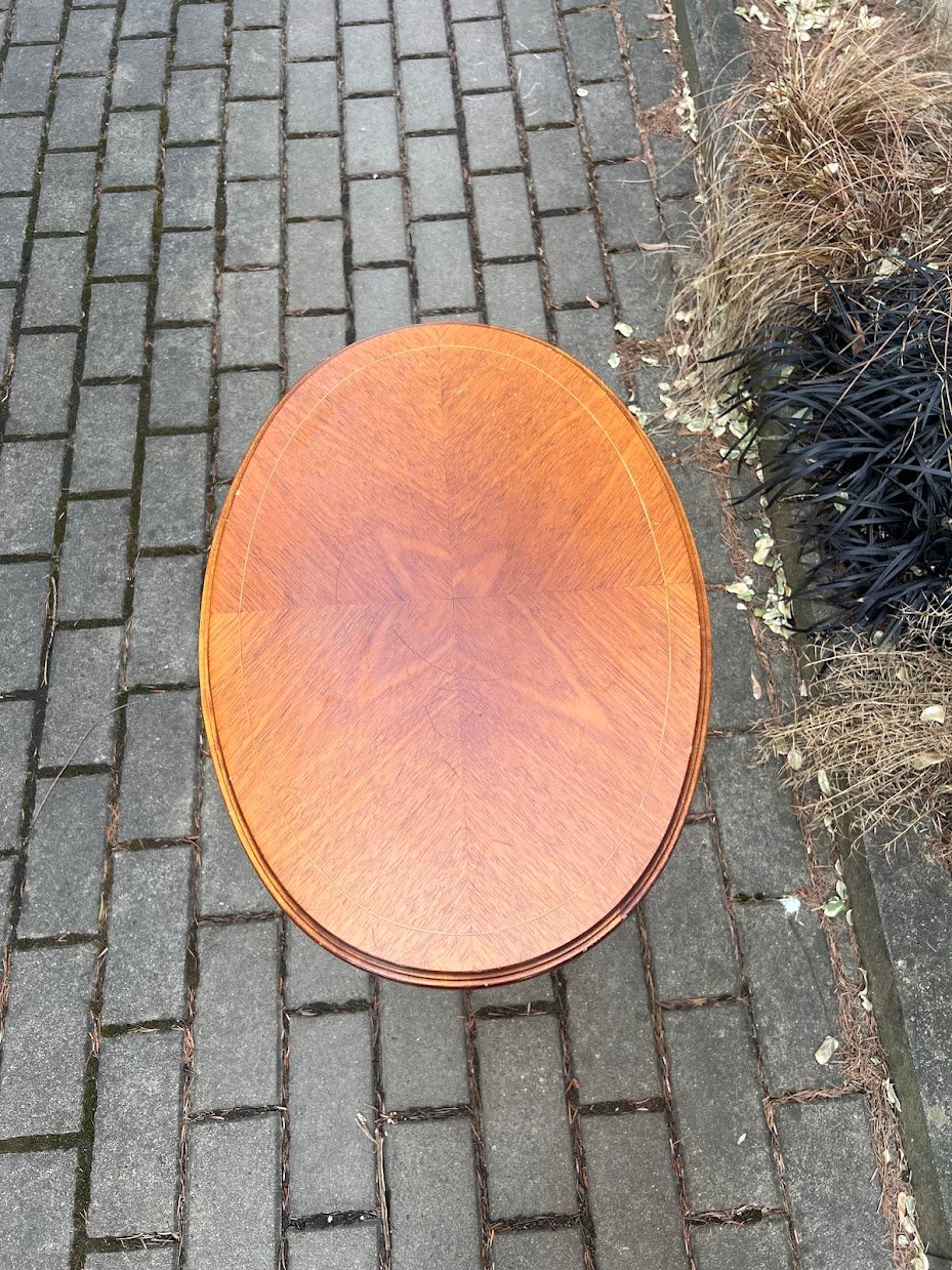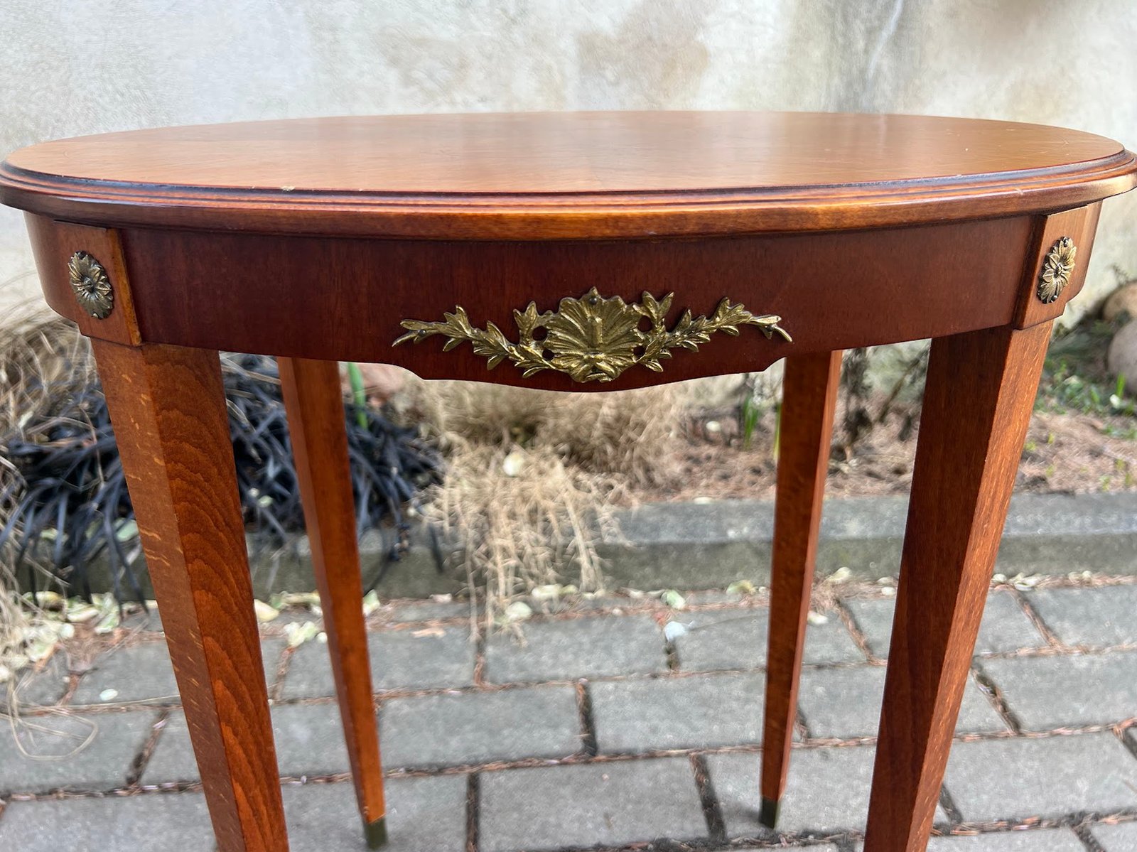 Staliukas ovalus, Ampyro stiliaus, inkrustuotas, puoštas bronza, nedidelis, kavos. Kaina 93
