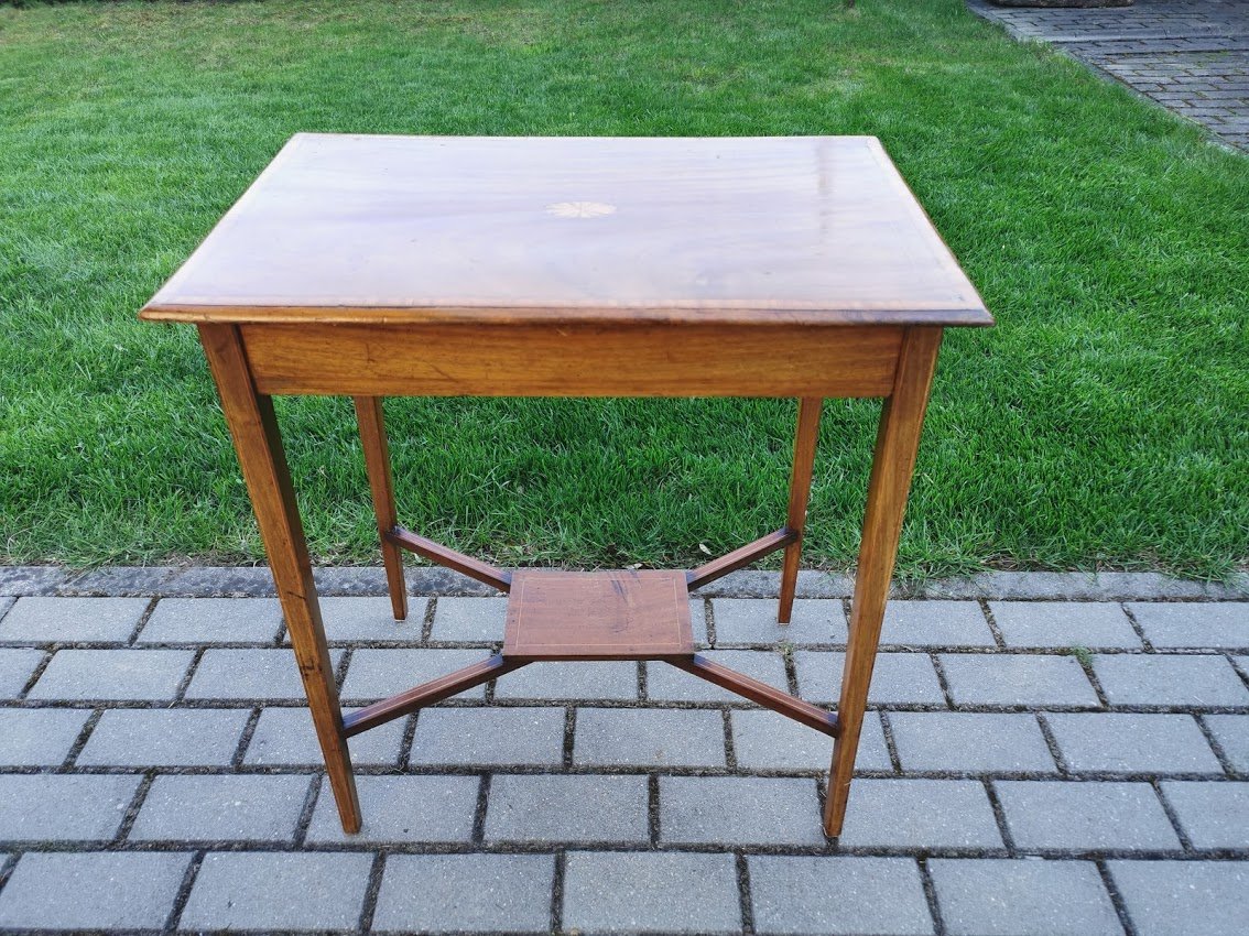 Staliukas puoštas intarsija, antikvarinis. Aukštis 68, stalviršio dydis 39 x60 cm. Kaina 112