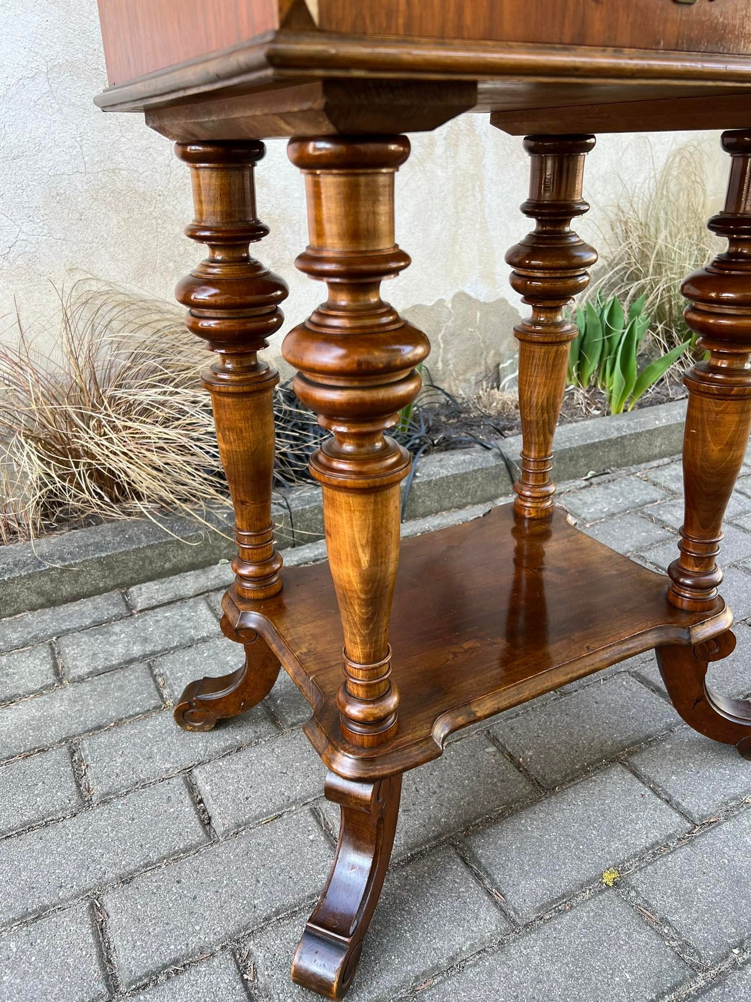 Stalelis siuvinėjimo, antikvarinis, restauruotas. Du rakinami stalčiai, atlenkiamas, veidrodis, siuviinių stalčiai. Aukštis 80, stalviršis 41 x 42 cm. Kaina 213