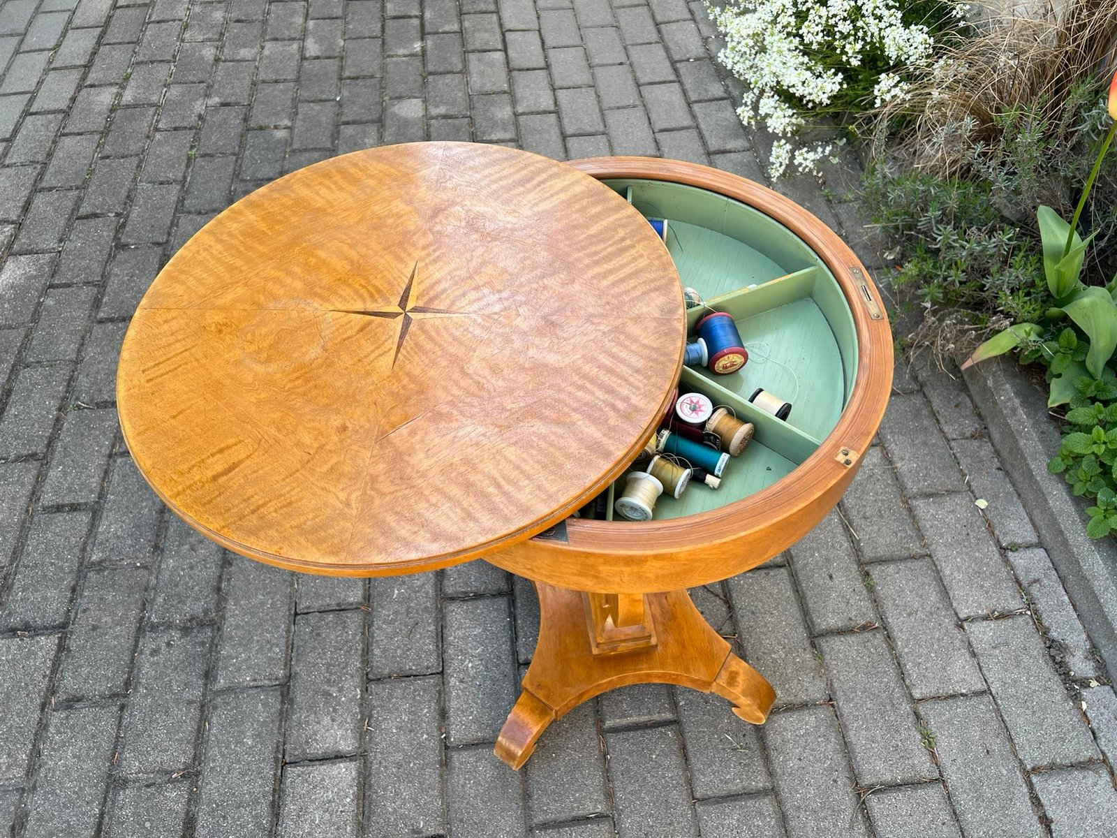 Staliukas siuvinėjimo, siūlinė, puoštas intarsija, antikvarinis stovelis, kavos staliukas. Kaina 138