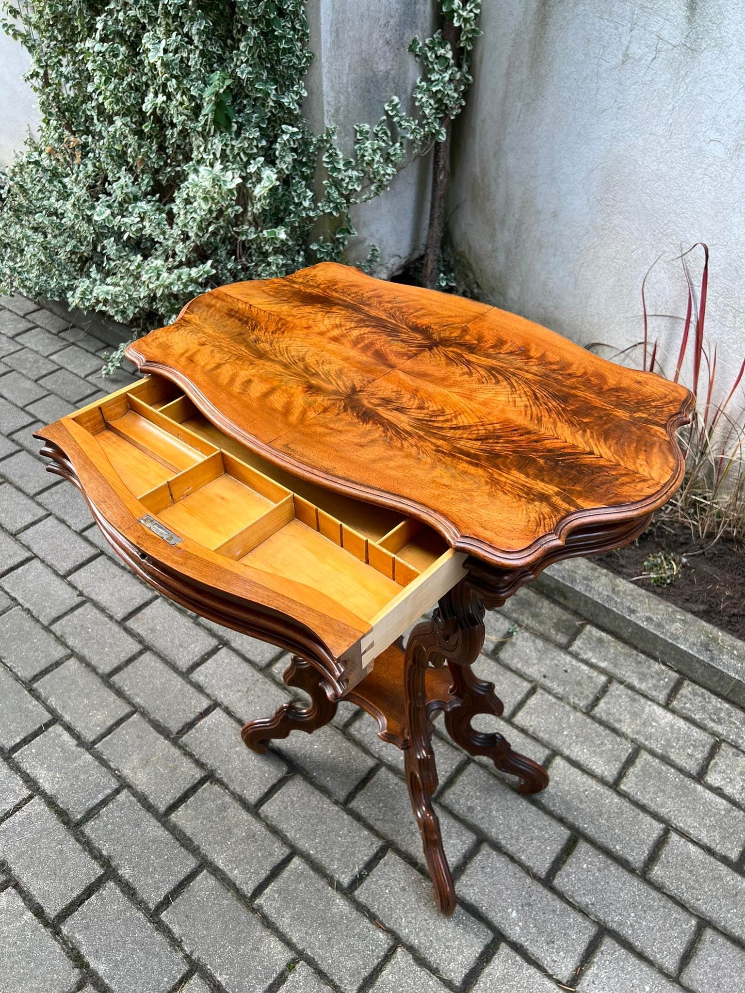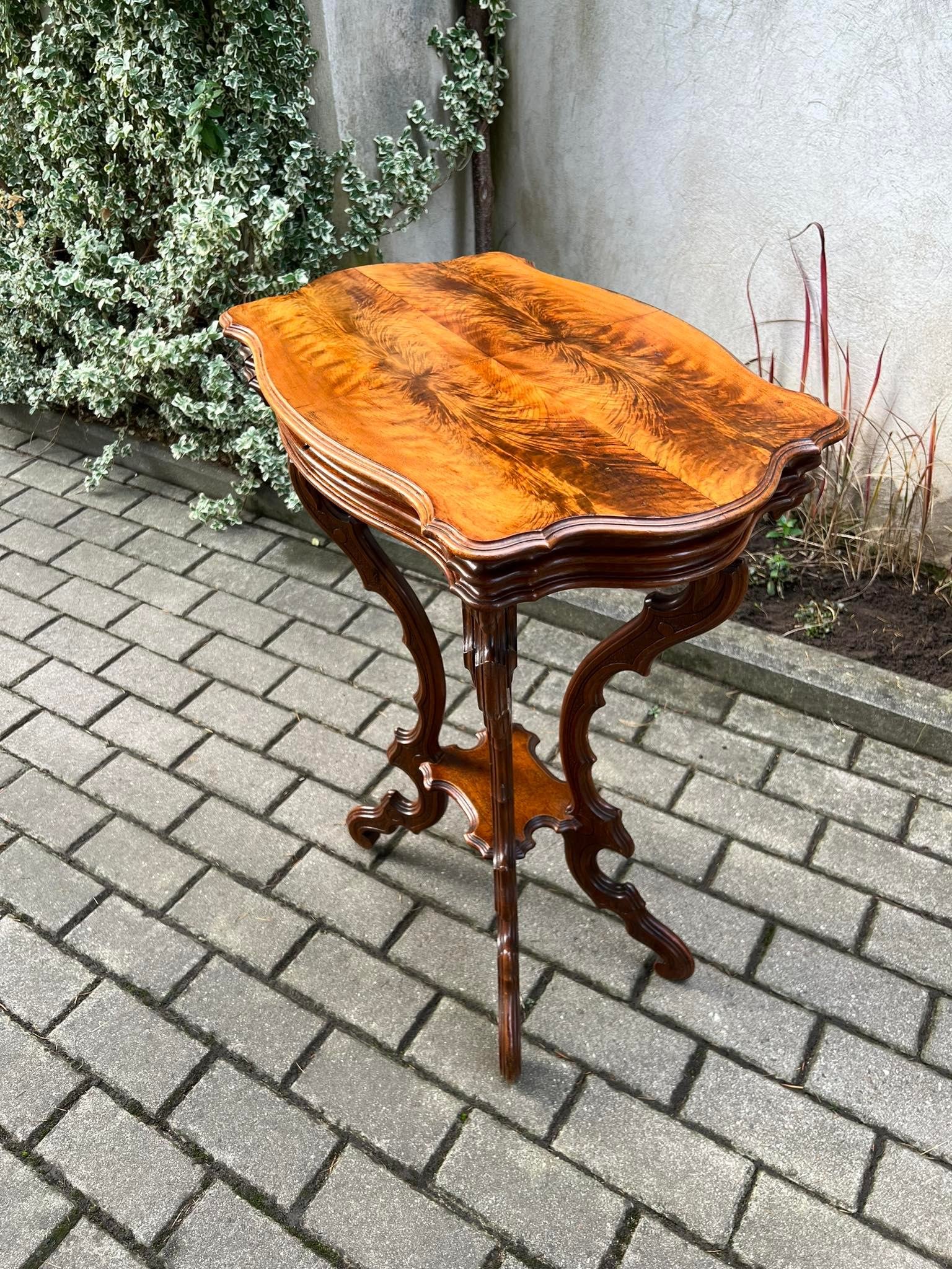 Staliukas, stovelis antikvarinis puoštas šaknies lukštu, drožinėtas su stalčiuku. Restauruotas. 1850–1890 m. Kaina 268