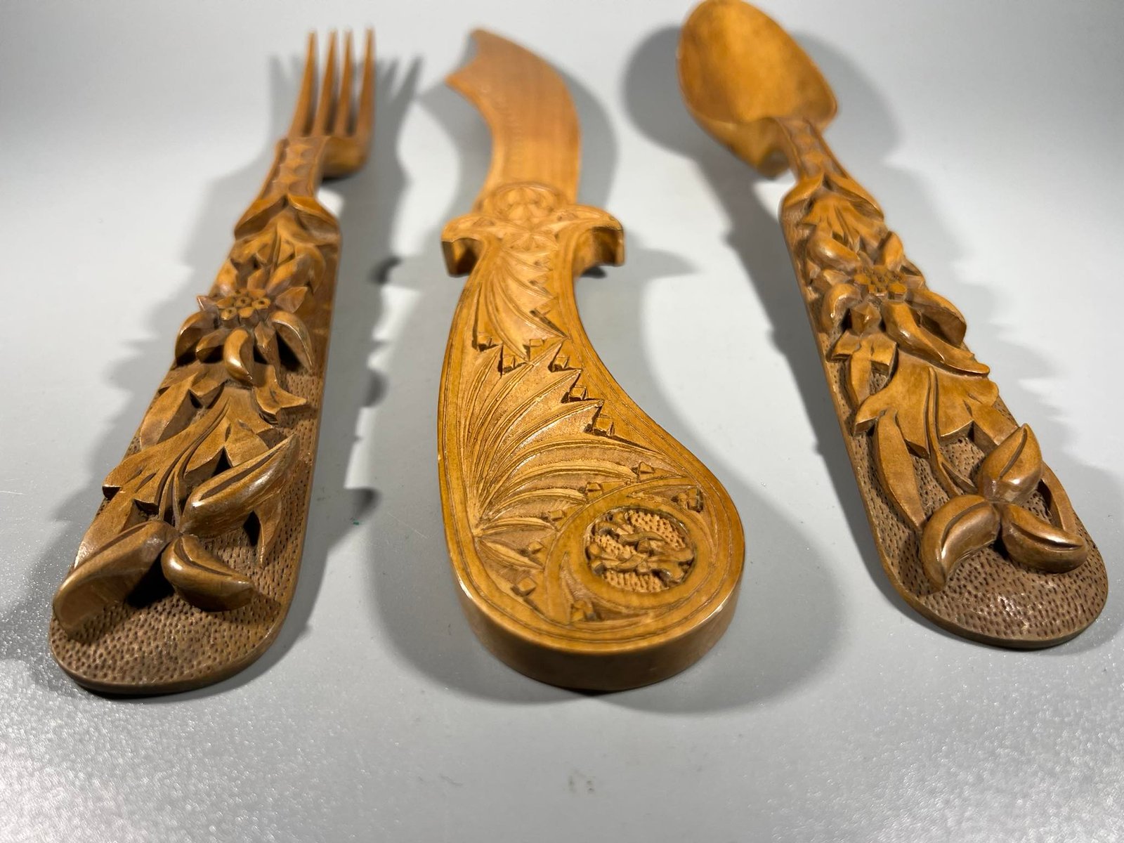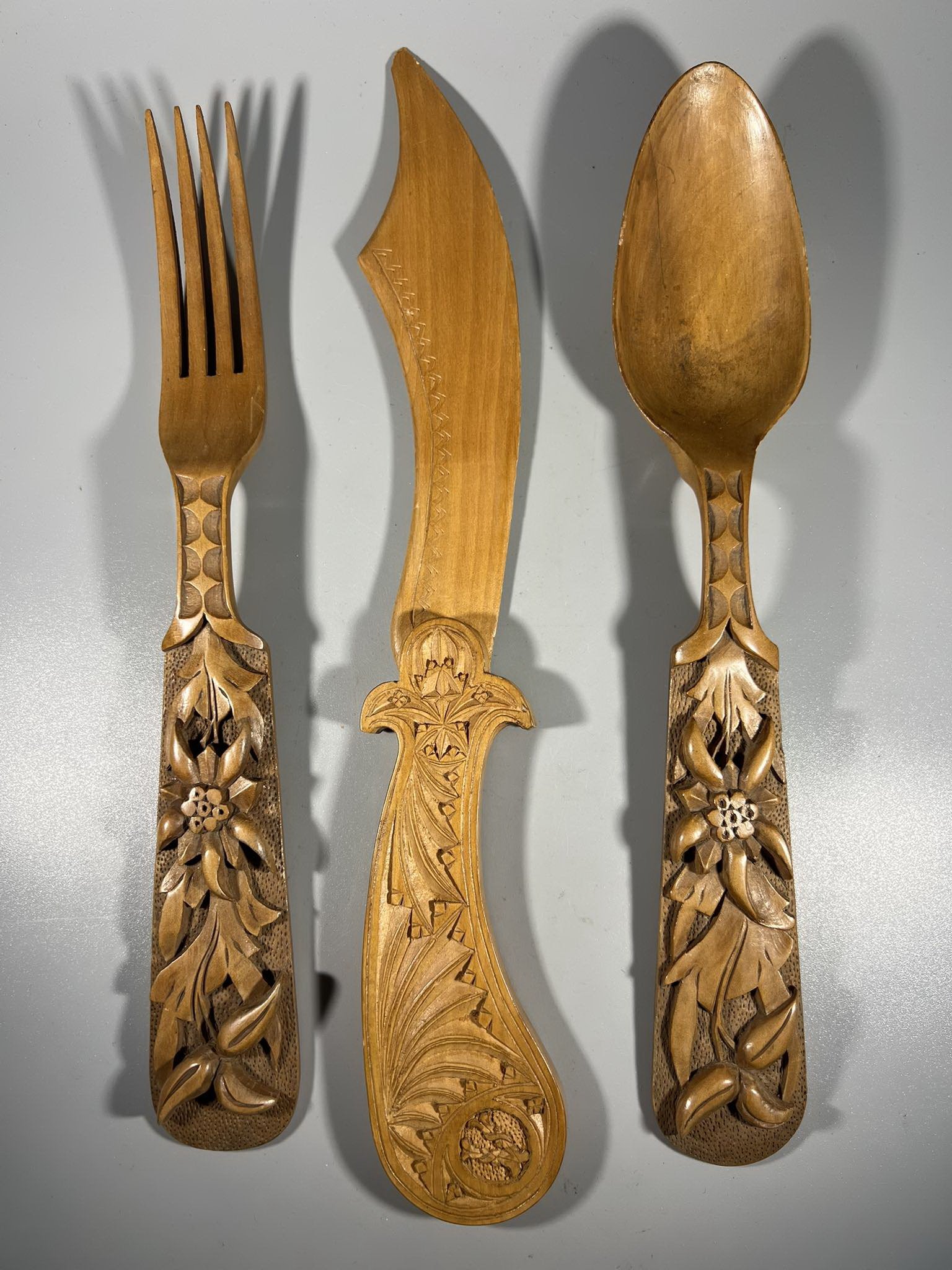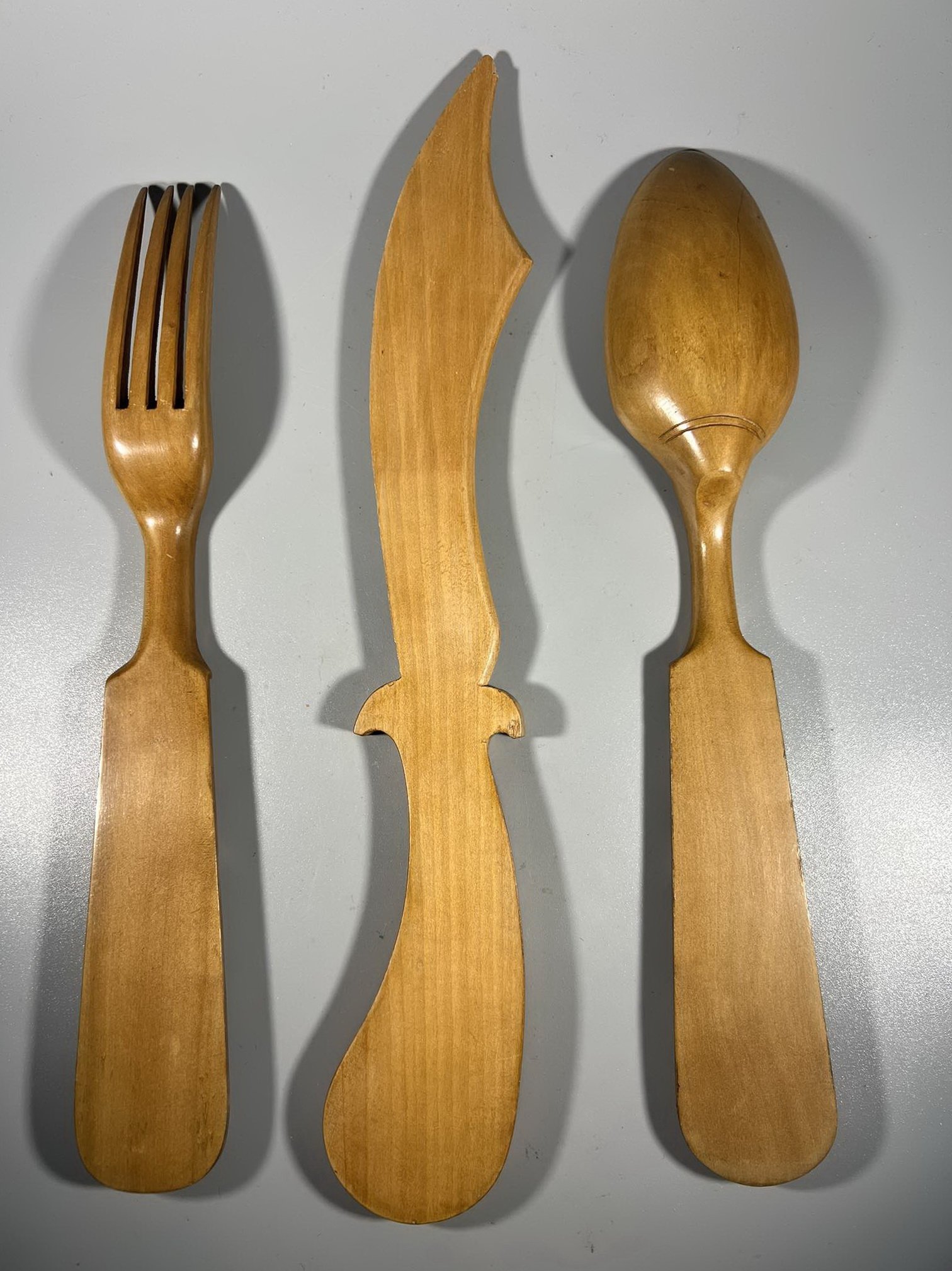 Stalo įrankiai, mediniai, drožinėti. 3 vnt. Kaina 26 už visus.