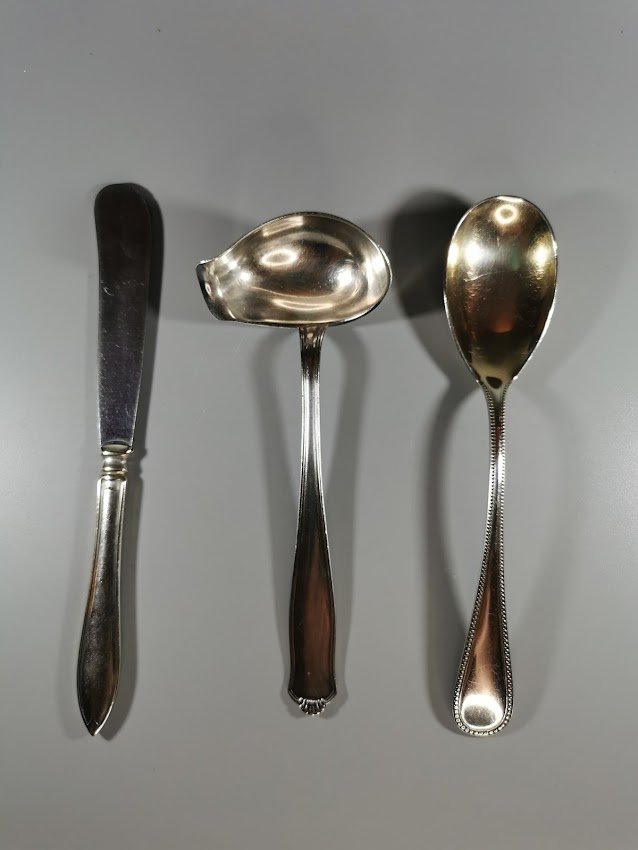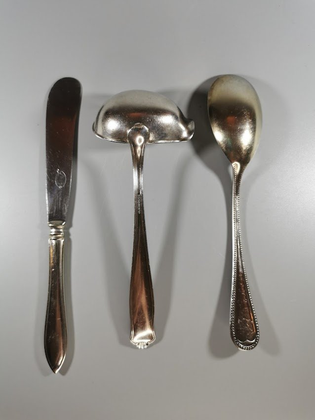 Stalo įrankiai sidabruoti, antikvariniai. 3 vnt. Kaina po 4 arba 8 už visus.