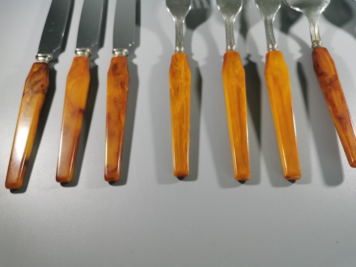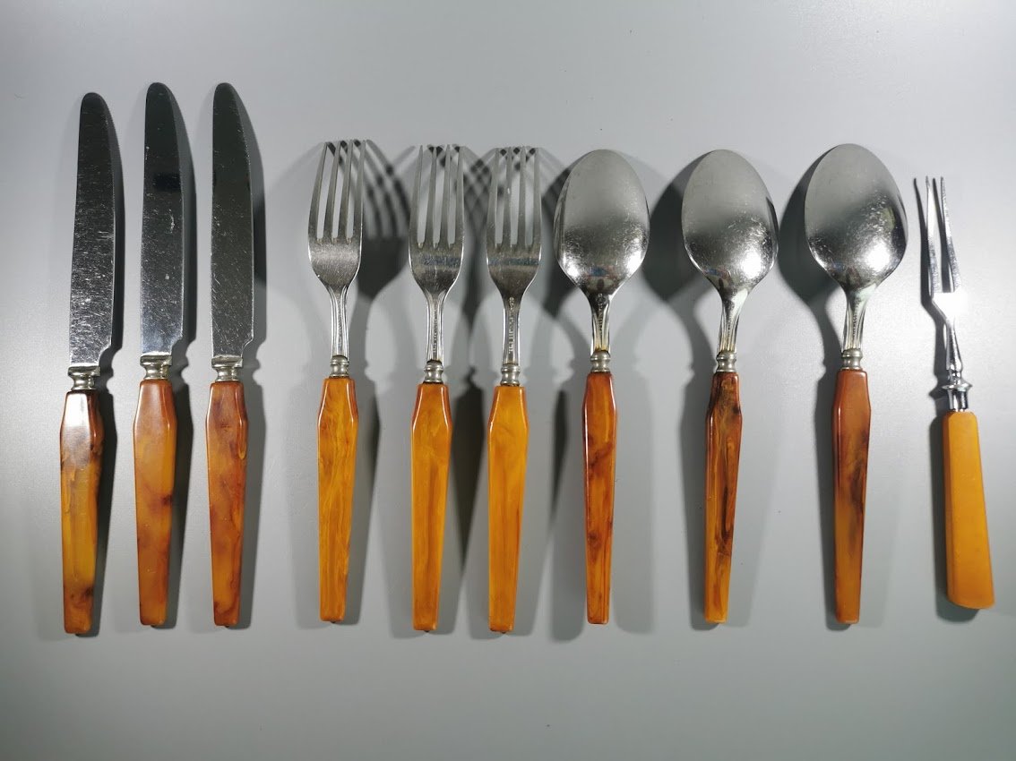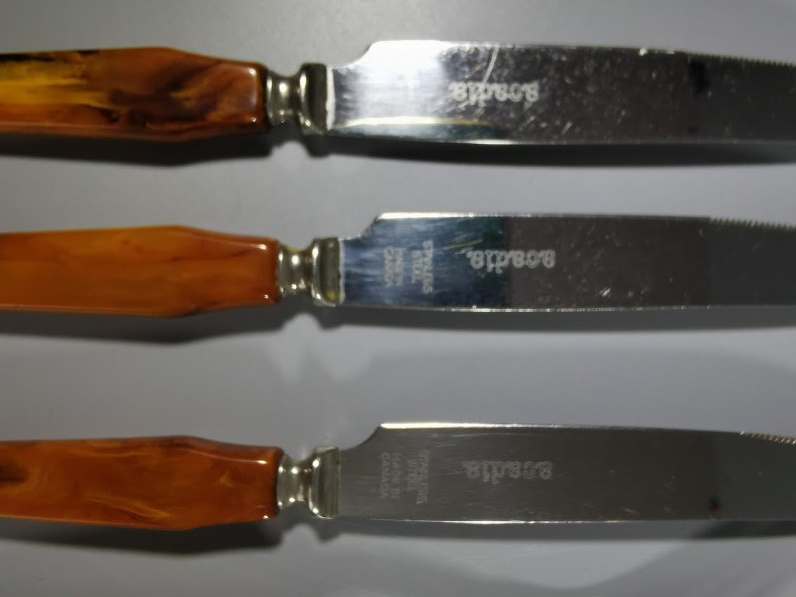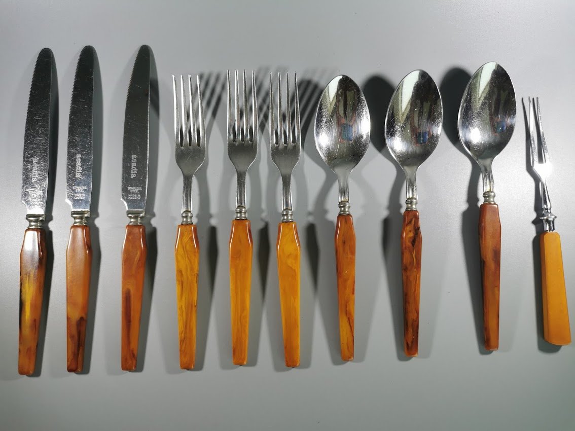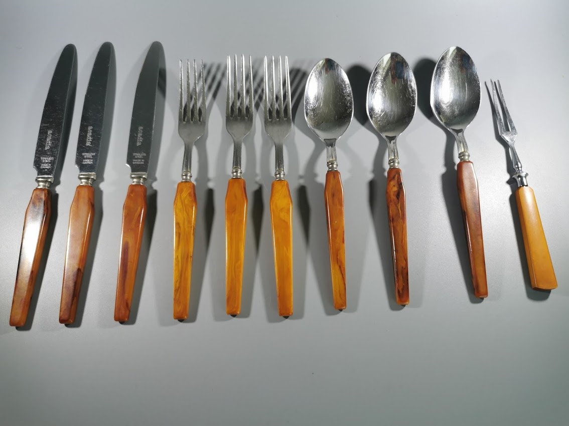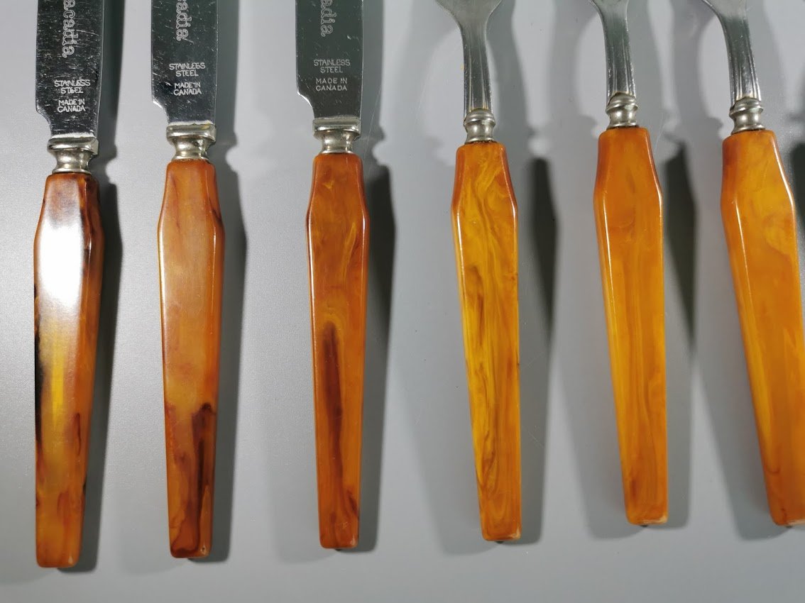 Stalo įrankių rinkinys bakelitinėmis rankenomis. Acadia Made in Canada. 10 vnt. Kaina 53 už visus.