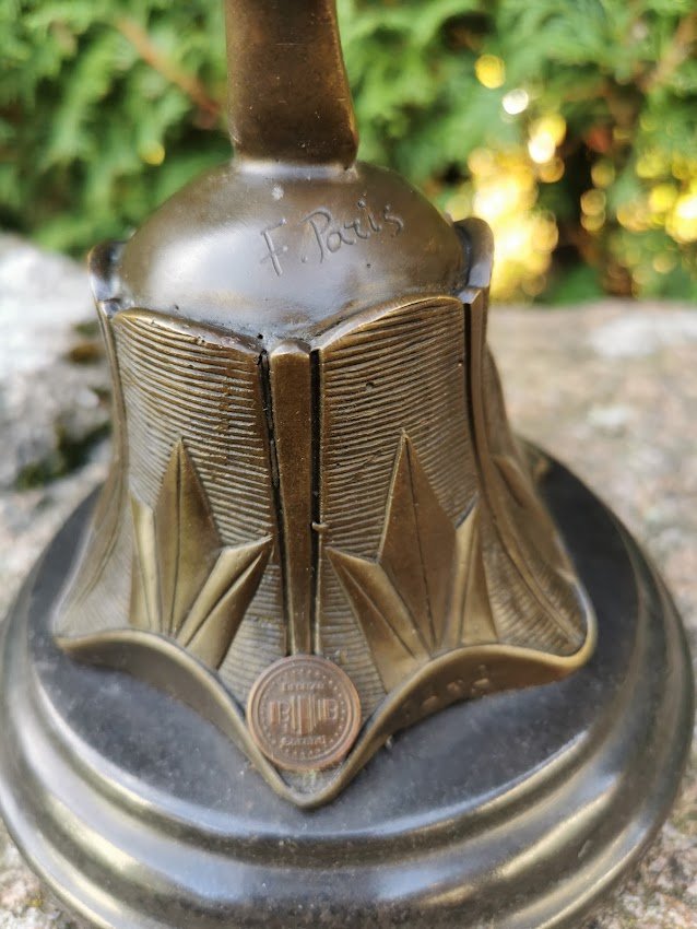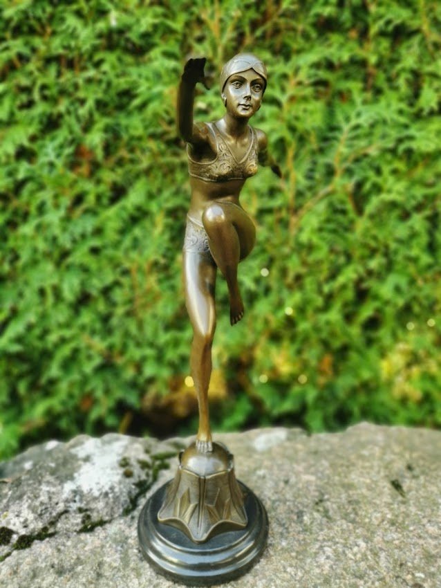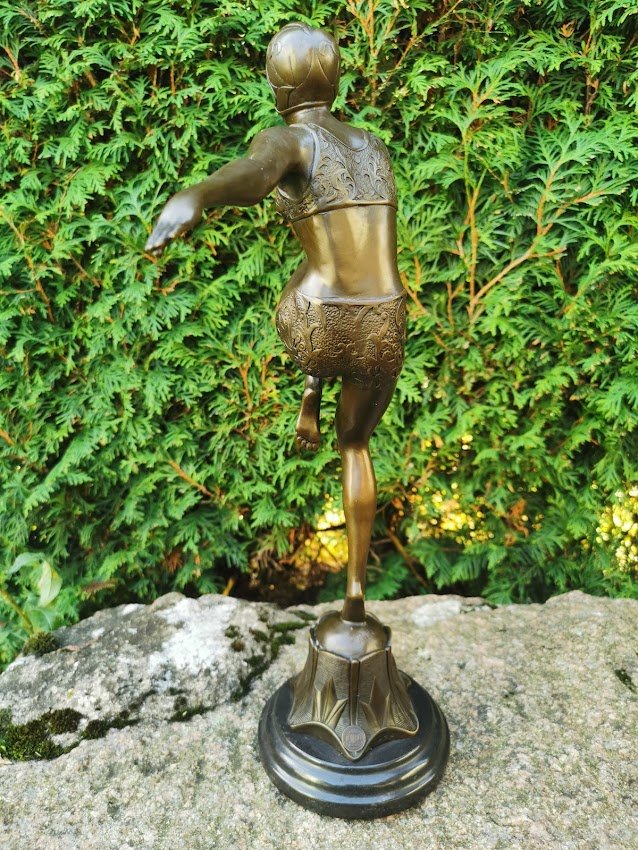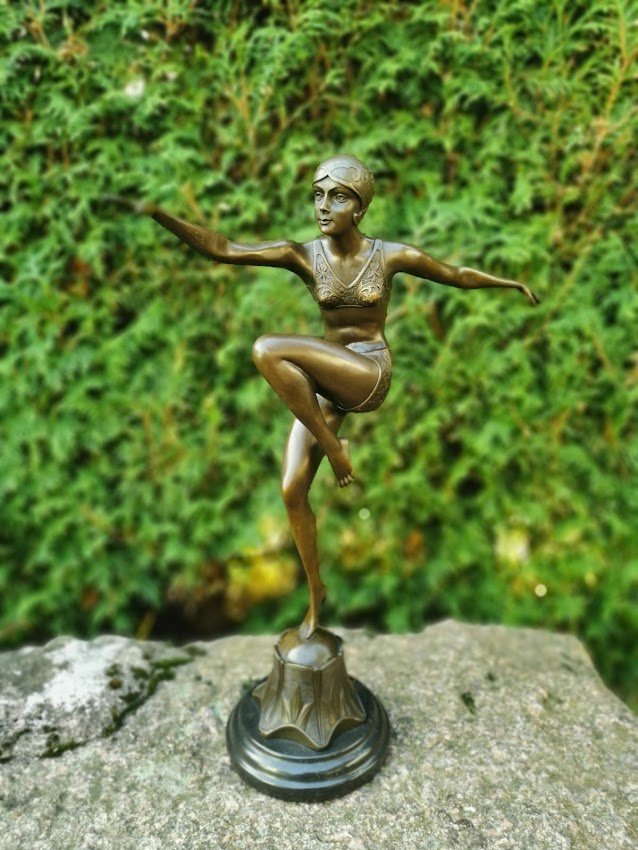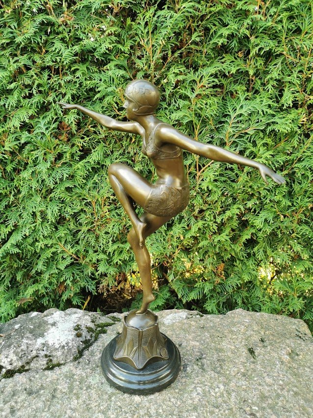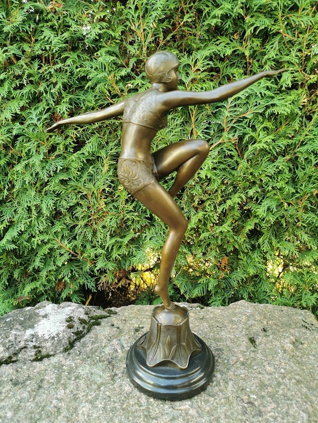 Statula bronzinė Art Deco Šokėja. 1925 m. Ferdinand Preiss „Con Brio” kopija pagaminta Prancūzijoje. Aukštis 47, plotis 35 cm. Svoris 3,5 kg. Kaina 288