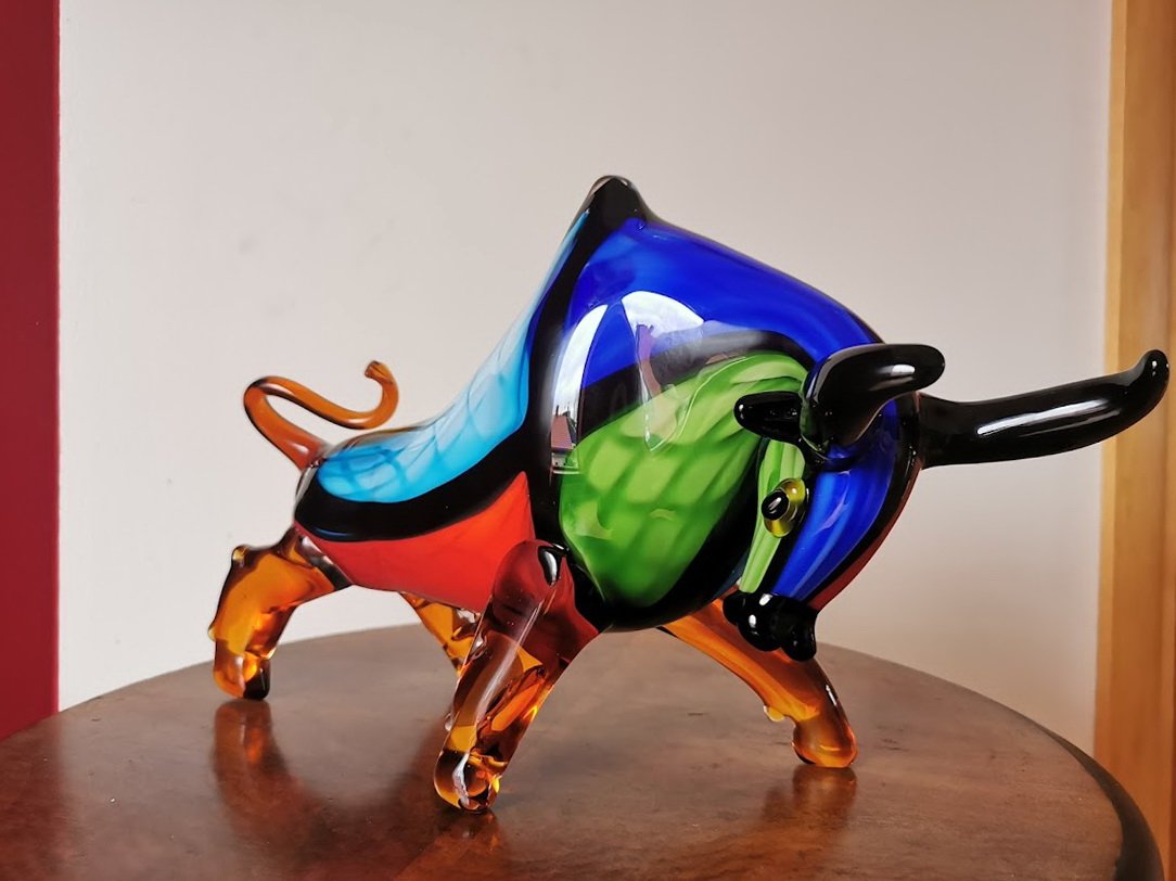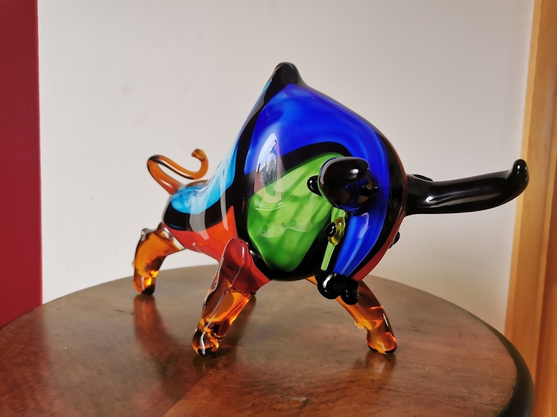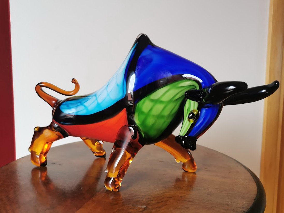Statula Jautis, bulius spalvoto stiklo, Murano stiliaus. Prancūzija. Svoris 4 kg. Ilgis 42, aukštis 23, plotis 10 cm. Kaina 228