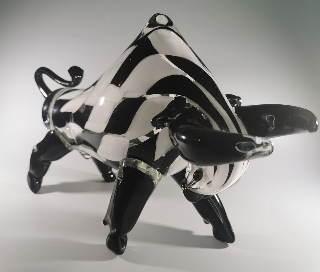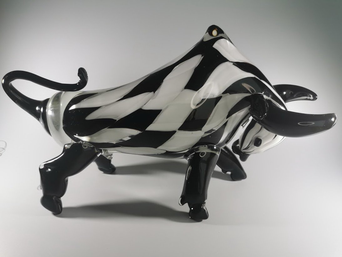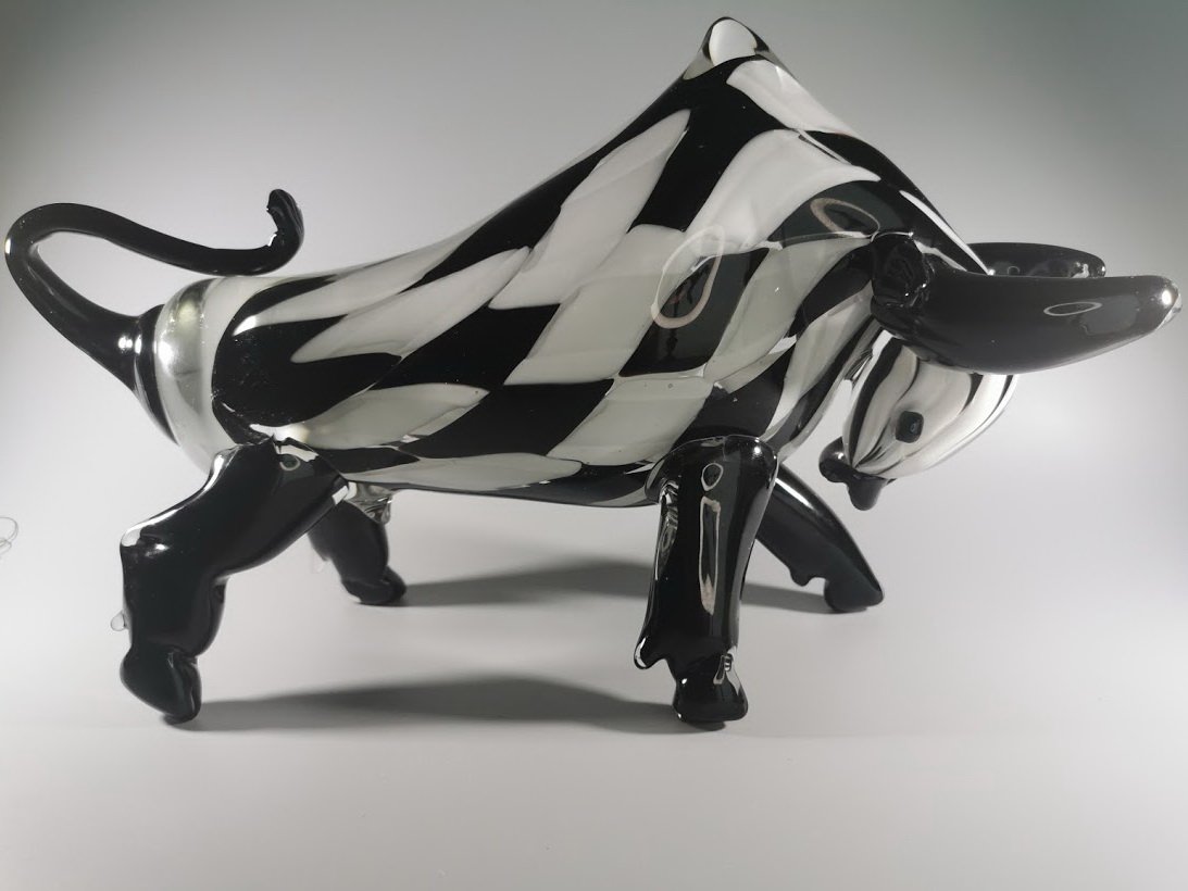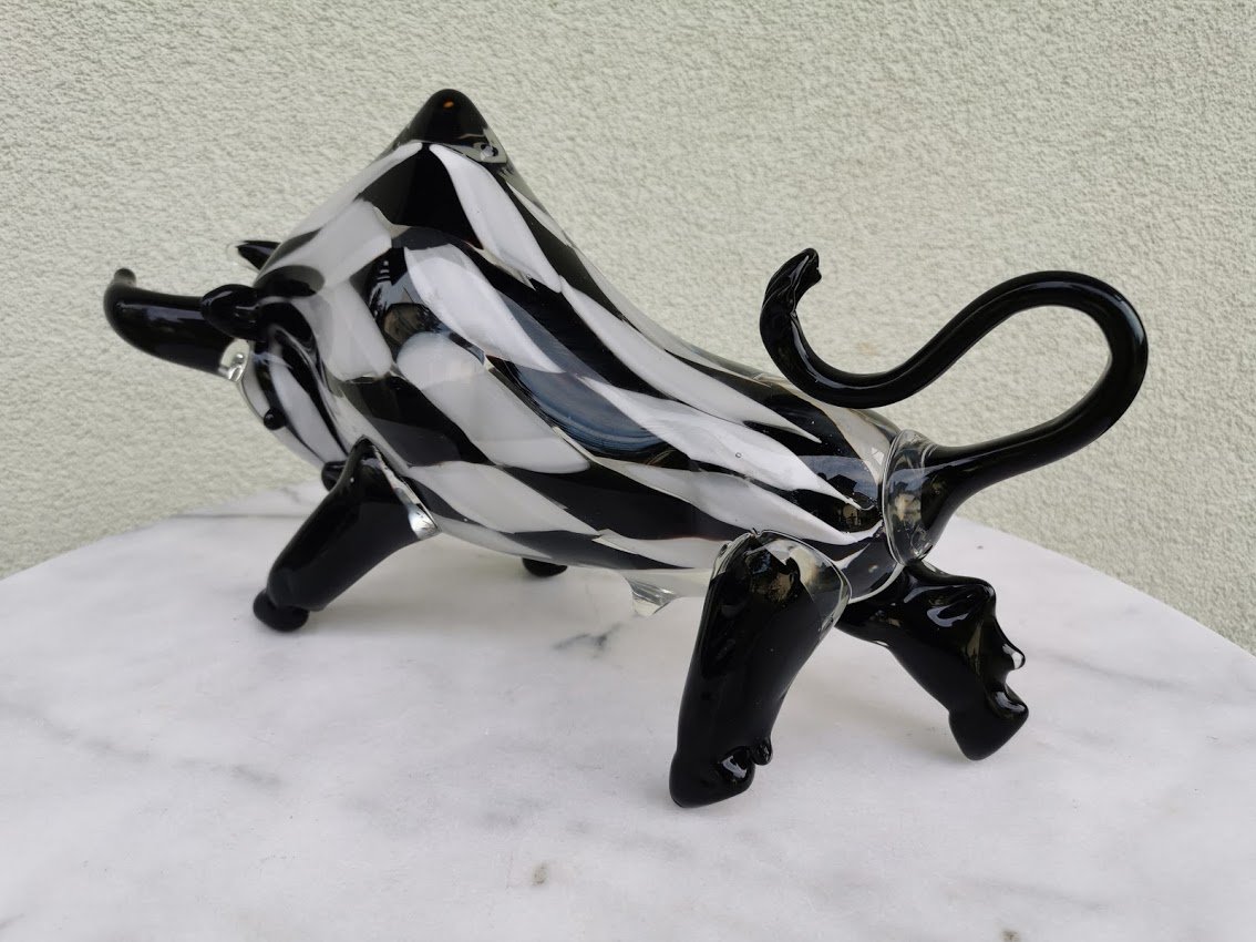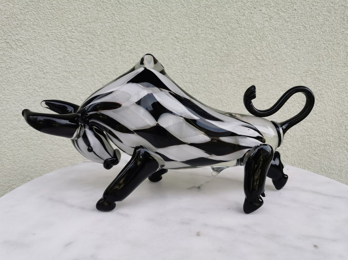 Statula Jautis, bulius spalvoto stiklo, Murano stiliaus. Prancūzija. Svoris 4 kg. Ilgis 42, aukštis 23, plotis 10 cm. Kaina 228