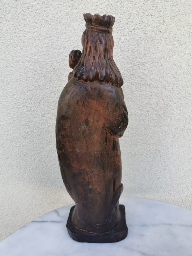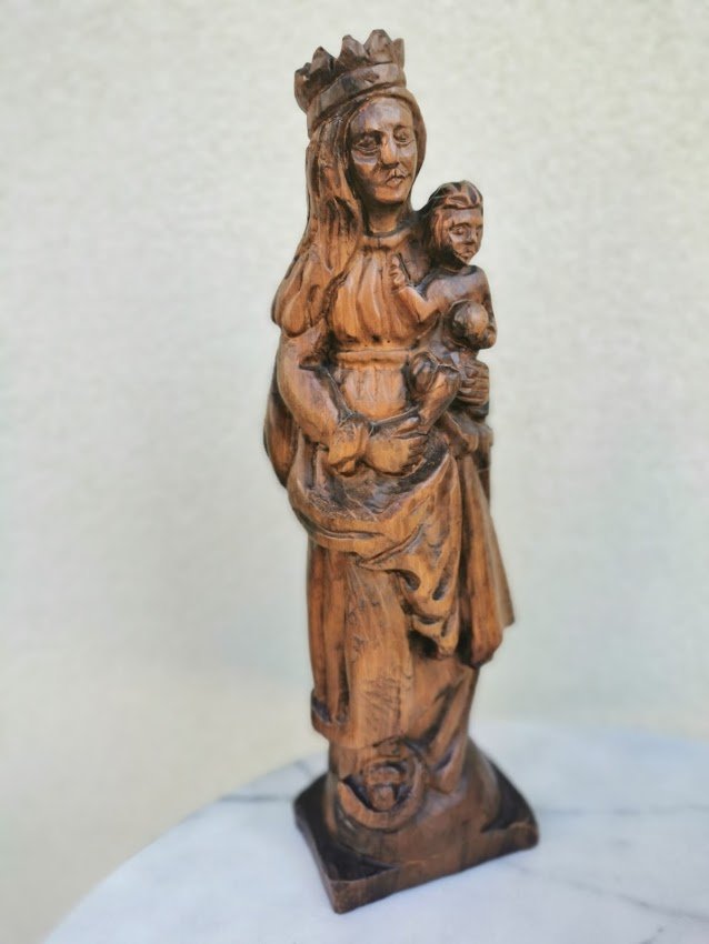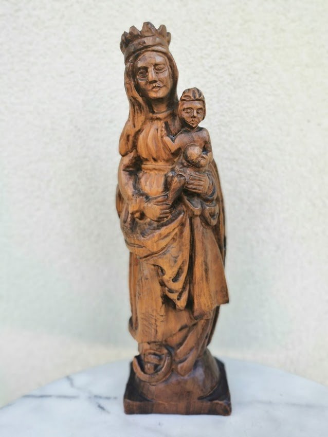 Statula medinė Šv. Marijos su kūdikėliu Jėzumi. Aukštis 43 cm. Pagrindo dydis: 9 x 13 cm. Kaina 88