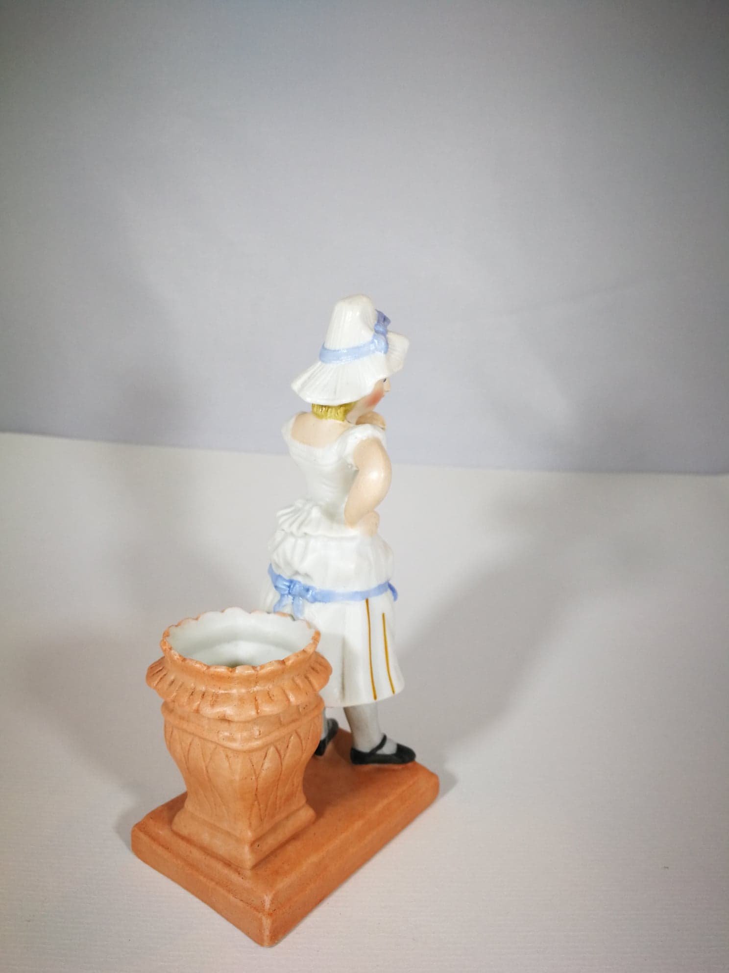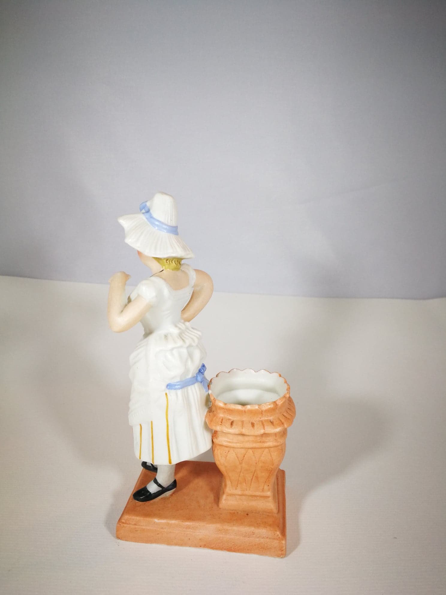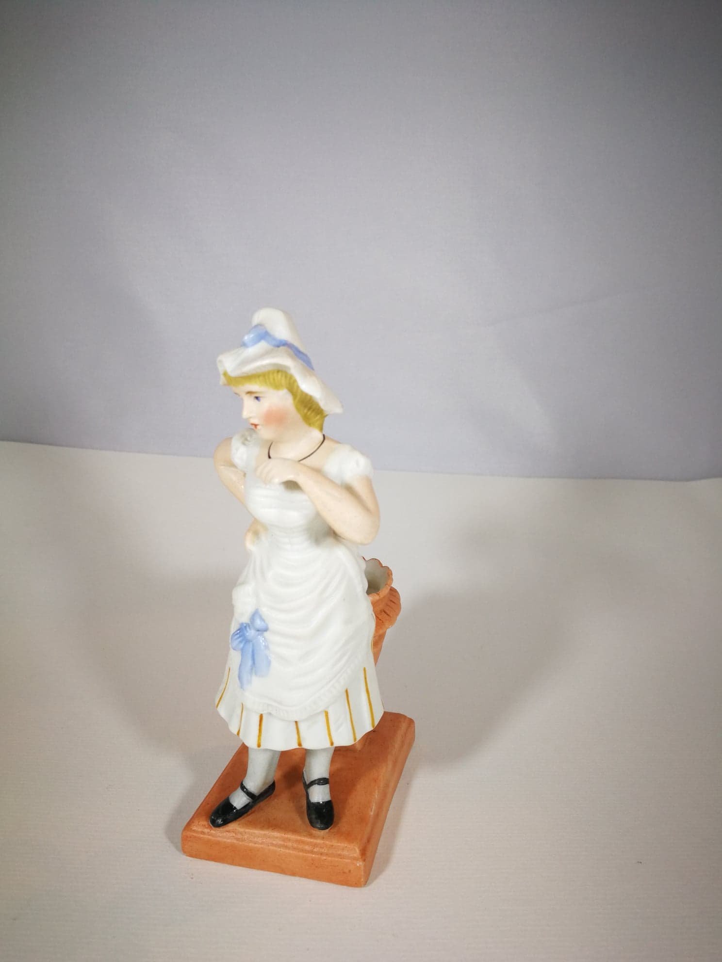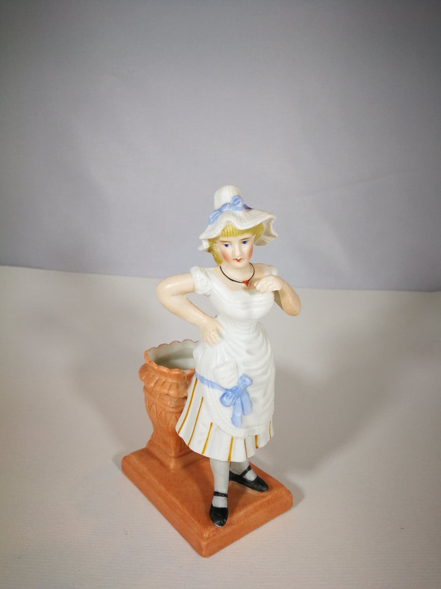 Antikvarinė biskvito statulėlė Moteris. Gali būti naudojama kaip maža vazelė ar pan. Aukštis 14 cm. Pagrindas: 7 x 5 cm. Kaina 18