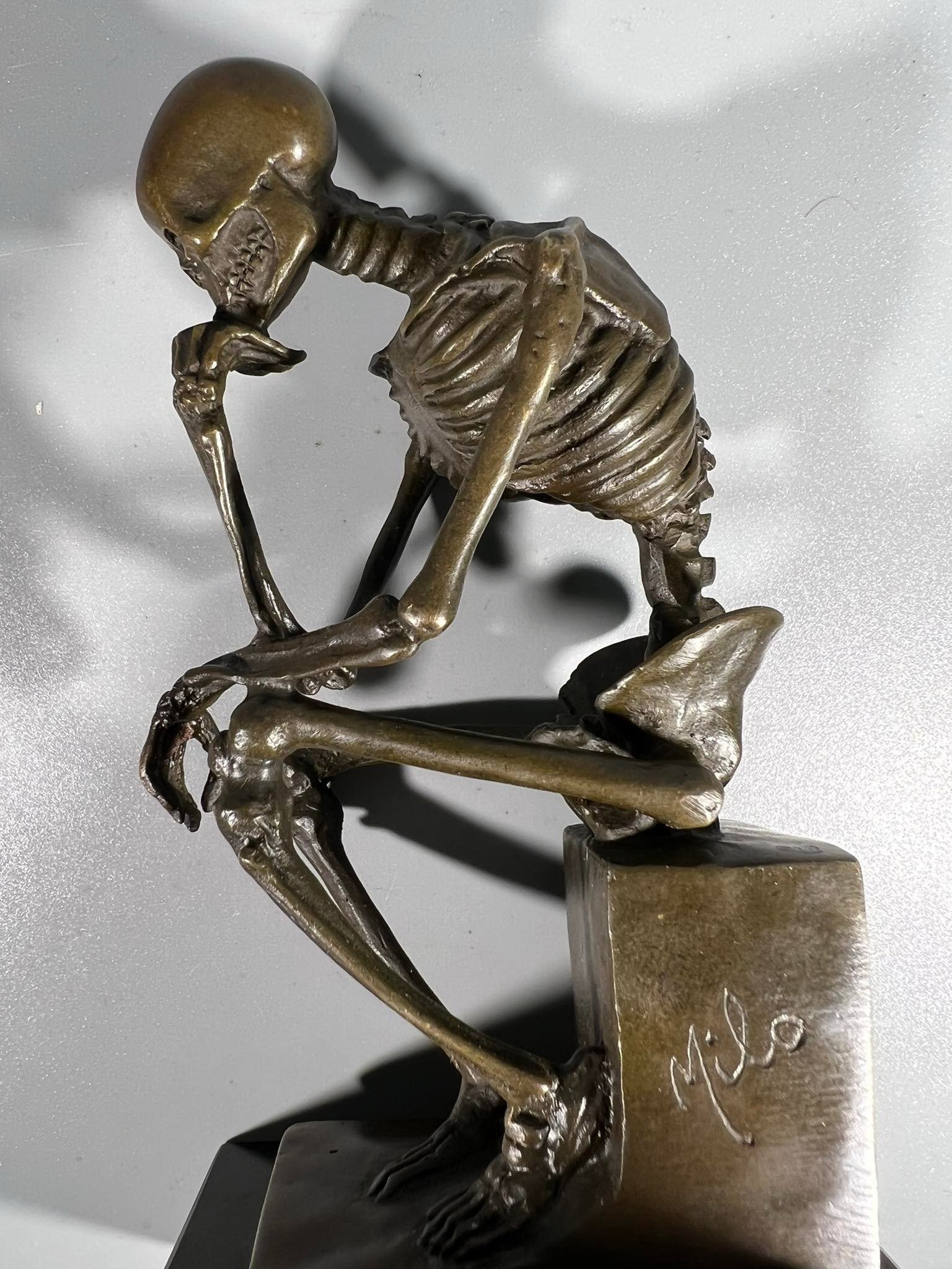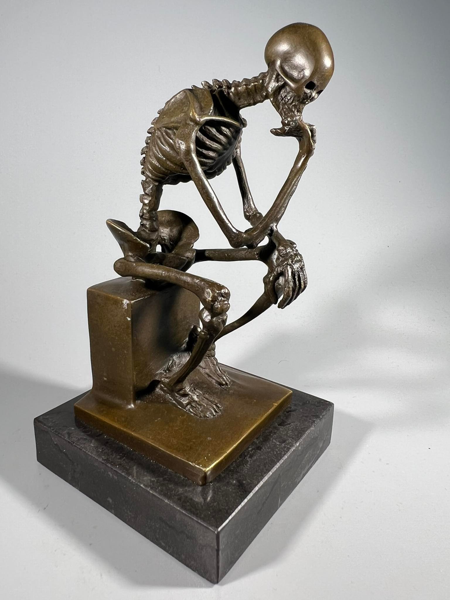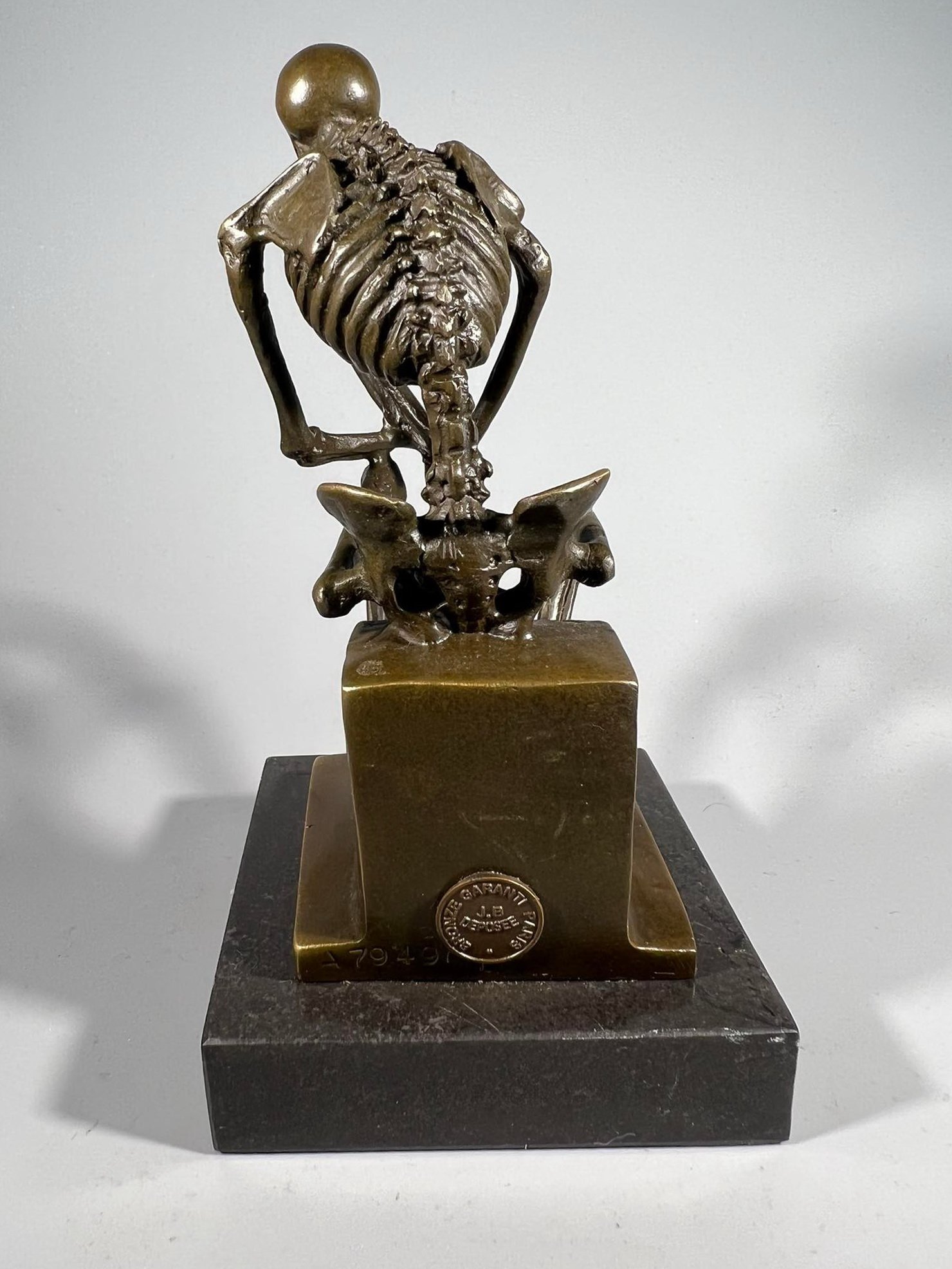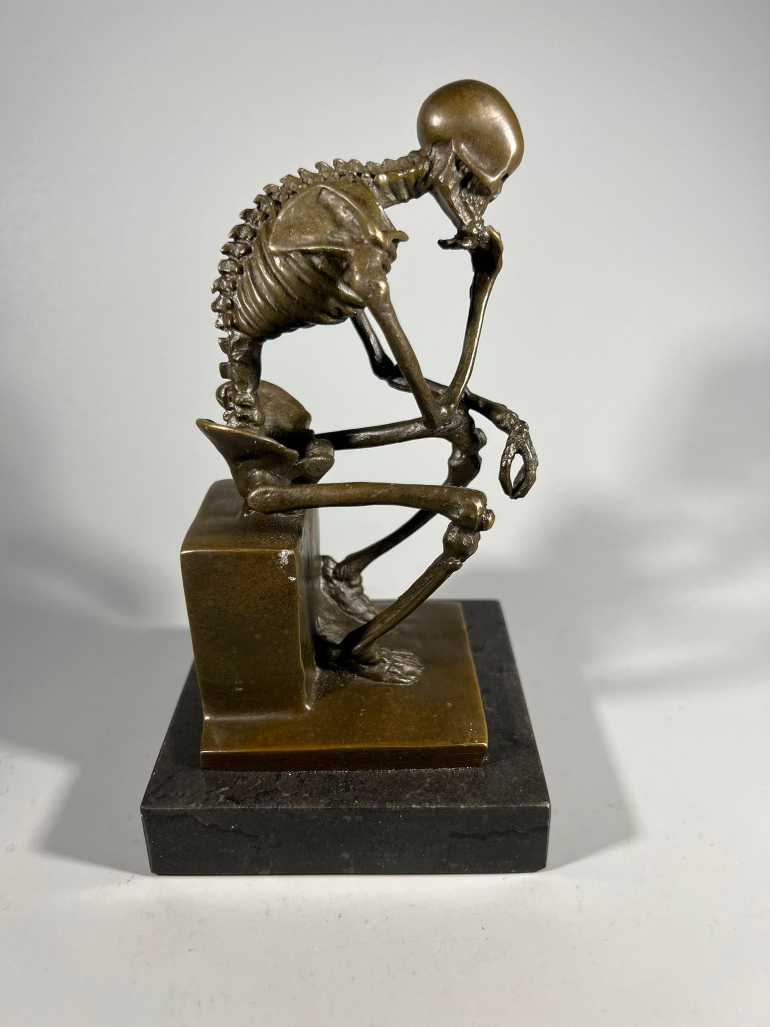 Statulėlė bronzinė Mąstytojo skeletas, pagal O. Rodeno skulptūrą Mąstytojas, autorius Max Milo austrų pokario ir šiuolaikinio laikotarpio skulptorius, gimęs 1938 m. Gamintojas Prancūzija. Patinuota bronza, marmuras, replika. Svoris 900 g. Aukštis 16, pagrindas: 8 x 8,5 cm. Kaina 187