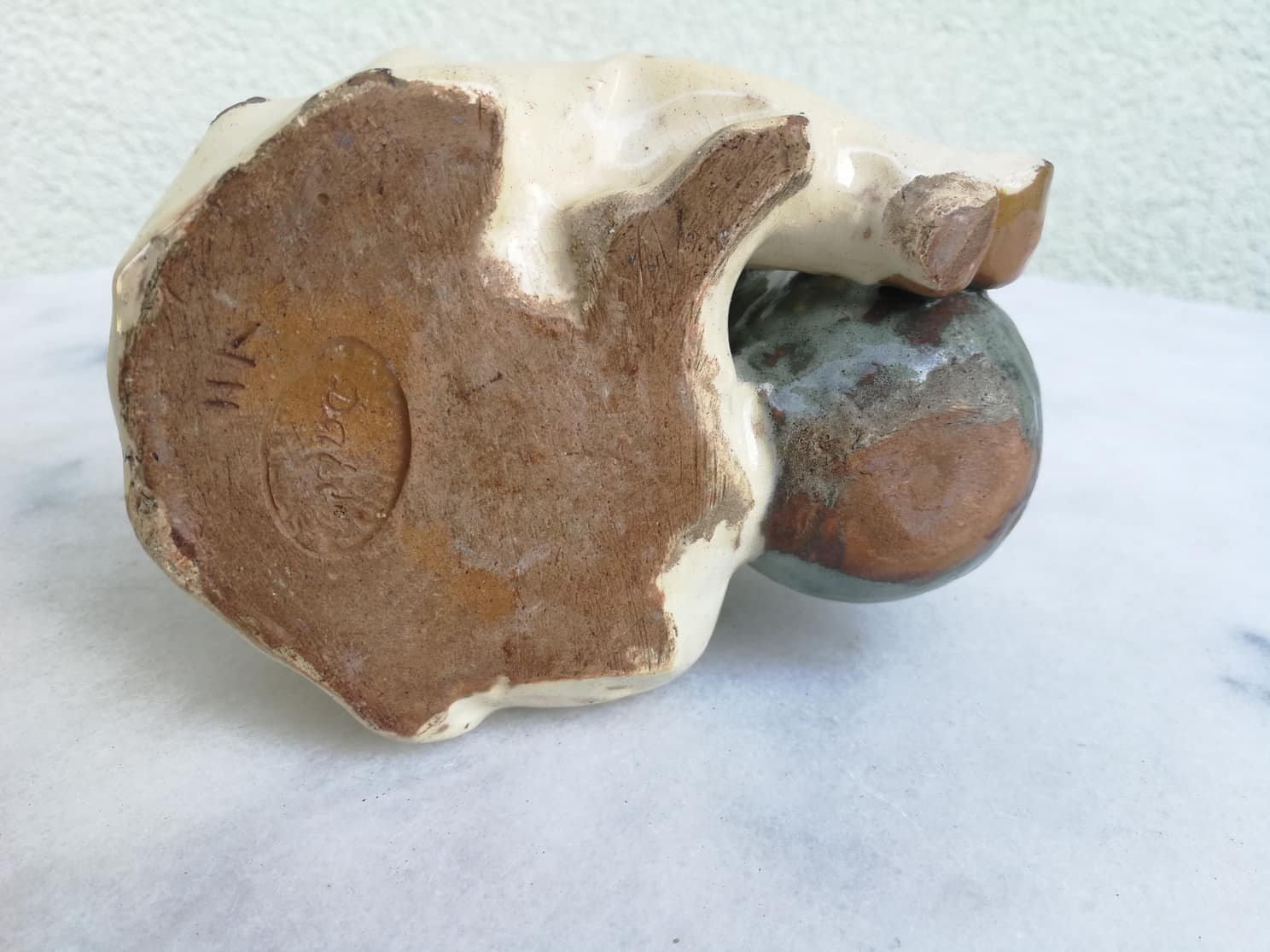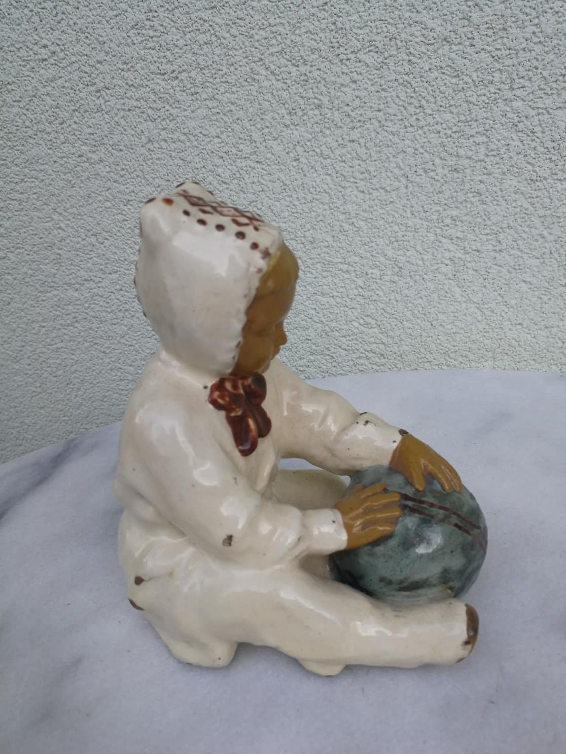 Statulėlė Kauno Dailės kombinato Berniukas su kamuoliu. Keramika, glazūra. Originalas. Aukštis 15, ilgis 12, plotis 8 cm. Kaina 187