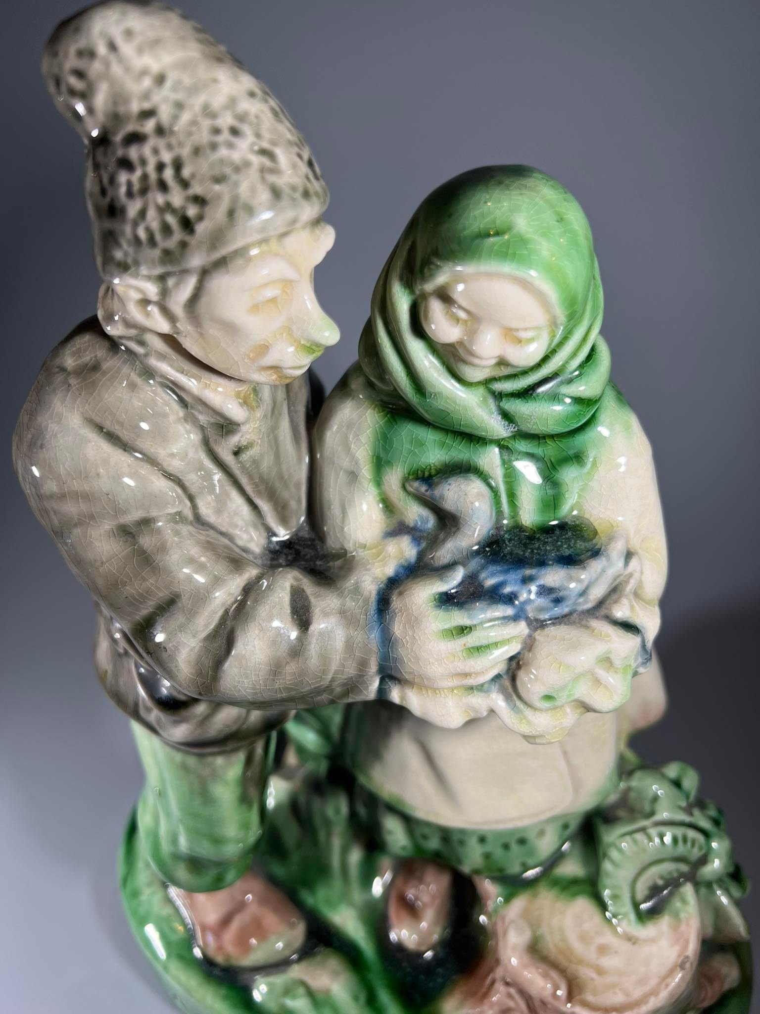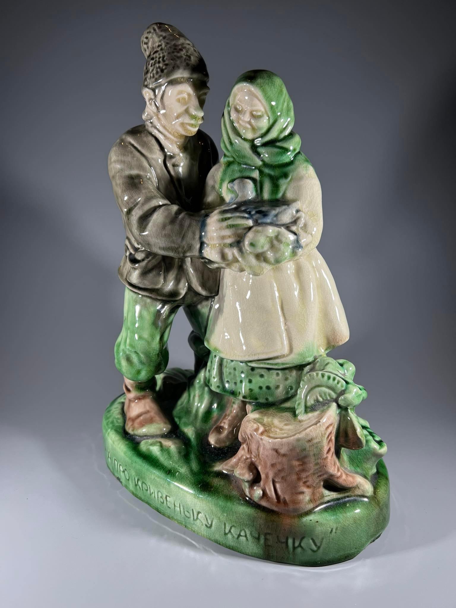 Statulėlė keraminė Pasaka. СКАЗКА ПРО КРИВЕНЬКУ КАЧЕЧКУ, tarybinių laikų. Aukstis 32, pagrindo dydis: 24 x 15 cm. Kaina 138