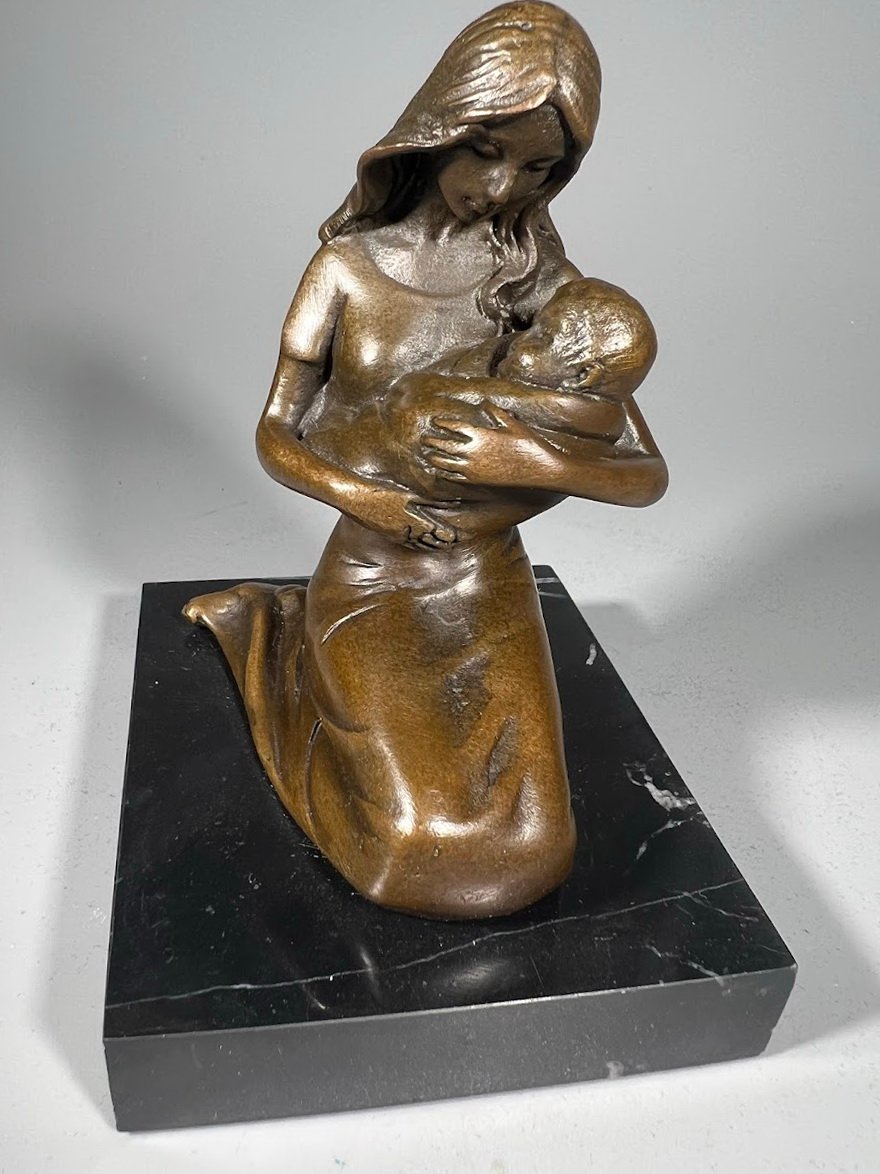 Ši statulėlė, tai dekoratyvinis interjero elementas, dovana Motinos dienos ar kūdikio gimimo proga. Skulptūros apačioje esančiame stačiakampiame ženkle, atrodo, yra įrašyta „L’ART BRONZE FRANCE“, o tai reiškia, kad tai yra Prancūzijos meno bronzos liejykla arba platinimo ženklas, o ne konkretaus menininko parašas. Tai rodo, kad skulptūra buvo pagaminta ir parduodama per šią įmonę. Ši liejykla yra žinoma kaip gamintoja arba platintoja, o ne pirminis menininkas-kūrėjas. Panašūs gaminiai dažnai parduodami be individualaus menininko vardo, kaip dekoratyviniai daiktai.